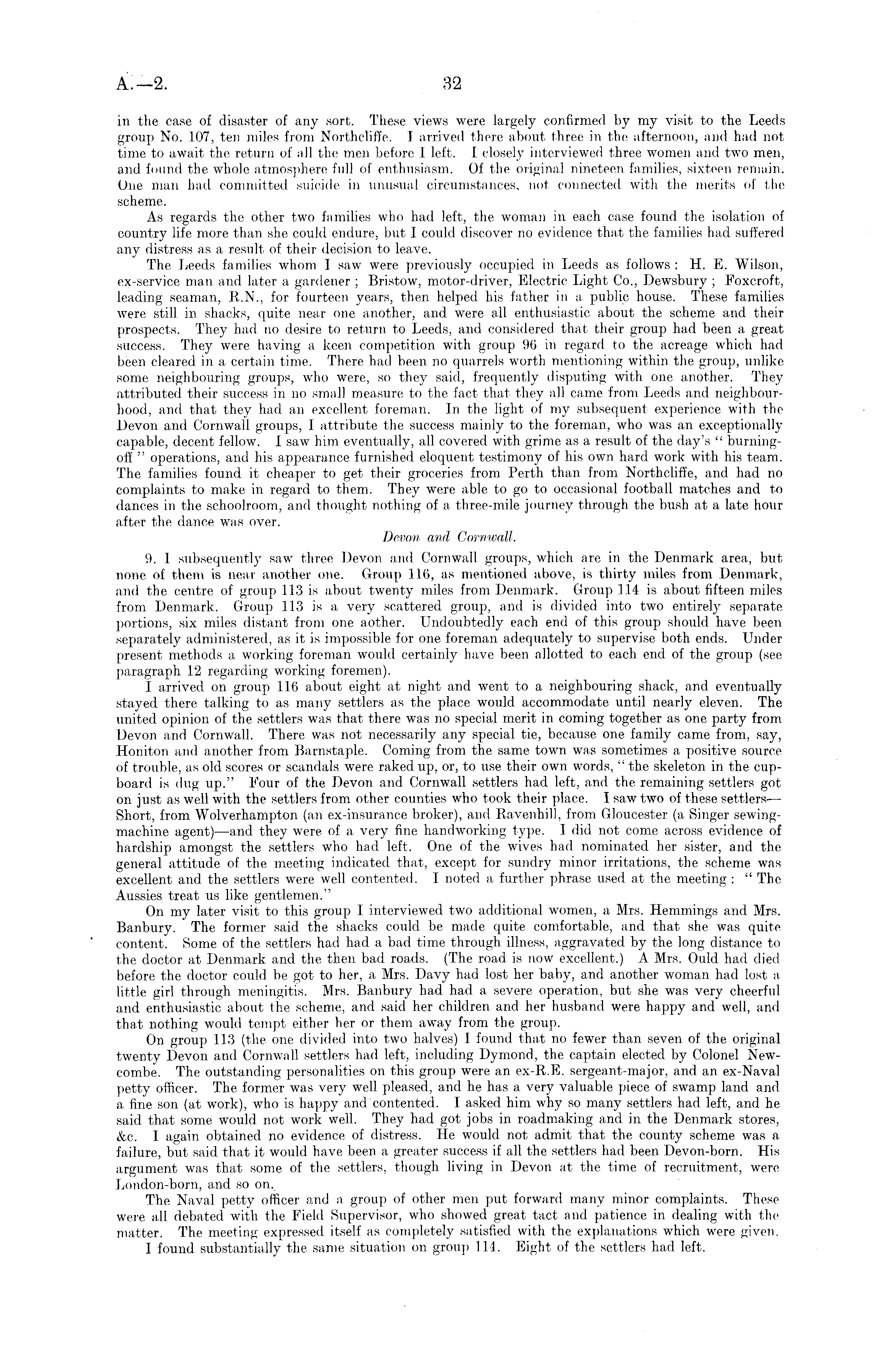 in the case of disaster of any sort. These views were largely confirmed by my visit- to the Leeds group No. 107, ten miles from Northcliffe. I arrived there about three in the afternoon, and had not time to await the return of all the men before I left. I closely interviewed three women and two men, and found the whole atmosphere full of enthusiasm. Of the original nineteen families, sixteen remain. One man had committed suicide in unusual circumstances, not connected with the merits of the scheme. As regards the other two families who had left, the woman in each case found the isolation of country life more than she could endure, but I could discover no evidence that the families had suffered any distress as a result of their decision to leave. The Leeds families whom I saw were previously occupied in Leeds as follows : H. E. Wilson, ex-service man and later a gardener ; Bristow, motor-driver, Electric Light Co., Dewsbury ; Foxcroft, leading seaman, R.N., for fourteen years, then helped his father in a public house. These families were still in shacks, quite near one another, and were all enthusiastic about the scheme and their prospects. They had no desire to return to Leeds, and considered that their group had been a great success. They were having a keen competition with group 96 in regard to the acreage which had been cleared in a certain time. There had been no quarrels worth mentioning within the group, unlike some neighbouring groups, who were, so they said, frequently disputing with one another. They attributed their success in no small measure to the fact that they all came from Leeds and neighbourhood, and that they had an excellent foreman. In the light of my subsequent experience with the Devon and Cornwall groups, I attribute the success mainly to the foreman, who was an exceptionally capable, decent fellow. I saw him eventually, all covered with grime as a result of the day's " burningoff " operations, and his appearance furnished eloquent testimony of his own hard work with his team. The families found it cheaper to get their groceries from Perth than from Northcliffe, and had no complaints to make in regard to them. They were able to go to occasional football matches and to dances in the schoolroom, and thought nothing of a three-mile journey through the bush at a late hour after the dance was over. Devon and Cornwall. 9. I subsequently saw three Devon and Cornwall groups, which are in the Denmark area, but none of them is near another one. Group 116, as mentioned above, is thirty miles from Denmark, and the centre of group 113 is about twenty miles from Denmark. Group 114 is about fifteen miles from Denmark. Group 113 is a very scattered group, and is divided into two entirely separate portions, six miles distant from one aother. Undoubtedly each end of this group should have been separately administered, as it is impossible for one foreman adequately to supervise both ends. Under present methods a working foreman would certainly have been allotted to each end of the group (see paragraph 12 regarding working foremen). I arrived on group 116 about eight at night and went to a neighbouring shack, and eventually stayed there talking to as many settlers as the place would accommodate until nearly eleven. The united opinion of the settlers was that there was no special merit in coming together as one party from Devon and Cornwall. There was not necessarily any special tie, because one family came from, say, Honiton and another from Barnstaple. Coming from the same town was sometimes a positive source of trouble, as old scores or scandals were raked up, or, to use their own words, " the skeleton in the cupboard is dug up." Four of the Devon and Cornwall settlers had left, and the remaining settlers got on just as well with the settlers from other counties who took their place. I saw two of these settlers- — Short, from Wolverhampton (an ex-insurance broker), and Ravenhill, from Gloucester (a Singer sewingmachine agent) —and they were of a very fine handworking type. I did not come across evidence of hardship amongst the settlers who had left. One of the wives had nominated her sister, and the general attitude of the meeting indicated that, except for sundry minor irritations, the scheme was excellent and the settlers were well contented. I noted a further phrase used at the meeting : " The Aussies treat us like gentlemen." On my later visit to this group I interviewed two additional women, a Mrs. Hemmings and Mrs. Banbury. The former said the shacks could be made quite comfortable, and that she was quite content. Some of the settlers had had a bad time through illness, aggravated by the long distance to the doctor at Denmark and the then bad roads. (The road is now excellent.) A Mrs. Ould had died before the doctor could be got to her, a Mrs. Davy had lost her baby, and another woman had lost a little girl through meningitis. Mrs. Banbury had had a severe operation, but she was very cheerful and enthusiastic about the scheme, and said her children and her husband were happy and well, and that nothing would tempt either her or them away from the group. On group 113 (the one divided into two halves) I found that no fewer than seven of the original twenty Devon and Cornwall settlers had left, including Dymond, the captain elected by Colonel Newcombe. The outstanding personalities on this group were an ex-R.R. sergeant-major, and an ex-Naval petty officer. The former was very well pleased, and he has a very valuable piece of swamp land and a fine son (at work), who is happy and contented. I asked him why so many settlers had left, and he said that some would not work well. They had got jobs in roadmaking and in the Denmark stores, &c. I again obtained no evidence of distress. He would not admit that the county scheme was a failure, but said that it would have been a greater success if all the settlers had been Devon-born. His argument was that some of the settlers, though liv