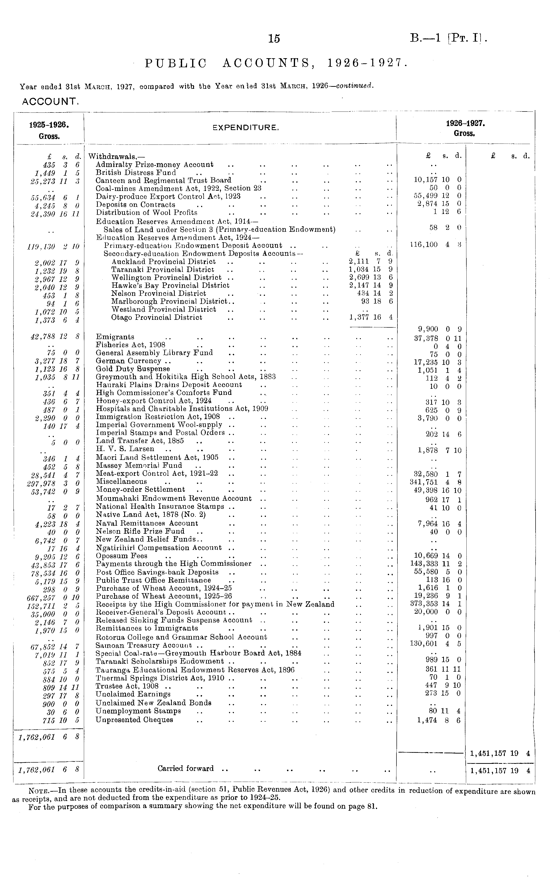 1925-1926. EXPENDITURE, 1926 1927, Gross. Gross< £ s. d. Withdrawals, — £ s. d. £ s. d. 435 3 6 Admiralty Prize-money Account 1,449 1 5 British Distress Fund 25,273 11 3 Canteen and Regimental Trust Board .. .. .. .. •• 10,157 10 0 Coal-mines Amendment Act, 1922, Section 23 .. .. .. 50 0 0 55,634 6 1 Dairy-produce Export Control Act, 1923 .. .. .. .. •• 55,499 12 0 4,245 8 0 Deposits on Contracts .. .. .. .. .. •• 2,874 15 0 24 390 16 11 Distribution of Wool Profits .. .. .. .. .. •• 1 12 6 Education Reserves Amendment Act, 1914— Sales of Land under Section 3 (Primary-education Endowment) .. .. 58 2 0 Education Reserves Amendment Aot, 1924 — 119,130 2 10 Primary-education Endowment Deposit Aocount .. .. .. 116,100 4 3 Secondary-education Endowment Deposits Aocounts— £ s. d. 2,002 17 9 Auckland Provincial District .. .. .. .. 2,111 7 9 1,232 19 8 Taranaki Provincial District .. .. .. .. 1,034 15 9 2 967 12 9 Wellington Provincial District .. .. .. .. 2,699 13 6 2 040 12 9 Hawke's Bay Provincial District .. .. .. 2,147 14 9 453 1 8 Nelson Provincial District .. .. .. .. 484 14 2 } g Marlborough Provincial District.. . .. .. 93 18 6 1 072 10 5 Westland Provincial District 1 373 6 4 Otago Provincial District .. .. .. .. 1,377 16 4 9,900 0 9 42,788 12 8 Emigrants .. .. .. .. .. .. .. .. 37,378 0 11 Eisheries Act, 1908 .. .. .. .. .. .. 040 75 0 0 General Assembly Library Fund .. .. .. .. .. .. 75 0 0 3,277 18 7 German Currency .. .. .. .. .. .. .. 17,235 10 3 1,123 16 8 Gold Duty Suspense .. .. .. .. .. .. .. 1,051 1 4 1,035 8 11 Greymouth and Hokitika High School Acts, 1883 .. .. .. 112 4 2 Hauraki Plains Drains Deposit Account .. .. .. .. 10 0 0 351 4 4 High Commissioner's Comforts Fund 436 6 7 Honey-export Control Aot, 1924 .. .. .. 317 10 3 487 0 1 Hospitals and Charitable Institutions Act, 1909 .. .. .. 625 0 9 2,290 0 0 Immigration Restriction Act, 1908 .. .. .. 3,790 0 0 140 17 4 Imperial Government Wool-supply Imperial Stamps and Postal Orders .. .. .. .. 202 14 6 jy i) 0 Land Transfer Aot, 1885 H. V. S. Larsen .. .. .. .. .. . 1,878 7 10 346 1 4 Maori Land Settlement Aot, 1905 452 5 8 Massey Memorial Fund 28,541 4 7 Meat-export Control Act, 1921-22 .. .. .. 32,580 1 7 297',978 3 0 Miscellaneous .. .. .. .. . .. 341,751 4 8 53'742 0 9 Money-order Settlement .. .. .. .. 49,398 16 10 Moumahaki Endowment Revenue Account .. .. .. .. .. 962 17 1 17 2 7 National Health Insurance Stamps .. .. .. .. 41 10 0 58 0 0 Native Land Act, 1878 (No. 2) 4,223 18 4 Naval Remittances Account .. .. .. .. 7,964 16 4 40 0 0 Nelson Rifle Prize Fund .. .. .. .. .. 40 0 0 6,742 0 7 New Zealand Relief Funds.. 17 16 4 Ngatirihiri Compensation Aocount 9,205 12 6 Opossum Fees .. .. .. .. .. .. 10,669 14 0 43,853 17 6 Payments through the High Commissioner .. .. .. .. 143,333 11 2 78,534 16 0 Post Office Savings-bank Deposits .. .. .. .. .. 55,580 5 0 5,179 15 9 Public Trust Office Remittance .. .. .. .. 113 16 0 298 0 9 Purchase of Wheat Account, 1924-25 .. .. .. .. .. 1,616 1 0 667,257 0 10 Purchase of Wheat Account, 1925-26 .. .. .. .. 19,236 9 1 152 711 2 5 Reoeipts by tlie High Commissioner for payment in New Zealand .. .. 373,353 14 1 35 000 0 0 Receiver-General's Deposit Account .. .. .. .. .. .. 20,000 0 0 2'146 7 0 Released Sinking Funds Suspense Account .. 1 970 15 0 Remittances to Immigrants .. .. .. .. .. .. 1,901 15 0 Rotorua College and Grammar Sohool Aocount .. .. .. .. 997 0 0 67,852 14 7 Samoan Treasury Account .. .. .. .. .. .. .. 130,601 4 5 7 019 11 1 Special Coal-rate—Greymouth Harbour Board Act, 1884 852 17 9 Taranaki Scholarships Endowment .. .. .. .. .. .. 989 15 0 575 5 4 Tauranga Educational Endowment Reserves Act, 1896 .. .. .. 361 11 11 884 10 0 Thermal Springs District Act, 1910 .. .. .. .. .. 70 1 0 809 14 11 Trustee Act, 1908 .. .. .. .. .. .. .. .. 447 9 10 297 17 8 Unclaimed Earnings .. .. .. .. .. .. .. 273 15 0 900 0 0 Unclaimed New Zealand Bonds 30 6 0 Unemployment Stamps .. .. .. .. .. .. 80 11 4 715 10 5 Unpresented Cheques .. .. .. .. .. .. .. 1,474 8 6 1,762,061 6 8 1,451,157 19 4 1,762,061 6 8 Carried forward .. .. .. .. .. .. .. 1,451,157 19 4 Note. —In these accounts the credits-in-aid (section 51, Public Revenues Act, 1926) and other credits in reduction of expenditure are shown as receipts, and are not deducted from the expenditure as prior to 1924-25. For the purposes of comparison a summary showing the net expenditure will be found on page 81.
