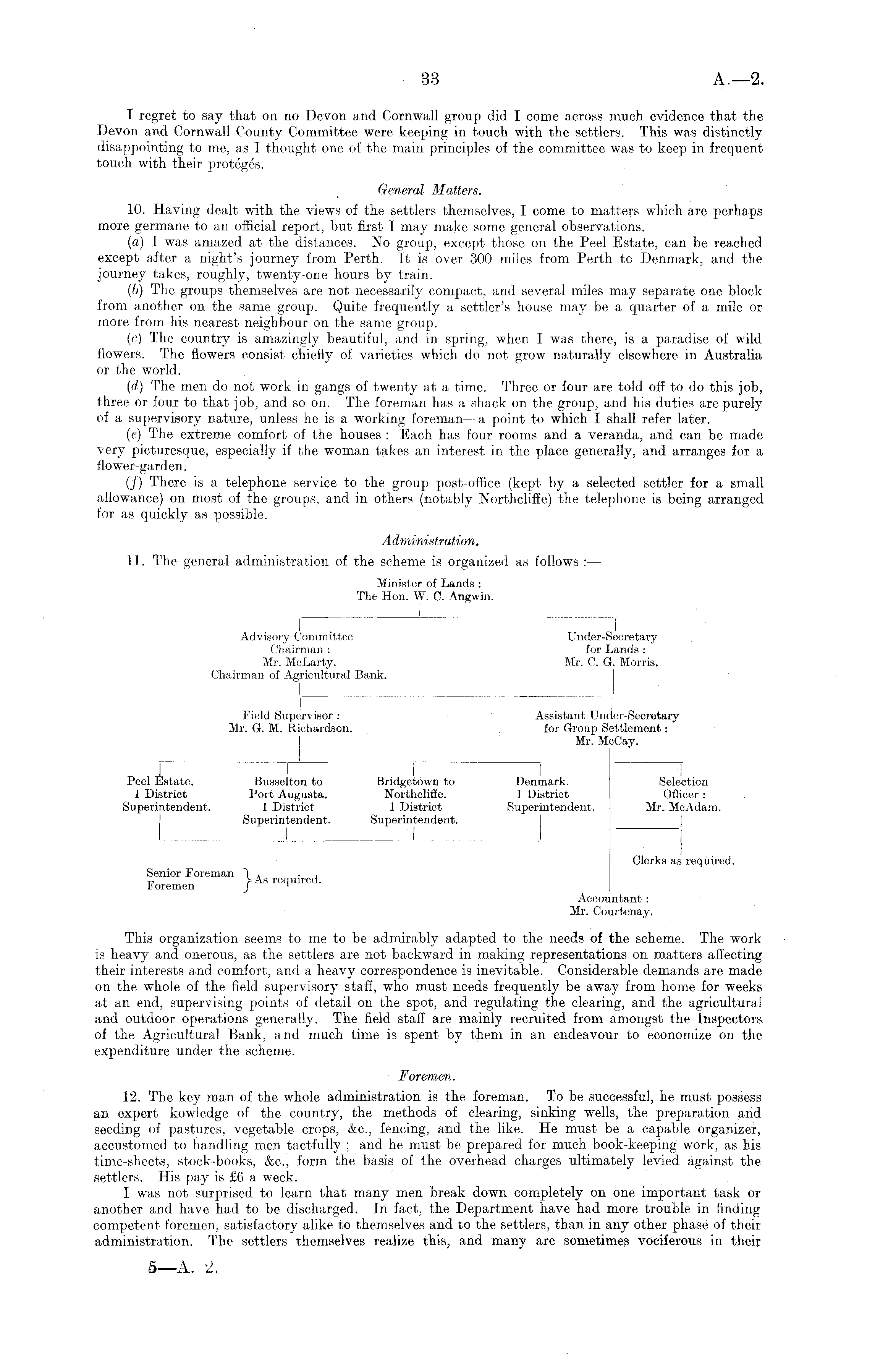 I regret to say that on no Devon and Cornwall group did I come across much evidence that the Devon and Cornwall County Committee were keeping in touch with the settlers. This was distinctly disappointing to me, as I thought one of the main principles of the committee was to keep in frequent touch with their proteges. General Matters. 10. Having dealt with the views of the settlers themselves, I come to matters which are perhaps more germane to an official report, but first I may make some general observations. (a) I was amazed at the distances. No group, except those on the Peel Estate, can be reached except after a night's journey from Perth. It is over 300 miles from Perth to Denmark, and the journey takes, roughly, twenty-one hours by train. (b) The groups themselves are not necessarily compact, and several miles may separate one block from another on the same group. Quite frequently a settler's house may be a quarter of a mile or more from his nearest neighbour on the same group. (c) The country is amazingly beautiful, and in spring, when I was there, is a paradise of wild flowers. The flowers consist chiefly of varieties which do not grow naturally elsewhere in Australia or the world. (d) The men do not work in gangs of twenty at a time. Three or four are told off to do this job, three or four to that job, and so on. The foreman has a shack on the group, and his duties are purely of a supervisory nature, unless he is a working foreman —a point to which I shall refer later. (e) The extreme comfort of the houses : Each has four rooms and a veranda, and can be made very picturesque, especially if the woman takes an interest in the place generally, and arranges for a flower-garden. (/) There is a telephone service to the group post-office (kept by a selected settler for a small allowance) on most of the groups, and in others (notably Northcliffe) the telephone is being arranged for as quickly as possible. Administration. 11. The general administration of the scheme is organized as follows : — Minister of Lands : The Hon. W. C. Angwin. I J Advisory Committee Under-Secretary Chairman : for Lands : Mr. McLarty. Mr. C. G. Morris. Chairman of Agricultural Bank. I ____ I I . _ ' J Field Supervisor : Assistant Under-Secretary Mr. G. M. Richardson. for Group Settlement: Mr. McCay. 1 I I I I i Peel Estate. Busselton to Bridgetown to Denmark. Selection 1 District Port Augusta. Northcliffe. 1 District Officer: Superintendent. 1 District 1 District Superintendent. Mr. McAdam. Superintendent. Superintendent. 1 ! ! , J ' I Clerks as required. Senior Foreman 1 A • j t-, >As required. Jb oremen J 1 Accountant : Mr. Courtenay. This organization seems to me to be admirably adapted to the needs of the scheme. The work is heavy and onerous, as the settlers are not backward in making representations on matters affecting their interests and comfort, and a heavy correspondence is inevitable. Considerable demands are made on the whole of the field supervisory staff, who must needs frequently be away from home for weeks at an end, supervising points of detail on the spot, and regulating the clearing, and the agricultural and outdoor operations generally. The field staff are mainly recruited from amongst the Inspectors of the Agricultural Bank, and much time is spent by them in an endeavour to economize on the expenditure under the scheme. Foremen. 12. The key man of the whole administration is the foreman. To be successful, he must possess an expert kowledge of the country, the methods of clearing, sinking wells, the preparation and seeding of pastures, vegetable crops, &c., fencing, and the like. He must be a capable organizer, accustomed to handling men tactfully ; and he must be prepared for much book-keeping work, as his time-sheets, stock-books, &c., form the basis of the overhead charges ultimately levied against the settlers. His pay is £6 a week. I was not surprised to learn that many men break down completely on one important task or another and have had to be discharged. In fact, the Department have had more trouble in finding competent foremen, satisfactory alike to themselves and to the settlers, than in any other phase of their administration. The settlers themselves realize this, and many are sometimes vociferous in their