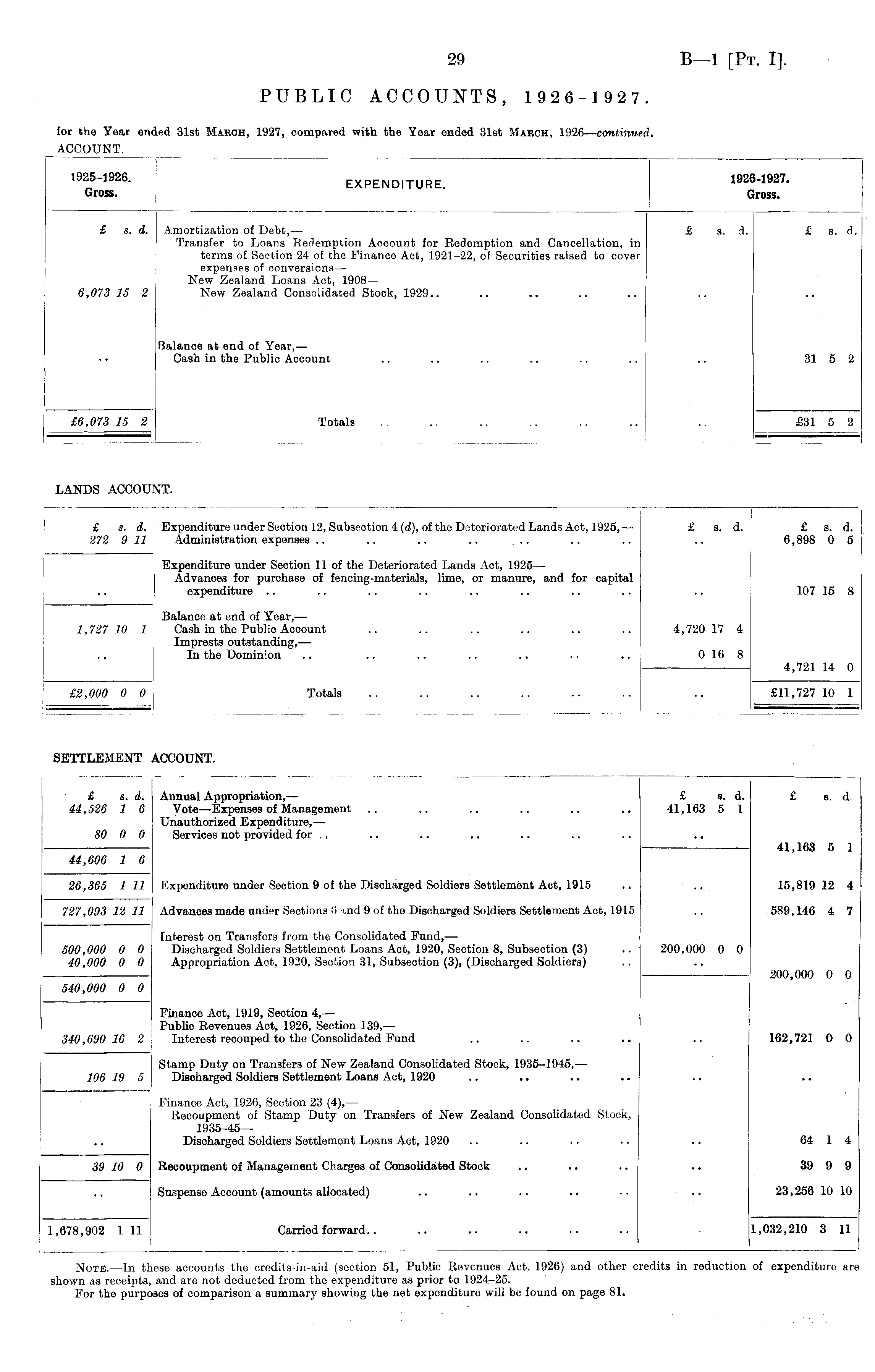 ACCOUNT. ms-im. expenditure. 1926-1927. Gross. Gross. £ 8. d. Amortization of Debt, — £ s. d. £ s. d. Transfer to Loans Redemption Account for Redemption and Cancellation, in terms of Section 24 of the Finance Act, 1921-22, of Securities raised to cover expenses of conversions— New Zealand Loans Act, 1908 — 6,073 15 2 New Zealand Consolidated Stock, 1929.. Balanoe at end of Year, — Cash in the Public Aocount .. .. .. .. .. .. .. 31 5 2 £6,073 15 2 Totals .'. .. .. .. .. .. . £31 5 2 LANDS ACCOUNT. £ s. d. Expenditure under Section 12, Subsection 4 (d), of the Deteriorated Lands Act, 1926, — £ s. d. £ s. d. 272 9 11 \ Administration expenses .. .. .. .. ... .. .. .. 6,898 0 5 — Expenditure under Section 11 of the Deteriorated Lands Act, 1925 — Advances for purohase of fencing-materials, lime, or manure, and for capital expenditure .. .. .. .. .. .. .. .. .. 107 15 8 Balanoe at end of Year, — 1,727 10 1 Cash in the Publio Account .. .. .. .. .. .. 4,720 17 4 Imprests outstanding,— In the Dominion .. .. .. .. .. .. .. 0 16 8 4,721 14 0 £2,000 0 0 Totals .. .. .. .. .. .. .. £11,727 10 1 SETTLEMENT ACCOUNT. £ 8. d. Annual Appropriation,— £ s. d. £ s. d 44,526 1 6 Vote —Expenses of Management .. .. .. .. .. .. 41,163 5 1 Unauthorized Expenditure,— 80 0 0 Services not provided for .. — 41,163 5 1 44,606 1 6 26,365 1 11 lixpenditure under Section 9 of the Discharged Soldiers Settlement Act, 1915 .. .. 15,819 12 4 727,093 12 11 Advances made under Sections 6 md 9 of the Discharged Soldiers Settlement Act, 1915 .. 589,146 4 7 Interest on Transfers from the Consolidated Fund, — 500,000 0 0 Discharged Soldiers Settlement Loans Act, 1920, Section 8, Subsection (3) .. 200,000 0 0 40,000 0 0 Appropriation Act, 1920, Section 31, Subsection (3), (Discharged Soldiers) — 200,000 0 0 540,000 0 0 Finance Act, 1919, Section 4, — Public Revenues Act, 1926, Section 139, — 340,690 16 2 Interest recouped to the Consolidated Fund .. .. .. .. .. 162,721 0 0 Stamp Duty on Transfers of New Zealand Consolidated Stock, 1935-1945, — 106 19 5 Discharged Soldiers Settlement Loans Act, 1920 Finance Act, 1926, Section 23 (4), — Recoupment of Stamp Duty on Transfers of New Zealand Consolidated Stock, 1935-45— Discharged Soldiers Settlement Loans Act, 1920 .. .. .. .. .. 64 1 4 39 10 0 Recoupment of Management Charges of Consolidated Stock .. .. .. .. 39 9 9 Suspense Account (amounts allocated) .. .. .. .. .. .. 23,256 10 10 1,678,902 1 11 Carried forward.. .. .. .. .. .. 1,032,210 3 11 Note.—In these accounts the credits-in-aid (section 51, Public Revenues Act, 1926) and other credits in reduction of expenditure are shown as receipts, and are not deducted from the expenditure as prior to 1924-25. For the purposes of comparison a summary showing the net expenditure will be found on page 81.