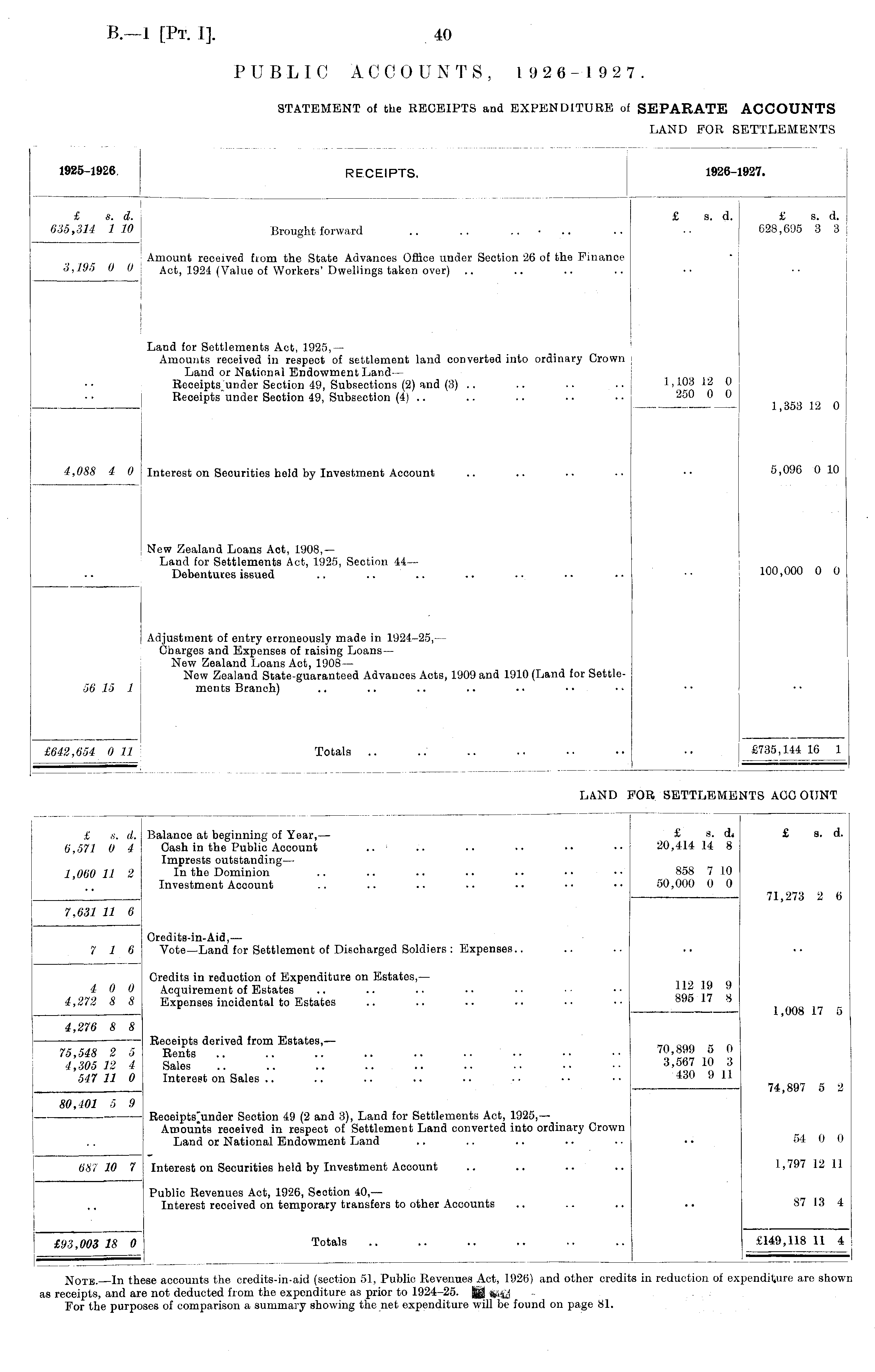 LAND FOR SETTLEMENTS 1925-1926. RECEIPTS. 1926-1927. £ s. d. £ s. d. £ s. d. 635,314 1 10 Brought forward .. .. .. . • •• 628,695 3 3 Amount received from the State Advances Office under Section '26 of the Finance 3,195 0 0 Act, 1921 (Value of Workers'Dwellings taken over) Land for Settlements Act, 1925, — Amounts received in respect of settlement land converted into ordinary Crown Land or National Endowment Land— Reoeipts_under Section 49, Subsections (2) and (3) .. .. .. .. 1,103 12 0 Receipts under Seotion 49, Subsection (4) .. .. .. .. .. 250 0 0 v v 1,353 12 0 4,088 4 0 Interest on Securities held by Investment Account .. .. .. .. 5,096 0 10 New Zealand Loans Aot, 1908, — Land for Settlements Act, 1925, Section 44— Debentures issued .. .. .. .. .. •• •• •• 100,000 0 0 Adjustment of entry erroneously made in 1924-25, — Charges and Expenses of raising LoansNew Zealand Loans Aot, 1908 — New Zealand State-guaranteed Advanoes Acts, 1909 and 1910 (Land for Settle56 15 1 ments Branch) £642,654 0 11 Totals .. .. .. .. •• •• •• £735,144 16 1 LAND FOR SETTLEMENTS ACCOUNT £ s. d. Balanoe at beginning of Year, — £ s. da £ s. d. 6,571 0 4 Cash in the Public Account .. .. .. •• •• •• 20,414 14 8 Imprests outstanding— 1,060 11 2 In the Dominion ... .. .. .. .. •• 858 7 10 Investment Account .. .. .. .. •• •• •• 50,000 0 0 71,273 2 6 7,631 11 6 Credits-in-Aid, — 7 16 Vote—Land for Settlement of Discharged Soldiers : Expenses.. Credits in reduction of Expenditure on Estates, — 4 0 0 Acquirement of Estates .. .. .. • • • • • • • • J"; j; 4,272 8 8 Expenses incidental to Estates .. .. -• •• ® " — 1,008 17 5 4,276 8 8 Receipts derived from Estates, — _ _ 75,548 2 5 Rents 70,899 5 0 4,305 12 4 Sales .. .. .. .. .. .. •• •• 3,567 10 3 547 11 0 Interest on Sales .. .. .. .. .. •• •• •• 9 11 — 74,897 5 2 80,401 5 9 ——— Reoeiptsjinder Seotion 49 (2 and 3), Land for Settlements Act, 1925, — _ Amounts received in respect of Settlement Land converted into ordinary Crown Land or National Endowment Land .. .. .. •. • • • • 54 0 0 687 10 7 Interest on Securities held by Investment Account .. .. .. .. 1,797 12 11 Public Revenues Act, 1926, Seotion 40, — Interest received on temporary transfers to other Accounts .. .. .. .. 87 13 4 £93,003 18 0 Totals .. .. .. .. .. .. £149,118 11 4 _ 1 Nora. —In these accounts the credits-in-aid (section 51, Public Revenues Act, 1926) and other credits in reduction of expenditure are shown as receipts, and are not deducted from the expenditure as prior to 1924-25. ||g tte&l For the purposes of comparison a summary showing the net expenditure will be found on page 81.