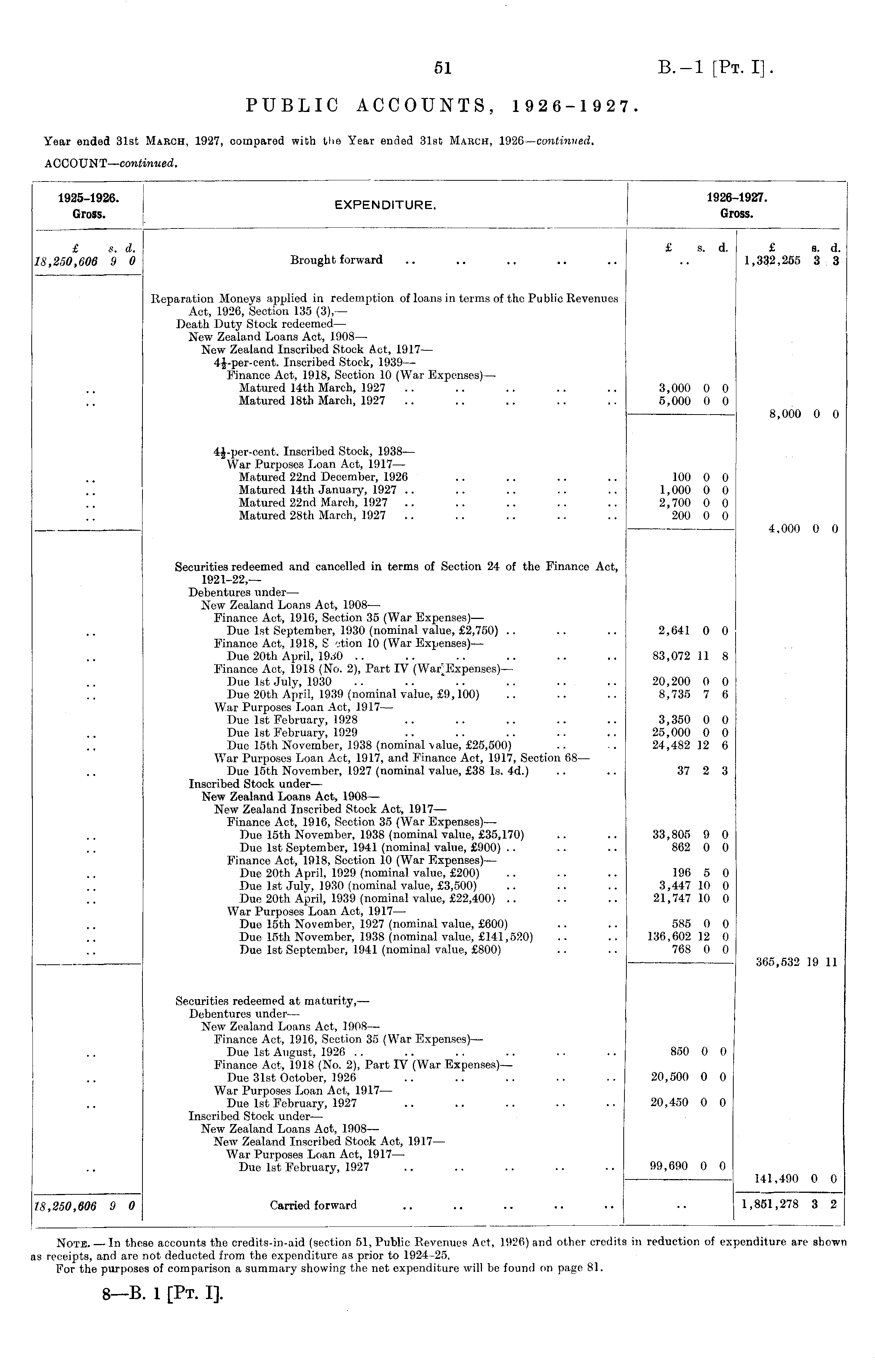 19 25-1926. EXPENDITURE. 1927 " Gross. Gross. £ s. d. £ s. d. £ a. d. 18,250,606 9 0 Brought forward .. .. .. .. .. .. 1,332,265 3 3 Reparation Moneys applied in redemption of loans in terms of the Public Revenues Act, 1926, Section 135 (3), — Death Duty Stock redeemed — New Zealand Loans Act, 1908 — New Zealand Inscribed Stock Act, 1917 — 4J-per-eent. Inscribed Stock, 1939— Finance Act, 1918, Section 10 (War Expenses)— Matured 14th March, 1927 .. .. .. .. .. 3,000 0 0 Matured 18th March, 1927 .. .. .. .. .. 5,000 0 0 8,000 0 0 4J-per-cent. Inscribed Stock, 1938 — War Purposes Loan Act, 1917— Matured 22nd December, 1926 .. .. .. .. 100 0 0 Matured 14th January, 1927 .. .. .. .. .. 1,000 0 0 Matured 22nd March, 1927 .. .. .. .. .. 2,700 0 0 Matured 28th March, 1927 .. .. .. .. .. 200 0 0 4,000 0 0 Securities redeemed and cancelled in terms of Section 24 of the Finance Act, 1921-22,— Debentures under — New Zealand Loans Act, 1908 — Finance Act, 1916, Section 35 (War Expenses)— Due 1st September, 1930 (nominal value, £2,750) .. .. .. 2,641 0 0 Finance Act, 1918, S ction 10 (War Expenses)— Due 20th April, .. .. .. .. .. .. 83,072 11 8 Finance Act, 1918 (No. 2), Part IV (War Expenses)— Due 1st July, 1930 .. .. .. .. .. .. 20,200 0 0 Due 20th April, 1939 (nominal value, £9,100) .. .. .. 8,735 7 6 War Purposes Loan Act, 1917 — Due 1st February, 1928 .. .. .. .. .. 3,350 0 0 Due 1st February, 1929 .. .. .. .. .. 25,000 0 0 Due 15th November, 1938 (nominal value, £25,500) .. . 24,482 12 6 War Purposes Loan Act, 1917, and Finance Act, 1917, Section 68— Due 15th November, 1927 (nominal value, £38 Is. 4d.) .. .. 37 2 3 Inscribed Stock under— New Zealand Loans Act, 1908 — New Zealand Inscribed Stock Act, 1917— Finance Act, 1916, Section 35 (War Expenses)— Due 15th November, 1938 (nominal value, £35,170) .. .. 33,805 9 0 Due 1st September, 1941 (nominal value, £900) .. .. .. 862 0 0 Finance Act, 1918, Scction 10 (War Expenses)— Due 20th April, 1929 (nominal value, £200) .. .. .. 196 5 0 Due 1st July, 1930 (nominal value, £3,500) .. .. .. 3,447 10 0 Due 20th April, 1939 (nominal value, £22,400) .. .. .. 21,747 10 0 War Purposes Loan Act, 1917— Due 15th November, 1927 (nominal value, £600) .. .. 585 0 0 Due 15th November, 1938 (nominal value, £141,520) .. .. 136,602 12 0 Due 1st September, 1941 (nominal value, £800) .. .. 768 0 0 365,532 19 11 Securities redeemed at maturity,— Debentures under — New Zealand Loans Act, 1908— Finance Act, 1916, Section 35 (War Expenses)— Due 1st August, 1926 .. .. .. .. .. .. 850 0 0 Finance Act, 1918 (No. 2), Part IV (War Expenses)— Due 31st October, 1926 .. .. .. .. .. 20,500 0 0 War Purposes Loan Act, 1917 — Due 1st February, 1927 .. .. .. .. .. 20,450 0 0 Inscribed Stock under — New Zealand Loans Act, 1908 — New Zealand Inscribed Stock Act, 1917 — War Purposes Loan Act, 1917 — Due 1st February, 1927 .. .. .. •• 99,690 00 141,490 0 0 18,250,606 9 0 Carried forward .. .. .. .. .. .. 1,851,278 3 2 Note. — In these accounts the credits-in-aid (section 51, Public Revenues Act, 1926) and other credits in reduction of expenditure are shown as receipts, and are not deducted from the expenditure as prior to 1924-25. For the purposes of comparison a summary showing the net expenditure will be found on page 81.