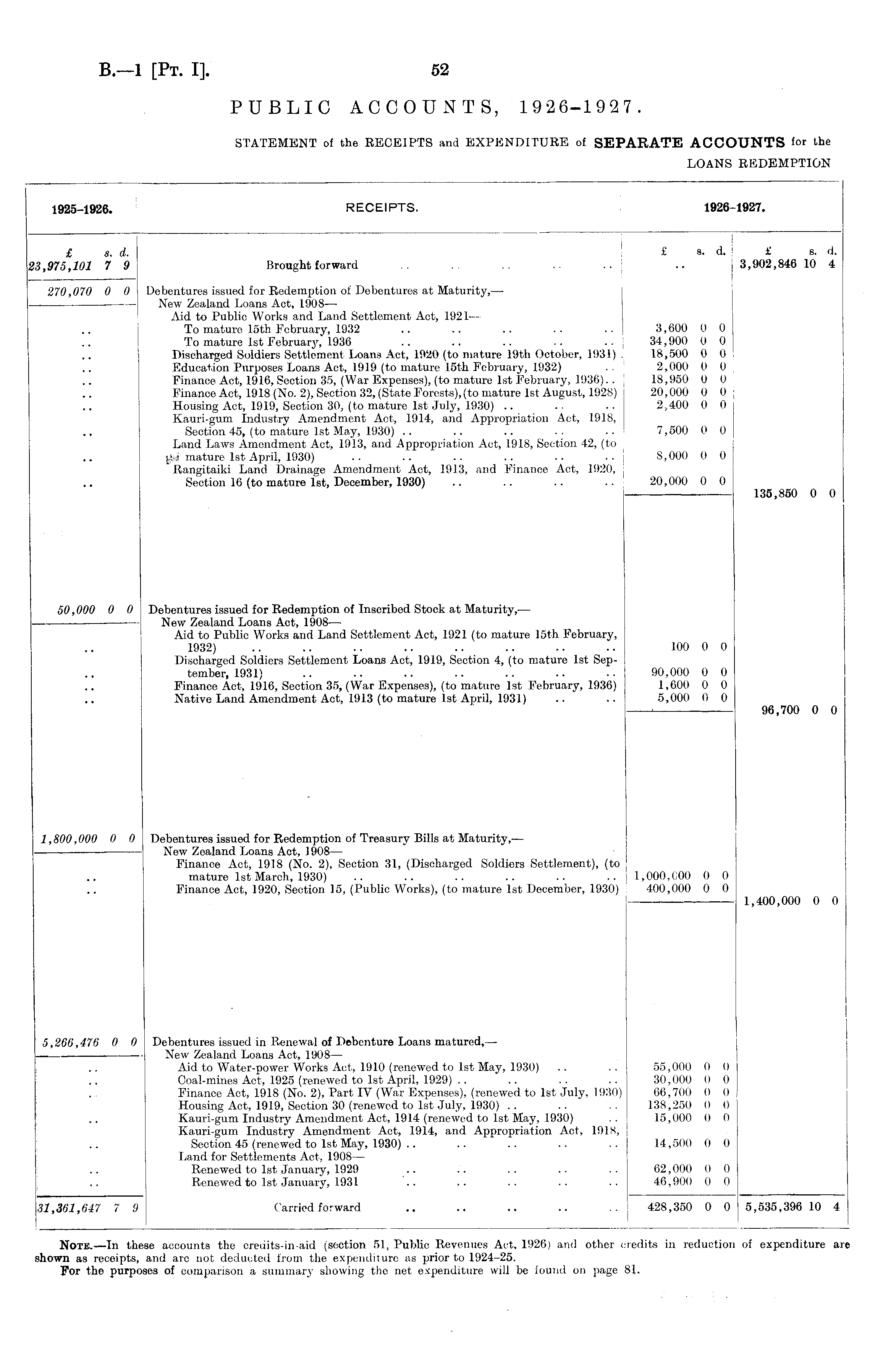 1925-1926. RECEIPTS. 1926-1927. £ s. d. £ s. d. J £ s. d. 23,975,101 7 9 Brought forward .. .. .. .. J 3,902,846 10 4 270,070 0 0 Debentures issued for Redemption of Debentures at Maturity,— New Zealand Loans Act, 1908 — Aid to Public Works and Land Settlement Act, 1921 — To mature loth February, 1932 .. .. .. .. .. 3,600 0 0 To mature 1st February, 1936 .. .. .. .. .. 34,900 0 0 Discharged Soldiers Settlement Loans Act, 1920 (to mature 19th October, 1931) , 18,500 0 0 Education Purposes Loans Act, 1919 (to mature 15th February, 1932) .. 2,000 0 0 Finance Act, 1916, Section 35, (War Expenses), (to mature 1st February, 1936).. [ 18,950 0 0 Finance Act, 1918 (No. 2), Section 32, (State Forests),(to mature 1st August, 1928) 20,000 0 0 Housing Act, 1919, Section 30, (to mature 1st July, 1930) .. . ■ • • 2,400 0 0 Kauri-gum Industry Amendment Act, 1914, and Appropriation Act, 1918, Section 45, (to mature 1st May, 1930) .. .. .. •• •• 7,500 0 0 Land Laws Amendment Act, 1913, and Appropriation Act, 1918, Section 42, (to |$>i mature 1st April, 1930) .. .. .. .. .. .. 8,000 0 0 Rangitaiki Land Drainage Amendment Act, 1913, and Finance Act, 1920, Section 16 (to mature 1st, December, 1930) .. .. .. .. 20,000 0 0 135,850 0 0 50,000 0 0 Debentures issued for Redemption of Inscribed Stock at Maturity, — — New Zealand Loans Act, 1908 — Aid to Public Works and Land Settlement Act, 1921 (to mature 15th February, 1932) .. .. .. .. .. .. .. .. 100 0 0 Discharged Soldiers Settlement Loans Act, 1919, Section 4, (to mature 1st September, 1931) .. .. .. .. .. .. 90,000 0 0 Finance Act, 1916, Section 35, (War Expenses), (to mature 1st February, 1936) 1,600 0 0 Native Land Amendment Act, 1913 (to mature 1st April, 1931) .. .. 5,000 0 0 ■ 96,700 0 0 - 1, 800,000 0 0 Debentures issued for Redemption of Treasury Bills at Maturity,— New Zealand Loans Act, 1908 — Finance Act, 1918 (No. 2), Section 31, (Discharged Soldiers Settlement), (to mature 1st March, 1930) .. .. .. .. .. .. 1,000,C00 0 0 Finance Act, 1920, Section 15, (Public Works), (to mature 1st December, 1930) 400,000 0 0 1,400,000 0 0 5,266,476 0 0 Debentures issued in Renewal of Debenture Loans matured, — New Zealand Loans Act, 1908— Aid to Water-power Works Act, 1910 (renewed to 1st May, 1930) .. . . 55,000 0 0 Coal-mines Act, 1925 (renewed to 1st April, 1929) .. .. . . .. 30,000 0 0 Finance Act, 1918 (No. 2), Part IV (War Expenses), (renewed to 1st July, 1930) 66,700 0 0 Housing Act, 1919, Section 30 (renewed to 1st July, 1930) .. .. .. 138,250 0 0 Kauri-gum Industry Amendment Act, 1914 (renewed to 1st May, 1930) 15,000 0 0 Kauri-gum Industry Amendment Act, 1914, and Appropriation Act, 1918, Section 45 (renewed to 1st May, 1930) .. .. .. .. .. 14,500 0 0 Land for Settlements Act, 1908 — Renewed to 1st January, 1929 .. .. .. .. .. 62,000 0 0 Renewed to 1st January, 1931 .. .. ■■ ■■ 46,900 0 0 31,361,647 7 9 Carried forward .. .. .. .. . . j 428,350 0 0 5,535,396 10 4 Note.—In these accounts the eredits-in-aid (section 51, Public Revenues Act, 1926) and other credits in reduction of expenditure are shown as receipts, and are not deducted from the expenditure as prior to 1924-25. For the purposes of comparison a summary showing the net expenditure will be found on page 81.