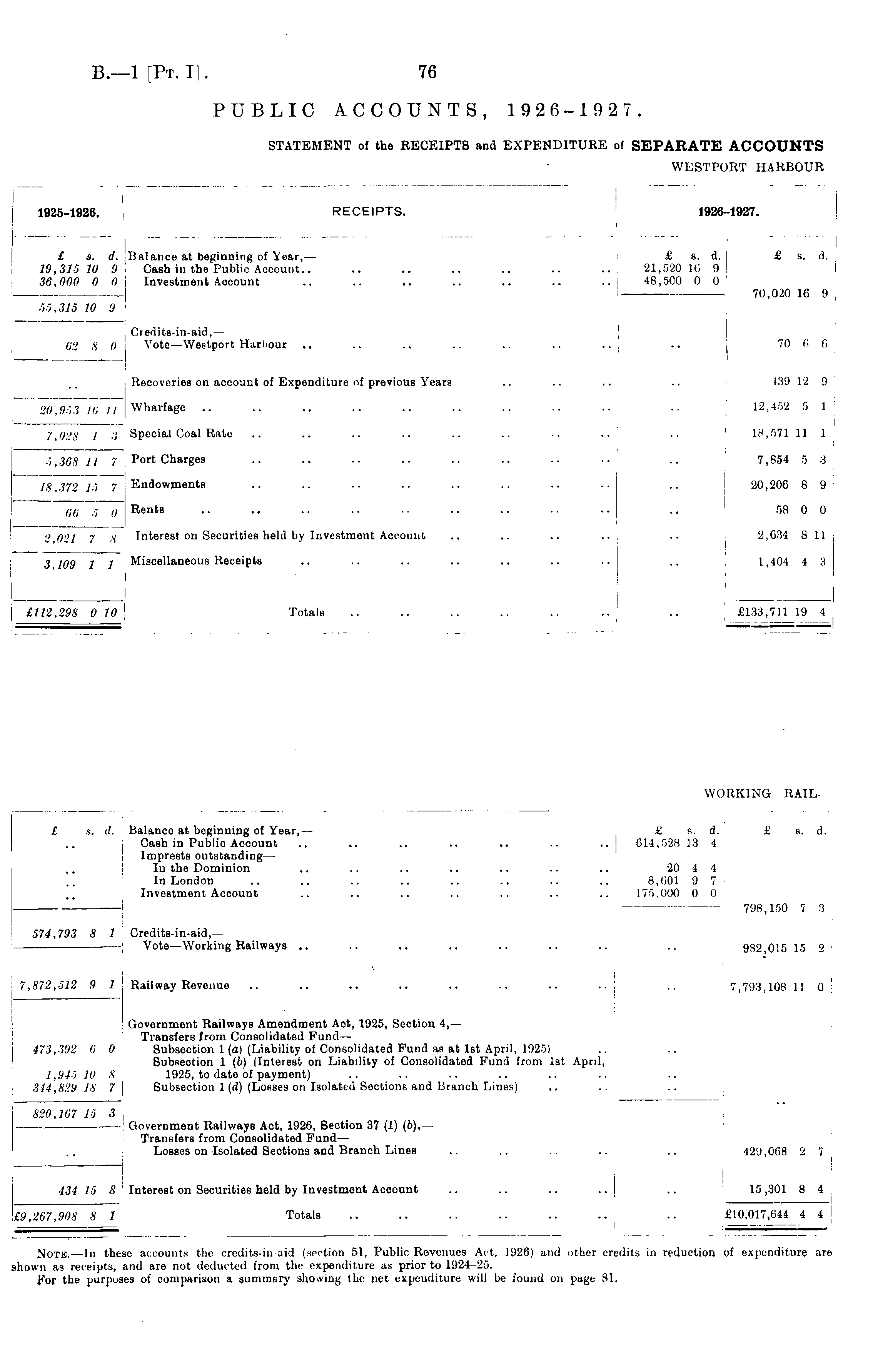 WESTPORT HARBOUR 1925-1926. RECEIPTS. 1926-1927. £ s. d. Balance at beginning of Year, — £ s. d. £ s. d. 19,315 10 9 Cash in the Public Account.. .. .. .. .. .. .. 21,520 16 9 36,000 0 0 Investment Account .. .. .. .. .. .. .. 48,500 0 0 —— 70,020 16 9 55,315 10 9 Credits-in-aid,— 62 S 0 Vote—Weetport Harbour .. .. .. .. .. .. .. .. 70 6 6 Recoveries on account of Expenditure of previous Years .. .. .. .. 439 12 9 20,953 16 11 Wharfage .. .. .. .. .. .. .. .. .. .. 12,452 5 1 7,028 1 3 Special Coal Rate .. .. .. .. .. .. .. .. .. 18,571 11 1 5,368 11 7 Port Charges .. .. .. .. .. .. .. .. .. 7,854 5 3 18,372 15 7 Endowments .. .. .. .. .. .. .. .. .. 20,206 8 9 66 5 0 Renta •• •• •• •• •• •• •• •• •• 58 0 0 2 021 7 8 Interest on Securities held by Investment Account .. .. .. .. .. 2,634 8 11 3,109 1 1 Miscellaneous Receipts .. .. .. .. .. .. .. .. 1,404 4 3 £112,298 0 10 Totals .. .. .. .. .. .. .. £133,711 19 4 WORKING RAIL- £ s. d. Balance at beginning of Year, — £ s. d. £ s. d. Cash in Public Account .. .. .. .. .. .. .. 614,528 13 4 Imprests outstanding— In the Dominion .. .. .. .. .. .. .. 20 4 4 In London .. .. .. .. .. .. .. ,. 8,601 9 7 Investment Aocount .. .. .. .. .. .. .. 175,000 0 0 j 798,150 7 3 574,793 8 1 Credits-in-aid,— Vote—Working Railways .. .. .. .. .. .. .. .. 982,015 15 2 a 7,872,512 9 1 Railway Revenue .. .. .. .. .. .. .. .. .. 7,793,108 11 0 Government Railways Amendment Aot, 1925, Section 4, — Transfers from Consolidated Fund— 473,392 6 0 Subsection 1 (a) (Liability of Consolidated Fund as at 1st April, 1925) Subseotion 1 (j) (Interest on Liability of Consolidated Fund from 1st April, 1,945 10 8 1925, to date of payment) 344,829 18 7 Subsection 1 (d) (Losses on Isolated Sections and Branch Lines) 820,167 15 3 Government Railways Act, 1926, Section 37 (1) (b), — Transfers from Consolidated FundLosses on Isolated Sections and Branch Lines .. .. .. .. .. 429,068 2 7 434 15 8 Interest on Securities held by Investment Acoount .. .. .. .. .. 15,301 8 4 £9,267,908 8 1 Totals .. .. .. .. .. .. .. £10,017,644 4 4 Note. —In these accounts the credits-in-aid (section 51, Public Revenues Act, 1926) and other credits in reduction of expenditure are shown as receipts, and are not deducted from the expenditure as prior to 1924-25. For the purposes of comparison a summary showing the net expenditure will be found on page 81.