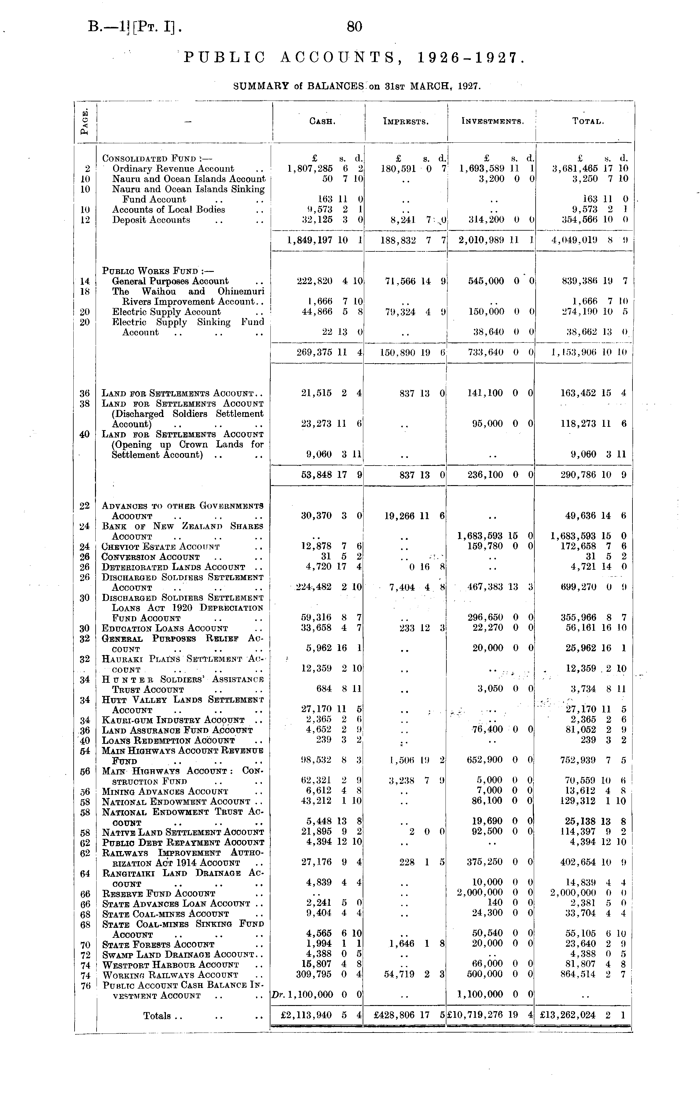 H J 5 — Cash. Imprests. Investments. Total. * I Consolidated Fund :— £ s. d. £ s. d. £ s. d. £ s. d. 2 Ordinary Revenue Account .. 1,807,285 6 2 180,591 0 7 1,693,589 11 1 3,681,465 17 10 10 Nauru and Ocean Islands Acoount 50 7 10 .. 3,200 0 0 3,250 7 10 10 Nauru and Ocean Islands Sinking Fund Account .. .. 163 11 0 .. .. 163 11 0 . 10 Accounts of Local Bodies .. 9,573 2 1 .. .. 9,573 2 J 12 Deposit Accounts .. .. 32,125 3 0 8,241 7 ,,0 314,200 0 0 354,566 10 0 1,849,197 10 1 188,832 7 7 2,010,989 11 J 4,049,019 8 9 Public Works Fund :— 14 | General Purposes Account .. 222,820 4 10 71,566 14 9 545,000 0 0 839,386 19 7 18 | The Waihou and Ohinemuri Rivers Improvement Account.. 1,666 7 10 .. .. 1,666 7 10 20 I Electric Supply Account .. 44,866 5 8 79,324 4 9 150,000 0 0 274,190 10 5 20 j Electric Supply Sinking Fund Account .. .. .. 22 13 0 .. 38,640 0 0 38,662 13 0 269,375 11 4 150,890 19 6 733,640 0 0 1,153,906 10 10 36 Land for Settlements Account.. 21,515 2 4 837 13 0 141,100 0 0 163,452 15 4 38 Land for Settlements Account (Discharged Soldiers Settlement Account) .. .. .. 23,273 11 6 .. 95,000 0 0 118,273 11 6 40 Land fob. Settlements Account (Opening up Crown Lands for Settlement Account) .. .. 9,060 3 11 .. .. 9,060 3 11 53,848 17 9 837 13 0 236,100 0 0 290,786 10 9 22 Advances to other Governments Account .. .. .. 30,370 3 0 19,266 11 6 .. 49,636 14 6 24 Bank of New Zealand Shares Account .. .. .. .. .. 1,683,593 15 0 1,683,593 15 0 24 Cheviot Estate Account .. 12,878 7 6 .. 159,780 0 0 172,658 7 6 26 Conversion Account .. .. 31 5 2 .. -: .. 315 2 26 Deteriorated Lands Account .. 4,720 17 4 0 16 8 .. 4,721 14 0 26 Discharged Soldiers Settlement Account .. .. .. 224,482 2 10 7,404 4 8 467,383 13 3 699,270 0 9 30 Discharged Soldiers Settlement Loans Act 1920 Depreciation FUND ACCOUNT .. .. 59,316 8 7 .. 296,650 0 0 355,966 8 7 30 Education LOANS ACCOUNT .. 33,658 4 7 233 12 3 22,270 0 0 56,161 16 10 32 General Purposes Relief Account .. .. .. 5,962 16 1 .. 20,000 0 0 25,962 16 1 32 Hauraki Plains Settlement Ac-< ■ count ... .. .. 12,359 2 10 .. ..... .. . 12,359.2 10 34 Hunter Soldiers' Assistance .; Trust Account .. .. 684 8 11 .. 3,050 0 0 3,734 8 11 34 Hutt Valley Lands Settlement . : Account .. .. .. 27,170 11 5 .. ... . 27,170 11 5 34 Kauri-gum Industry Account .. 2,365 2 6 .. .. 2,365 2 6 36 Land Assurance Fund Account 4,652 2 9 .. 76,400 0 0 81,052 2 9 40 Loans Redemption Account .. 239 3 2 .. .. 239 3 2 54 Main Highways Account Revenue FUND .. .. .. 98,532 8 3 1,506 19 2 652,900 0 0 752,939 7 5 56 | Main Highways Account : Construction Fund .. .. 62,321 2 9 3,238 7 9 5,000 0 0 70,559 10 6 56 Mining Advances Account .. 6,612 4 8 .. 7,000 0 0 13,612 4 8 58 National Endowment Account .. 43,212 1 10 .. 86,100 0 0 129,312 1 10 58 I National Endowment Trust Account .. .. .. 5,448 13 8 .. 19,690 0 0 25,138 13 8 58 Native Land Settlement Account 21,895 9 2 2 0 0 92,500 0 0 114,397 9 2 62 j Public Debt Repayment Account 4,394 12 10 .. .. 4,394 12 10 62 Railways Improvement Authorization Act 1914 Account .. 27,176 9 4 228 1 5 375,250 0 0 402,654 10 9 64 Rangitaiki Land Drainage Account .. .. .. 4,839 4 4 .. 10,000 0 0 14,839 4 4 66 I Reserve Fund Account .. .. .. 2,000,000 0 0 2,000,000 0 0 66 State Advances Loan Account .. 2,241 5 0 .. 140 0 0 2,381 5 0 68 j State Coal-mines Account .. 9,404 4 4 .. 24,300 0 0 33,704 4 4 68 I State Coal-mines Sinking Fund ACCOUNT .. .. .. 4,565 6 10 .. 50,540 0 0 55,105 6 10 70 | State Forests Account .. 1,994 1 1 1,646 1 8 20,000 0 0 23,640 2 9 72 | Swamp Land Drainage Account. . 4,388 0 5 .. .. 4,388 0 5 74 ' Westport Harbour Account .. 15,807 4 8 .. 66,000 0 0 81,807 4 8 74 ; Workinb Railways Account .. 309,795 0 4 54,719 2 3 500,000 0 0 864,514 2 7 76 ! Public Account Cash Balance Investment Account .. .. Dr. 1,100,000 0 0 .. 1,100,000 0 0 Totals.. .. .. £2,113,940 5 4 £428,806 17 5£10,719,276 19 4 £13,262,024 2 1