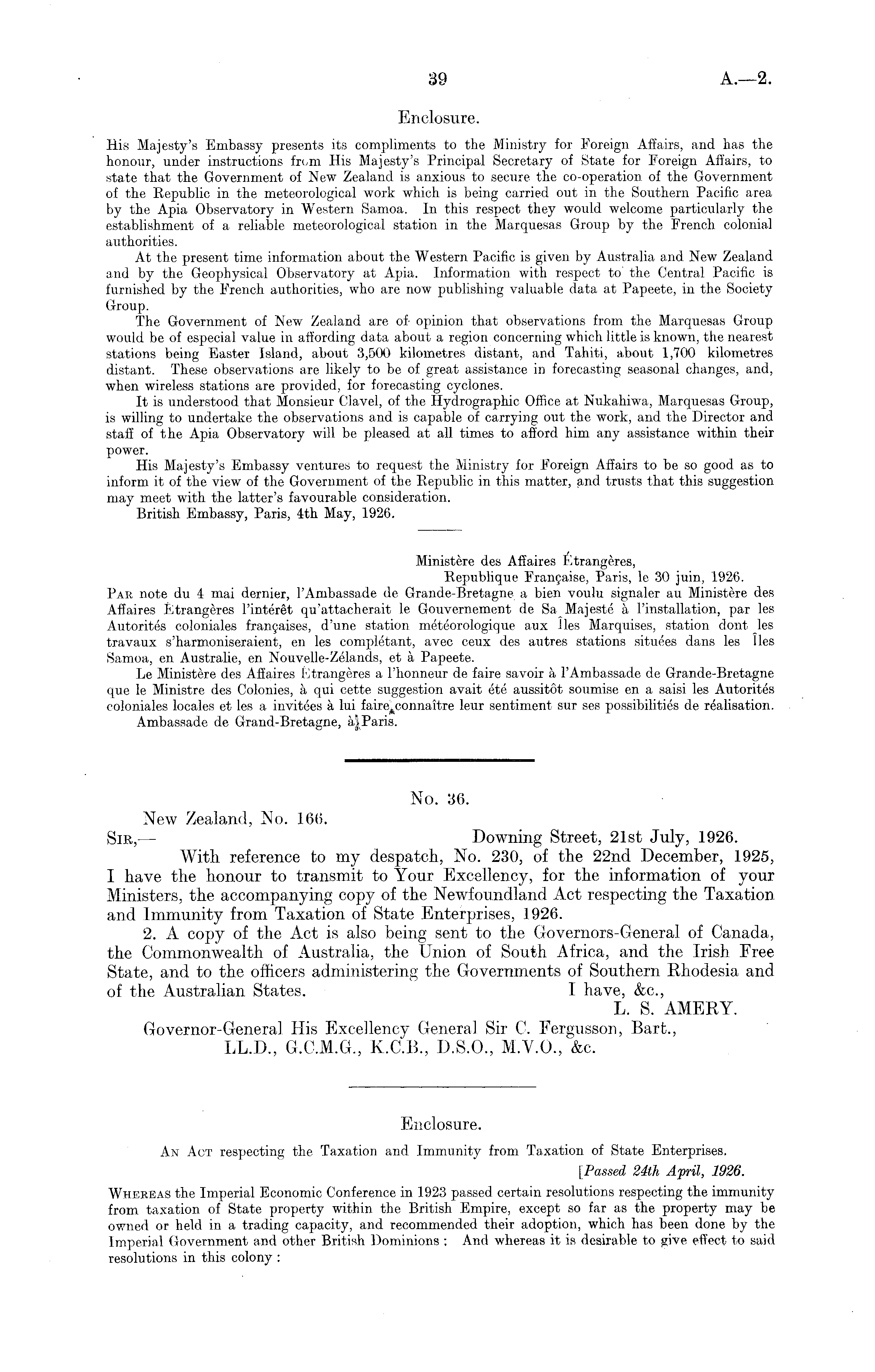 Enclosure. His Majesty's Embassy presents its compliments to the Ministry for Eoreign Affairs, and has the honour, under instructions from His Majesty's Principal Secretary of State for Foreign Affairs, to state that the Government of New Zealand is anxious to secure the co-operation of the Government of the Republic in the meteorological work which is being carried out in the Southern Pacific area by the Apia Observatory in Western Samoa. In this respect they would welcome particularly the establishment of a reliable meteorological station in the Marquesas Group by the French colonial authorities. At the present time information about the Western Pacific is given by Australia and New Zealand and by the Geophysical Observatory at Apia. Information with respect to' the Central Pacific is furnished by the French authorities, who are now publishing valuable data at Papeete, in the Society Group. The Government of New Zealand are of- opinion that observations from the Marquesas Group would be of especial value in affording data about a region concerning which little is known, the nearest stations being Easter Island, about 3,500 kilometres distant, and Tahiti, about 1,700 kilometres distant. These observations are likely to be of great assistance in forecasting seasonal changes, and, when wireless stations are provided, for forecasting cyclones. It is understood that Monsieur Clavel, of the Hydrographic Office at Nukahiwa, Marquesas Group, is willing to undertake the observations and is capable of carrying out the work, and the Director and staff of the Apia Observatory will be pleased at all times to afford him any assistance within their power. His Majesty's Embassy ventures to request the Ministry for Foreign Affairs to be so good as to inform it of the view of the Government of the Republic in this matter, and trusts that this suggestion may meet with the latter's favourable consideration. British Embassy, Paris, 4th May, 1926. Ministere des Affaires Etrangeres, Republique Fran§aise, Paris, le 30 juin, 1926. Par note du 4 mai dernier, l'Ambassade de Grande-Bretagne a bien voulu signaler au Ministere des Affaires Etrangeres l'interet qu'attacherait le Gouvernement de Sa Majeste a l'installation, par les Autorites coloniales fran9aises, d'une station meteorologique aux lies Marquises, station dont les travaux s'harmoniseraient, en les completant, avec ceux des autres stations situees dans les lies Samoa, en Australie, en Nouvelle-Zelands, et a Papeete. Le Ministere des Affaires Ktrangeres a l'honneur de faire savoir a l'Ambassade de Grande-Bretagne que le Ministre des Colonies, a qui cette suggestion avait ete aussitot soumise en a saisi les Autorites coloniales locales et les a invitees a lui faire A connaitre leur sentiment sur ses possibilities de realisation. Ambassade de Grand-Bretagne, a|Paris.