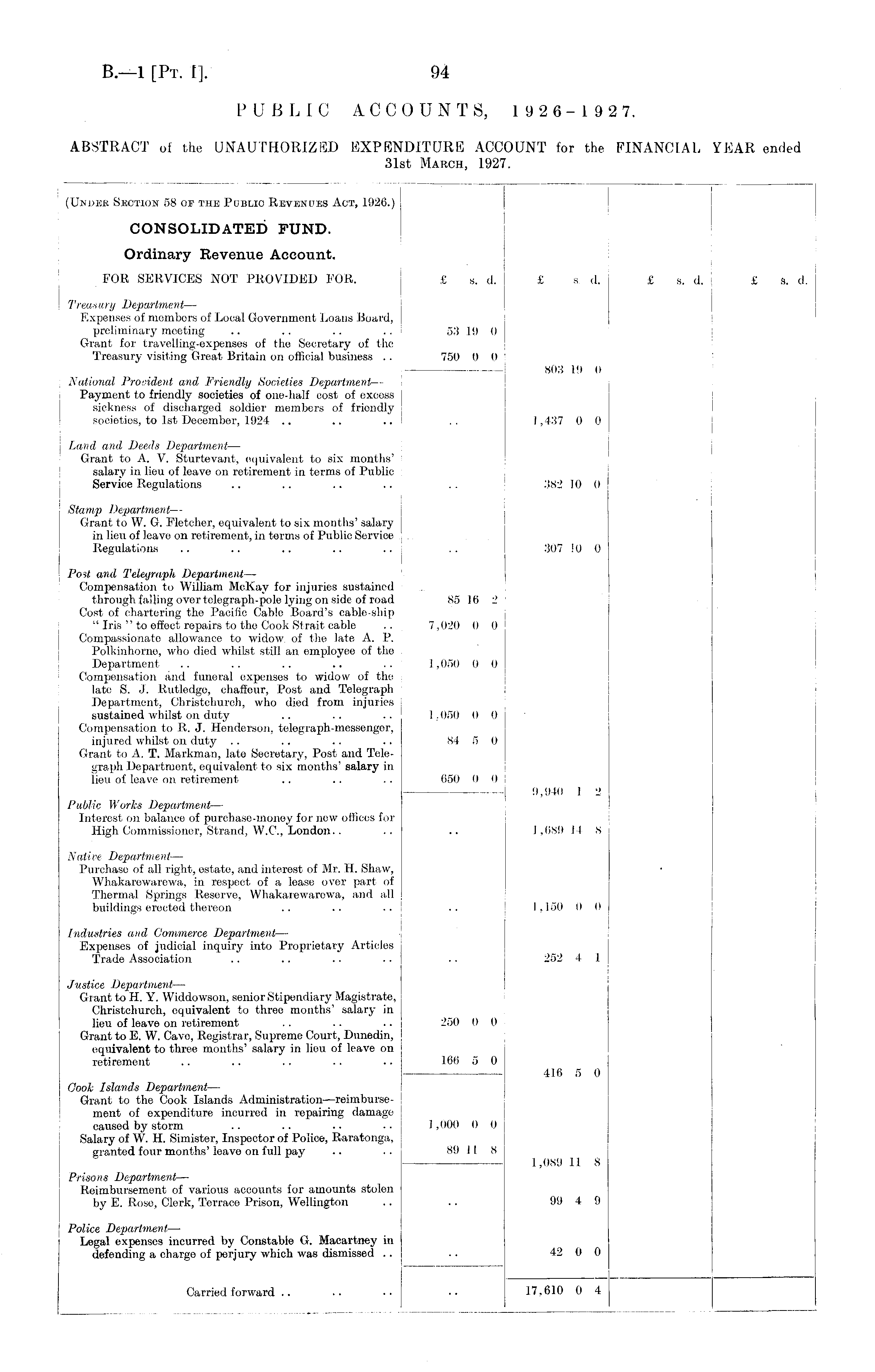 (Undue Section 58 of the Poblio Revenues Act, 1926.) CONSOLIDATED FUND. Ordinary Revenue Account, FOR SERVICES NOT PROVIDED FOR. £ s. d. £ a d. £ s. d. £ s. d. Treasury Department— Expenses of members of Local Government Loans Board, preliminary meeting .. .. .. .. 53 19 0 Grant for travelling-expenses of the Secretary of the Treasury visiting Great Britain on official business .. 750 0 0 — 803 19 0 National Provident and Friendly Societies Department—• Payment to friendly societies of one-half cost of excess sickness of discharged soldier members of friendly societies, to 1st December, 1924 .. .. .. . . 1,437 0 0 Land and Deeds Department— Grant to A. V. Sturtevant, equivalent to six months' salary in lieu of leave on retirement in terms of Public Service Regulations .. .. .. .. .. 382 10 0 Stamp Department— Grant to W. G. Fletcher, equivalent to six months' salary in lieu of leave on retirement, in terms of Public Service Regulations .. .. .. .. .. .. 307 3 0 0 Post and Telegraph Department— Compensation to William McKay for injuries sustained through falling over telegraph-pole lying on side of road 85 16 2 Cost of chartering the Pacific Cable Board's cable-ship " Iris " to effect repairs to the Cook Strait cable .. j 7,020 0 0 Compassionate allowance to widow of the late A. P. Polkinhorne, who died whilst still an employee of the Department .. .. .. .. . . 1,050 0 0 Compensation and funeral expenses to widow of the late S. J. Rutledge, chafieur, Post and Telegraph ; Department, Christchurch, who died from injuries sustained whilst on duty .. .. .. 1,060 0 0 Compensation to R. J. Henderson, telegraph-messenger, injured whilst on duty .. .. .. .. 84 5 0 Grant to A. T. Markman, late Secretary, Post and Telegraph Department, equivalent to six months' salary in lieu of leave on retirement .. .. .. 650 0 0 9,940 1 2 Public Works Department— Interest on balance of purchase-money for new offices for High Commissioner, Strand, W.C., London.. .. .. 1,689 14 8 Native Department— Purchaso of all right, estate, and interest of Mr. H. Shaw, Whakarewarewa, in respect of a lease over part of Thermal Springs Reserve, Whakarewarewa, and all buildings erected thereon .. .. .. .. 1,150 0 0 Industries and Commerce Department— Expenses of judicial inquiry into Proprietary Articles Trade Association .. .. .. .. .. 252 4 1 Justice Department— Grant to H. Y. Widdowson, senior Stipendiary Magistrate, Christchurch, equivalent to three months' salary in lieu of leave on retirement .. .. .. 250 0 0 Grant to E. W. Cave, Registrar, Supreme Court, Dunedin, equivalent to three months' salary in lieu of leave on retirement .. .. .. .. • • 166 5 0 416 5 0 Cook Islands Department— Grant to the Cook Islands Administration —reimbursement of expenditure incurred in repairing damage caused by storm .. .. .. • ■ 1,000 0 0 Salary of W. H. Simister, Inspector of Police, Raratonga, granted four months' leave on full pay .. .. 89 I 1 8 1,089 11 8 Prisons Department — Reimbursement of various accounts for amounts stolen by E. Rose, Clerk, Terrace Prison, Wellington .. .. 99 4 9 Police Department— Legal expenses incurred by Constable G. Macartney in defending a charge of perjury which was dismissed .. .. 42 0 0 | Carried forward .. .. •• 17,610 0 4