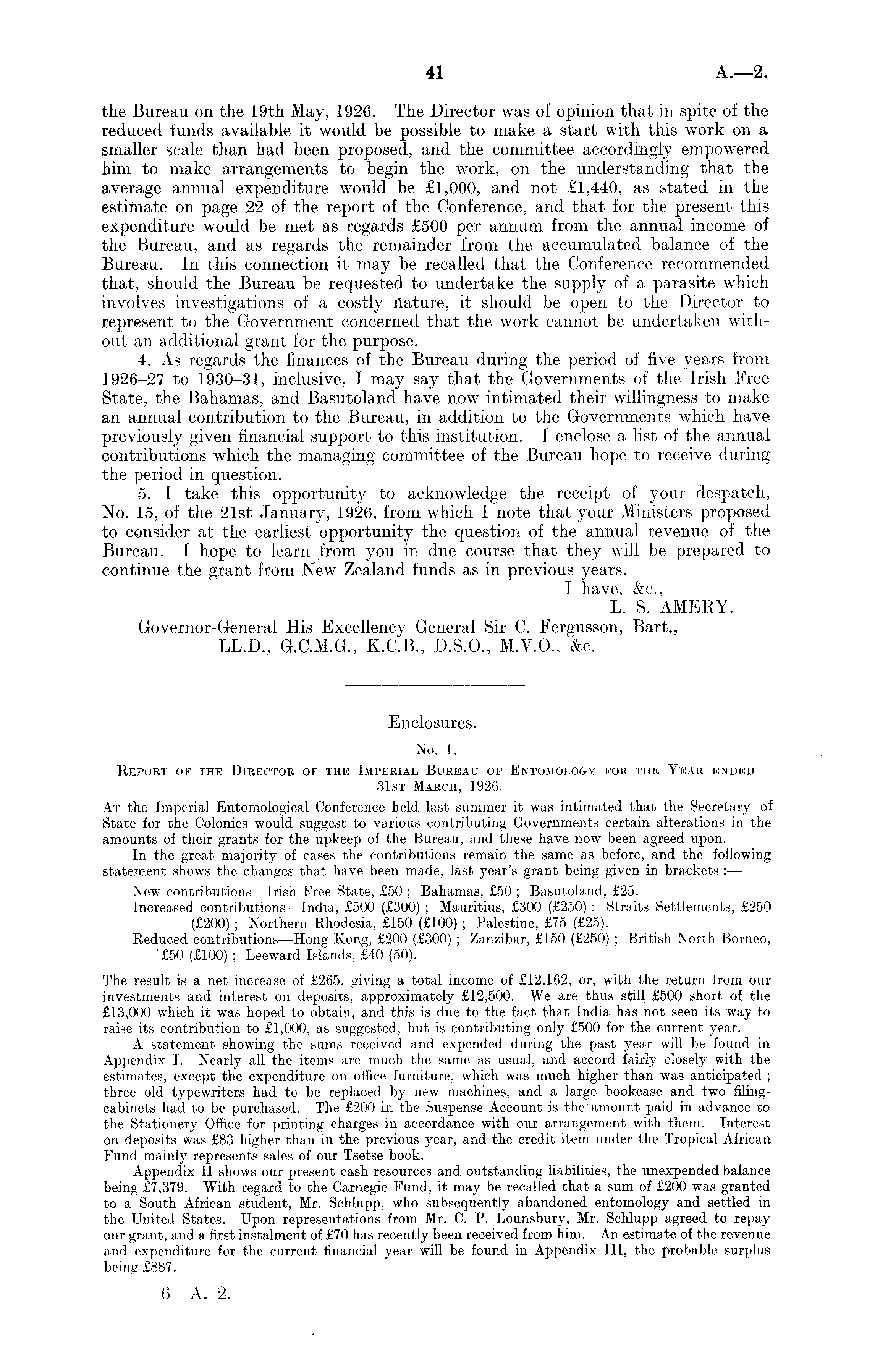the Bureau on the 19th May, 1926. The Director was of opinion that in spite of the reduced funds available it would be possible to make a start with this work on a smaller scale than had been proposed, and the committee accordingly empowered him to make arrangements to begin the work, on the understanding that the average annual expenditure would be £1,000, and not £1,440, as stated in the estimate on page 22 of the report of the Conference, and that for the present this expenditure would be met as regards £500 per annum from the annual income of the Bureau, and as regards the remainder from the accumulated balance of the Bureau. In this connection it may be recalled that the Conference recommended that, should the Bureau be requested to undertake the supply of a parasite which involves investigations of a costly nature, it should be open to the Director to represent to the Government concerned that the work cannot be undertaken without an additional grant for the purpose. 4. As regards the finances of the Bureau during the period of five years from 1926-27 to 1930-31, inclusive, I may say that the Governments of the Irish Free State, the Bahamas, and Basutoland have now intimated their willingness to make an annual contribution to the Bureau, in addition to the Governments which have previously given financial support to this institution. I enclose a list of the annual contributions which the managing committee of the Bureau hope to receive during the period in question. 5. I take this opportunity to acknowledge the receipt of your despatch, No. 15, of the 21st January, 1926, from which I note that your Ministers proposed to consider at the earliest opportunity the question of the annual revenue of the Bureau. I hope to learn from you in due course that they will be prepared to continue the grant from New Zealand funds as in previous years. I have, &c.. L. S. AMERY. Governor-General His Excellency General Sir C. Fergusson, Bart., LL.D., G.C.M.G., K.C.8., D.5.0., M.V.0., &c.