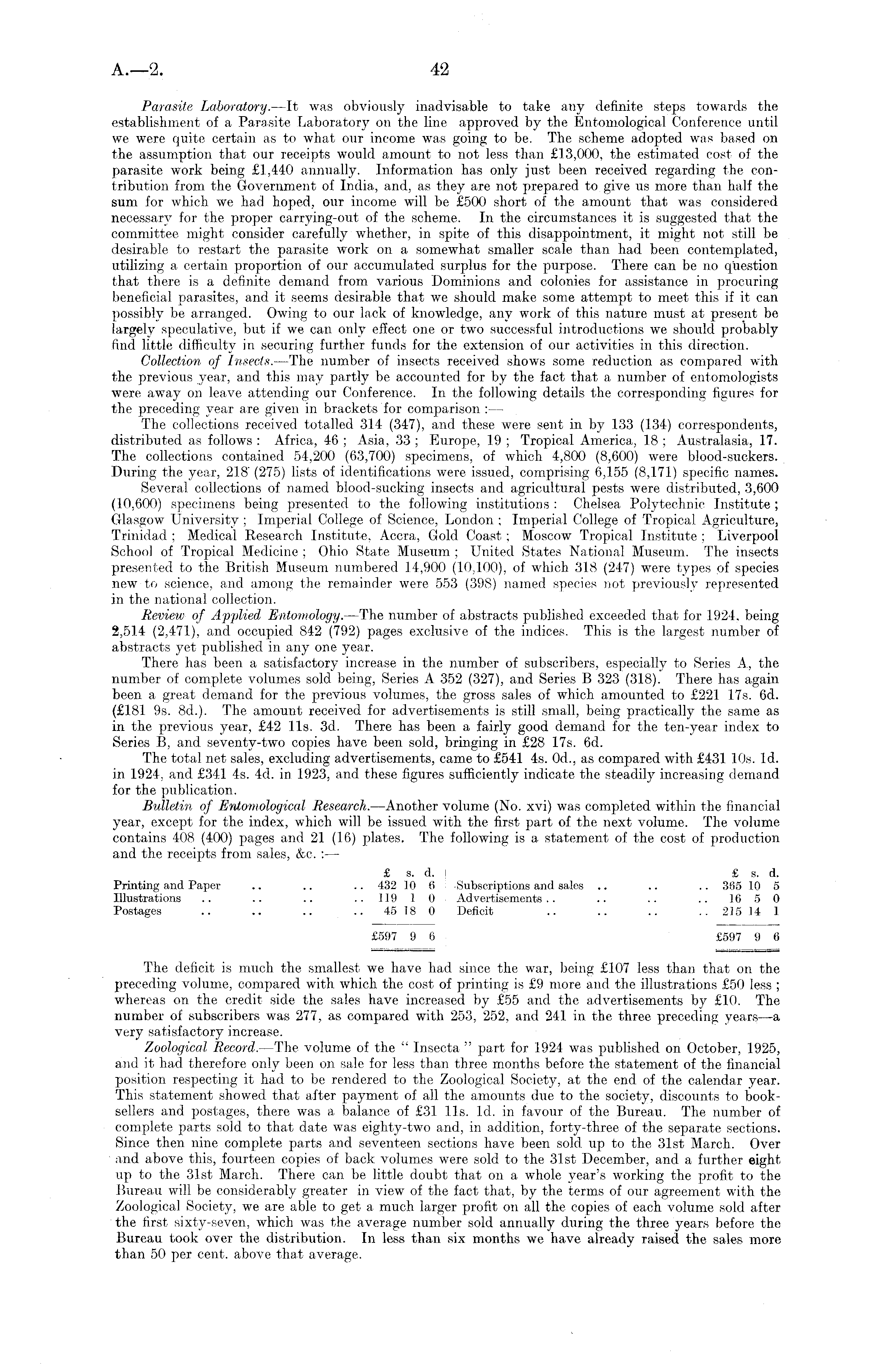 Parasite Laboratory. —It was obviously inadvisable to take any definite steps towards the establishment of a Parasite Laboratory on the line approved by the Entomological Conference until we were quite certain as to what our income was going to be. The scheme adopted was based on the assumption that our receipts would amount to not less than £13,000, the estimated cost of the parasite work being £1,440 annually. Information has only just been received regarding the contribution from the Government of India, and, as they are not prepared to give us more than half the sum for which we had hoped, our income will be £500 short of the amount that was considered necessary for the proper carrying-out of the scheme. In the circumstances it is suggested that the committee might consider carefully whether, in spite of this disappointment, it might not still be desirable to restart the parasite work on a somewhat smaller scale than had been contemplated, utilizing a certain proportion of our accumulated surplus for the purpose. There can be no question that there is a definite demand from various Dominions and colonies for assistance in procuring beneficial parasites, and it seems desirable that we should make some attempt to meet this if it can possibly be arranged. Owing to our lack of knowledge, any work of this nature must at present be largely speculative, but if we can only effect one or two successful introductions we should probably find little difficulty in securing further funds for the extension of our activities in this direction. Collection of Insects. —The number of insects received shows some reduction as compared with the previous year, and this may partly be accounted for by the fact that a number of entomologists were away on leave attending our Conference. In the following details the corresponding figures for the preceding year are given in brackets for comparison : — The collections received totalled 314 (347), and these were sent in by 133 (134) correspondents, distributed as follows : Africa, 46 ; Asia, 33 ; Europe, 19 ; Tropical America, 18 ; Australasia, 17. The collections contained 54,200 (63,700) specimens, of which 4,800 (8,600) were blood-suckers. During the year, 218' (275) lists of identifications were issued, comprising 6,155 (8,171) specific names. Several collections of named blood-sucking insects and agricultural pests were distributed, 3,600 (10,600) specimens being presented to the following institutions : Chelsea Polytechnic Institute ; Glasgow University ; Imperial College of Science, London ; Imperial College of Tropical Agriculture, Trinidad ; Medical Research Institute, Accra, Gold Coast; Moscow Tropical Institute ; Liverpool School of Tropical Medicine ; Ohio State Museum ; United States National Museum. The insects presented to the British Museum numbered 14,900 (10,100), of which 318 (247) were types of species new to science, and among the remainder were 553 (398) named species not previously represented in the national collection. Review of Applied Entomology. —The number of abstracts published exceeded that for 1924, being 2,514 (2,471), and occupied 842 (792) pages exclusive of the indices. This is the largest number of abstracts yet published in any one year. There has been a satisfactory increase in the number of subscribers, especially to Series A, the number of complete volumes sold being, Series A 352 (327), and Series B 323 (318). There has again been a great demand for the previous volumes, the gross sales of which amounted to £221 17s. 6d. (£lBl 9s. Bd.). The amount received for advertisements is still small, being practically the same as in the previous year, £42 lis. 3d. There has been a fairly good demand for the ten-year index to Series B, and seventy-two copies have been sold, bringing in £28 17s. 6d. The total net sales, excluding advertisements, came to £541 4s. od., as compared with £431 10s. Id. in 1924, and £341 4s. 4d. in 1923, and these figures sufficiently indicate the steadily increasing demand for the publication. Bulletin of Entomological Research. —Another volume (No. xvi) was completed within the financial year, except for the index, which will be issued with the first part of the next volume. The volume contains 408 (400) pages and 21 (16) plates. The following is a statement of the cost of production and the receipts from sales, &c. : — £ s. d. ] £ s. d. Printing and Paper .. .. .. 432 10 6 -Subscriptions and sales .. .. .. 385 10 5 Illustrations .. .. .. 119 1 0 Advertisements.. .. .. .. 16 5 0 Postages .. .. .. .. 45 18 0 Deficit .. .. .. 215 14 1 £597 9 6 £597 9 6 The deficit is much the smallest we have had since the war, being £107 less than that on the preceding volume, compared with which the cost of printing is £9 more and the illustrations £50 less ; whereas on the credit side the sales have increased by £55 and the advertisements by £10. The number of subscribers was 277, as compared with 253, 252, and 241 in the three preceding years —a very satisfactory increase. Zoological Record.—The volume of the " Insecta " part for 1924 was published on October, 1925, and it had therefore only been on sale for less than three months before the statement of the financial position respecting it had to be rendered to the Zoological Society, at the end of the calendar year. This statement showed that after payment of all the amounts due to the society, discounts to booksellers and postages, there was a balance of £31 lis. Id. in favour of the Bureau. The number of complete parts sold to that date was eighty-two and, in addition, forty-three of the separate sections. Since then nine complete parts and seventeen sections have been sold up to the 31st March. Over ' and above this, fourteen copies of back volumes were sold to the 31st December, and a further eight up to the 31st March. There can be little doubt that on a whole year's working the profit to the Bureau will be considerably greater