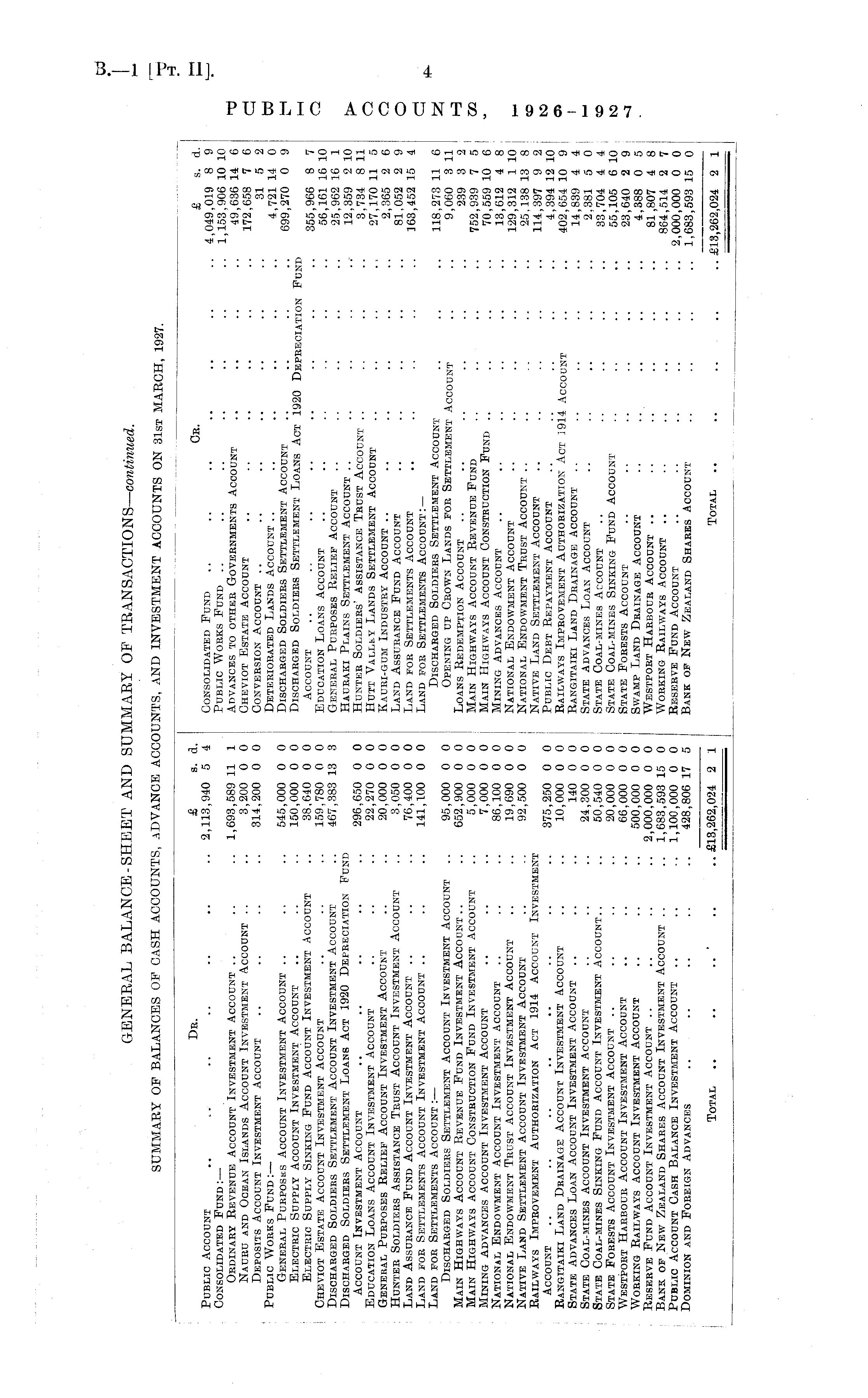 Db. £ s. d. Ob. £ s. d. Public Account .. .. .. .. .. .. .. 2,113,940 5 4 Consolidated Fund .. .. .. .. ..4 049 019 8 9 Consolidated Fund:— Public Wobks Fund .. .. .. .. .. .. l'153' 906 10 10 Okdinaby Revenue Account Investment Account .. .. .. 1,693,589 11 1 Advances to otheb Govebnments Account .. .. .. .. ' 49 636 14 6 Nauru and Ocean Islands Account Investment Account .. .. 3,200 0 0 Cheviot Estate Account .. .. .. ,, . 172'658 7 6 Deposits Account Investment Account .. .. .. .. 314,200 0 0 Convebsion Account .. .. .. .. .. .. ' 31 5 2 Public Wobks Fund: —• Detebiobated Lands Account.. .. .. 4 721 14 0 General Purposes Account Investment Account .. .. .. 545,000 0 0 Discharged Soldiebs Settlement Account .. .. .. .[ 699' 270 0 9 Electbic Supply Account Investment Account .. .. .. 150,000 0 0 Dischabged Soldiebs Settlement Loans Act 1920 Depbeciation Fund Electbic Supply Sinking Fund Account Investment Account .. 38,640 0 0 Account .. .. .. .. .. 355 ggg 8 7 Cheviot Estate Account Investment Account .. .. .. 159,780 0 0 Education Loans Account .. .. .. ,, .. 56'161 16 10 Discharged Soldiers Settlement Account Investment Account .. 467,383 13 3 Geitebal Purposes Relief Account .. .. .. ,, 2s'962 16 1 Dischabged Soldiers Settlement Loans Act 1920 Depbeciation Fund Hauraki Plains Settlement Account .. .. .. .. ... 12 359 2 10 Account Investment Account .. .. .. .. .. 296,650 0 0 Hunter Soldiers' Assistance Trust Account .. .. .. .. 3 734 8 11 Education Loans Account Investment Account .. .. .. 22,270 0 0 Hutt Valley Lands Settlement Account .. .. .. ., 27'l70 11 5 General Purposes Relief Account Investment Accodnt .. .. 20,000 0 0 Kauri-gum Industby Account .. .. .. .. ,. .. 2 365 2 6 Hunter Soldiebs Assistance Trust Account Investment Account .. 3,050 0 0 Land Assurance Fund Account .. .. .. .. ' [ 81!052 2 9 Land Assurance Fund Account Investment Account .. .. .. 76,400 0 0 Land fob Settlements Account .. .. .. 163 452 15 4 Land for Settlements Account Investment Account .. .. .. 141,100 0 0 Land for Settlements Account:— Land fob Settlements Account: — Discharged Soldiebs Settlement Account .. .. .. 118,273 11 6 Discharged Soldiers Settlement Account Investment Account .. 95,000 0 0 Opening up Crown Lands fob Settlement Account .. .. 3 11 Main Highways Account Revenue Fund Investment Account.. .. 652,900 0 0 Loans Redemption Account .. .. .. .. .. '239 3 2 Main Highways Account Constbuction Fund Investment Account .. 5,000 0 0 Main Highways Account Revenue Fund .. .. .. .. 752,939 7 5 j Mining advances Account Investment Account .. .. .. 7,000 0 0 Main Highways Account Construction Fund .. .. .. .. 70'559 10 6 ' National Endowment Account Investment Account .. .. .. 86,100 0 0 Mining Advances Account .. .. .. .. .. 13'612 4 8 National Endowment Tbust Account Investment Account .. .. 19,690 0 0 National Endowment Account .. .. .. .. 129,312 1 10 Native Land Settlement Account Investment Account .. .. 92,500 0 0 National Endowment Tbust Account .. .. .. 25.'138 13 8 Railways Impbovement Authorization Act 1914 Account Investment Native Land Settlement Account .. .. . . .. .. 114 397 9 2 Account .. .. .. .. .. .. .. .. 375,250 0 0 Public Debt Repayment Account .. .. 4 394 12 10 Rangitaiki Land Drainage Account Investment Account .. .. 10,000 0 0 Railways Improvement Authorization Act 1914 Account .. .. 402'654 10 9 State Advances Loas Account Investment Account .. .. .. 140 0 0 Rangitaiki Land Drainage Account .. .. .. .. 14'839 4 4 State Coal-mines Account Investment Account .. .. .. 24,300 0 0 State Advances Loan Account .. .. .. ,, .. 2'381 5 0 State Coal-mines Sinking Fund Account Investment Account.. .. 50,540 0 0 State Coal-mines Account .. .. .. .. .. 4 4 State Forests Account Investment Account .. .. .. .. 20,000 0 0 State Coal-mines Sinking Fund Account .. .. .. 55 105 6 10 Westpobt Habboub Account Investment Account .. .. .. 66,000 0 0 State Fobests Account .. .. .. .. .. .. 2 9 Wobking Railways Account Investment Account .. .. .. 500,000 0 0 Swamp Land Drainage Account .. .. .. .. .. 4,388 0 5 Resebve Fund Account Investment Account .. .. .. .. 2,000,000 0 0 Westpobt Habboub Account .. .. .. .. .. .. 81 807 4 8 Bank of New Zealand Shabes Account Investment Account .. .. 1,683,593 15 0 Wobking Railways Account .. .. .. .. .. .. 864 514 2 7 Public Account Cash Balance Investment Account .. .. .. 1,100,000 0 0 Reserve Fund Account .. .. .. .. .. .. 2, 0 0 Dominion and Foreign Advances .. .. .. .. .. 428,806 17 5 Bank of New Zealand Shares Account .. .. .. 1,683,593 15 0 Total .. .. .. .. ..£13,262,024 2 1 | TOTAL .. .. .. .. ..£13,262,024 2 1
