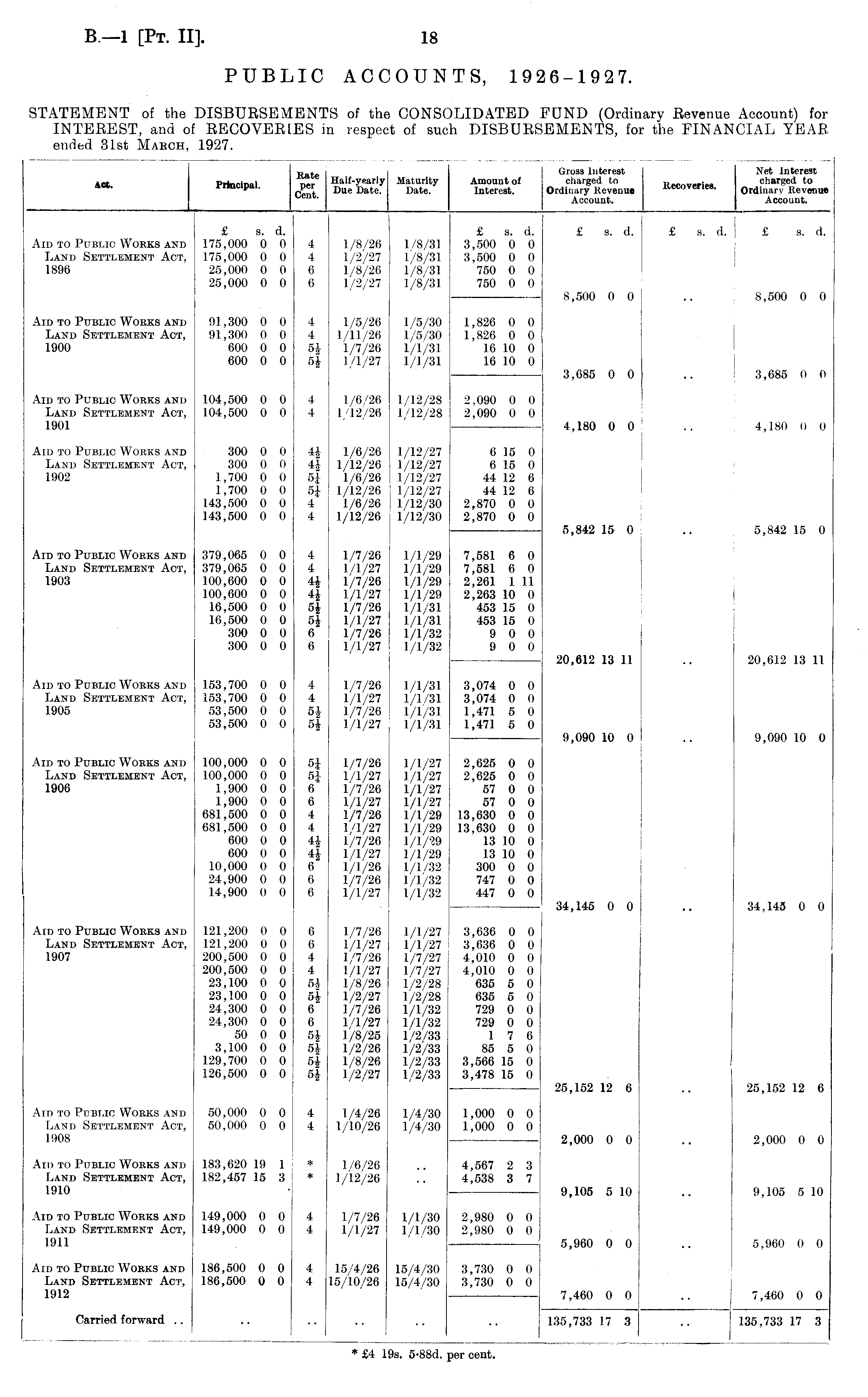 -Pof Gross Interest Net Interest Act Princinal t>er Half-yearly Maturity Amount of charged to charged to p ' J; n . Due Date. Date. Interest. Ordinary Revenue Ordinary Revenue Account. Account. £ s. d. £ s. d. £ s. d. £ s. d. £ s. d. Aid to Public Works and 175,000 0 0 4 1/8/26 1/8/31 3,500 0 0 Land Settlement Act, 175,000 0 0 4 1/2/27 1/8/31 3,500 0 0 1896 25,000 0 0 6 1/8/26 1/8/31 750 0 0 25,000 0 0 6 1/2/27 1/8/31 750 0 0 8,500 0 0 .. 8,500 0 0 Aid to Public Works and 91,300 0 0 4 1/5/26 1/5/30 1,826 0 0 Land Settlement Act, 91,300 0 0 4 1/11/26 1/5/30 1,826 0 0 1900 600 0 0 5i 1/7/26 1/1/31 16 10 0 600 0 0 5J 1/1/27 1/1/31 16 10 0 3,685 0 0 .. ! 3,685 0 0 Aid to Public Works and 104,500 0 0 4 1/6/26 1/12/28 2,090 0 0 Land Settlement Act, 104,500 0 0 4 1/12/26 1/12/28 2,090 0 0 1901 ' ' 4,180 0 0 .. 4,180 0 0 Aid to Public Works and 300 0 0 4| 1/6/26 1/12/27 6 15 0 Land Settlement Act, 300 0 0 4-J 1/12/26 1/12/27 6 15 0 1902 1,700 0 0 5| 1/6/26 1/12/27 44 12 6 1,700 0 0 5J 1/12/26 1/12/27 44 12 6 143,500 0 0 4 1/6/26 1/12/30 2,870 0 0 143,500 0 0 4 1/12/26 1/12/30 2,870 0 0 — 5,842 15 0 .. 5,842 15 0 Aid to Public Works and 379,065 0 0 4 1/7/26 1/1/29 7,581 6 0 Land Settlement Act, 379,065 0 0 4 1/1/27 1/1/29 7,581 6 0 1903 100,600 0 0 4| 1/7/26 1/1/29 2,261 1 11 100,600 0 0 4£ 1/1/27 1/1/29 2,263 10 0 j 16,500 0 0 5i 1/7/26 1/1/31 453 15 0 16,500 0 0 5J 1/1/27 1/1/31 453 15 0 300 0 0 6 1/7/26 1/1/32 9 0 0 300 0 0 6 1/1/27 1/1/32 9 0 0 20,612 13 11 .. 20,612 13 11 Aid to Public Works and 153,700 0 0 4 1/7/26 1/1/31 3,074 0 0 Land Settlement Act, 153,700 0 0 4 1/1/27 1/1/31 3,074 0 0 1905 53,500 0 0 . 5J 1/7/26 1/1/31 1,471 5 0 53,500 0 0 5J 1/1/27 1/1/31 1,471 5 0 9,090 10 0 .. 9,090 10 0 Aid to Public Works and 100,000 0 0 5J 1/7/26 1/1/27 2,625 0 0 LAND Settlement Act, 100,000 0 0 5J 1/1/27 1/1/27 2,625 0 0 1906 1,900 0 0 6 1/7/26 1/1/27 57 0 0 1,900 0 0 6 1/1/27 1/1/27 57 0 0 681,500 0 0 4 1/7/26 1/1/29 13,630 0 0 681,500 0 0 4 1/1/27 1/1/29 13,630 0 0 600 0 0 4J 1/7/26 1/1/29 13 10 0 600 0 0 4J 1/1/27 1/1/29 13 10 0 10,000 0 0 6 1/1/26 1/1/32 300 0 0 24,900 0 0 6 1/7/26 1/1/32 747 0 0 14,900 0 0 6 1/1/27 1/1/32 447 0 0 34,145 0 0 .. 34,145 0 0 Aid to Public Works and 121,200 0 0 6 1/7/26 1/1/27 3,636 0 0 LAND Settlement Act, 121,200 0 0 6 1/1/27 1/1/27 3,636 0 0 1907 200,500 0 0 4 1/7/26 1/7/27 4,010 0 0 200,500 0 0 4 1/1/27 1/7/27 4,010 0 0 23,100 0 0 5J 1/8/26 1/2/28 635 5 0 23,100 0 0 5£ 1/2/27 1/2/28 635 5 0 24,300 0 0 6 1/7/26 1/1/32 729 0 0 24,300 0 0 6 1/1/27 1/1/32 729 0 0 50 0 0 5J 1/8/25 1/2/33 1 7 6 3,100 0 0 5i 1/2/26 1/2/33 85 5 0 129,700 0 0 5J 1/8/26 1/2/33 3,566 15 0 126,500 0 0 5i 1/2/27 1/2/33 3,478 15 0 25,152 12 6 .. 25,152 12 6 Aid to Public Works and 50,000 0 0 4 1/4/26 1/4/30 1,000 0 0 Land Settlement Act, 50,000 0 0 4 1/10/26 1/4/30 1,000 0 0 1908 2,000 0 0 .. 2,000 0 0 Aid to Public Works and 183,620 19 1 * 1/6/26 .. 4,567 2 3 Land Settlement Act, 182,457 15 3 * 1/12/26 .. 4,538 3 7 1910 • ' 9,105 5 10 .. 9,105 5 10 Aid to Public Works and 149,000 0 0 4 1/7/26 1/1/30 2,980 0 0 Land Settlement Act, 149,000 0 0 4 1/1/27 1/1/30 2,980 0 0 1911 ' ' 5,960 0 0 .. 5,960 0 0 Aid to Public Works and 186,500 0 0 4 15/4/26 15/4/30 3,730 0 0 LAND Settlement Act, 186,500 0 0 4 15/10/26 15/4/30 3,730 0 0 1912 ' 7,460 0 0 .. 7,460 0 0 Carried forward .. .. .. .. .. .. 135,733 17 3 .. 135,733 17 3 * £4 19s. 5-88d. per cent.