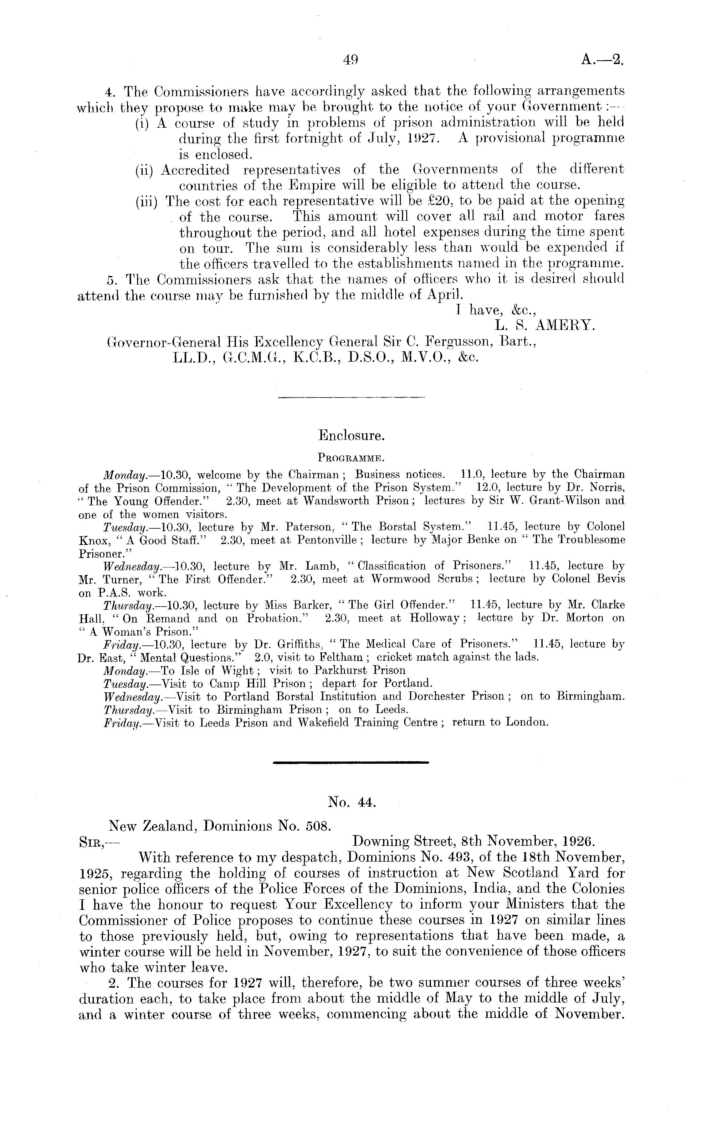 4. The Commissioners have accordingly asked that the following arrangements which they propose to make may be brought to the notice of your Government (i) A course of study in problems of prison administration will be held during the first fortnight of July, 1927. A provisional programme is enclosed. (ii) Accredited representatives of the Governments of the different countries of the Empire will be eligible to attend the course. (iii) The cost for each representative will be £20, to be paid at the opening of the course. This amount will cover all rail and motor fares throughout the period, and all hotel expenses during the time spent on tour. The sum is considerably less than would be expended if the officers travelled to the establishments named in the programme. 5. The Commissioners ask that the names of officers who it is desired should attend the course may be furnished by the middle of April. I have, &c., L. S. AMERY. Governor-General His Excellency General Sir C. Fergusson, Bart., LL.D., G.C.M.G., K.C.8., D.5.0., M.V.0., &c.