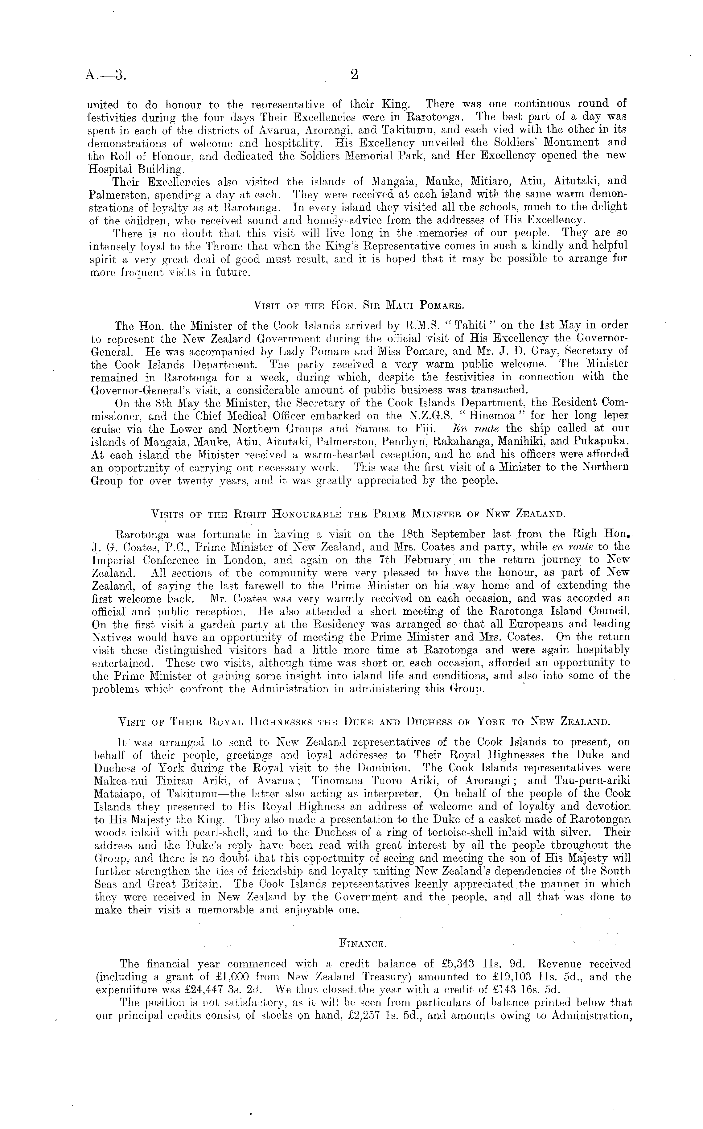united to do honour to the representative of their King. There was one continuous round of festivities during the four days Their Excellencies were in Rarotonga. The best part of a day was spent in each of the districts of Avarua, Arorangi, and Takitumu, and each vied with the other in its demonstrations of welcome and hospitality. His Excellency unveiled the Soldiers' Monument and the Roll of Honour, and dedicated the Soldiers Memorial Park, and Her Excellency opened the new Hospital Building. Their Excellencies also visited the islands of Mangaia, Mauke, Mitiaro, Atiu, Aitutaki, and Palmerston, spending a day at each. They were received at each island with the same warm demonstrations of loyalty as at Rarotonga. In every island they visited all the schools, much to the delight of the children, who received sound and homely advice from the addresses of His Excellency. There is no doubt that this visit will live long in the memories of our people. They are so intensely loyal to the Throne that when the King's Representative comes in such a kindly and helpful spirit a very great deal of good must result, and it is hoped that it may be possible to arrange for more frequent visits in future. Visit of the Hon. Sir Maui Pomare. The Hon. the Minister of the Cook Islands arrived by R.M.S. " Tahiti " on the Ist May in order to represent the New Zealand Government during the official visit of His Excellency the GovernorGeneral. He was accompanied by Lady Pomafe and Miss Pomare, and Mr. J. D. Gray, Secretary of the Cook Islands Department. The party received a very warm public welcome. The Minister remained in Rarotonga for a week, during which, despite the festivities in connection with the Governor-General's visit, a considerable amount of public business was transacted. On the Bth May the Minister, the Secretary of the Cook Islands Department, the Resident Commissioner, and the Chief Medical Officer embarked on the N.Z.G.S. " Hinemoa " for her long leper cruise via the Lower and Northern Groups and Samoa to Fiji. En route the ship called at our islands of Mangaia, Mauke, Atiu, Aitutaki, Palmerston, Penrhyn, Rakahanga, Manihiki, and Pukapuka. At each island the Minister received a warm-hearted reception, and he and his officers were afforded an opportunity of carrying out necessary work. This was the first visit of a Minister to the Northern Group for over twenty years, and it was greatly appreciated by the people. Visits of the Right Honourable thb Prime Minister of New Zealand. Rarotonga was fortunate in having a visit on the 18th September last from the Righ Hon. J. G. Coates, P.C., Prime Minister of New Zealand, and Mrs. Coates and party, while en route to the Imperial Conference in London, and again on the 7th February on the return journey to New Zealand. All sections of the community were very pleased to have the honour, as part of New Zealand, of saying the last farewell to the Prime Minister on his way home and of extending the first welcome back. Mr. Coates was very warmly received on each occasion, and was accorded an official and public reception. He also attended a short meeting of the Rarotonga Island Council. On the first visit a garden party at the Residency was arranged so that all Europeans and leading Natives would have an opportunity of meeting the Prime Minister and Mrs. Coates. On the return visit these distinguished visitors had a little more time at Rarotonga and were again hospitably entertained. These two visits, although time was short on each occasion, afforded an opportunity to the Prime Minister of gaining some insight into island life and conditions, and also into some of the problems which confront the Administration in administering this Group. Visit of Their Royal Highnesses the Duke and Duchess of York to New Zealand. It was arranged to send to New Zealand representatives of the Cook Islands to present, on behalf of their people, greetings and loyal addresses to Their Royal Highnesses the Duke and Duchess of York during the Royal visit to the Dominion. The Cook Islands representatives were Makea-nui Tinirau Ariki, of Avarua; Tinomana, Tuoro Ariki, of Arorangi; and Tau-puru-ariki Mataiapo, of Takitumu —the latter also acting as interpreter. On behalf of the people of the Cook Islands they presented to His Royal Highness an address of welcome and of loyalty and devotion to His Majesty the King. They also made a presentation to the Duke of a casket made of Rarotongan woods inlaid with pearl-shell, and to the Duchess of a ring of tortoise-shell inlaid with silver. Their address and the Duke's reply have been read with great interest by all the people throughout the Group, and there is no doubt that this opportunity of seeing and meeting the son of His Majesty will further strengthen the ties of friendship and loyalty uniting New Zealand's dependencies of the South Seas and Great Britain. The Cook Islands representatives keenly appreciated the manner in which they were received in New Zealand by the Government and the people, and all that was done to make their visit a memorable and enjoyable one. Finance. The financial year commenced with a credit balance of £5,343 lis. 9d. Revenue received (including a grant of £1,000 from New Zealand Treasury) amounted to £19,103 lis. 5d., and the expenditure was £24,447 3s. 2d. We thus closed the year with a credit of £143 16s. sd. The position is not satisfactory, as it will be seen from particulars of balance printed below that our principal credits consist of stocks on hand, £2,257 Is, 5d., and amounts owing to Administration,
