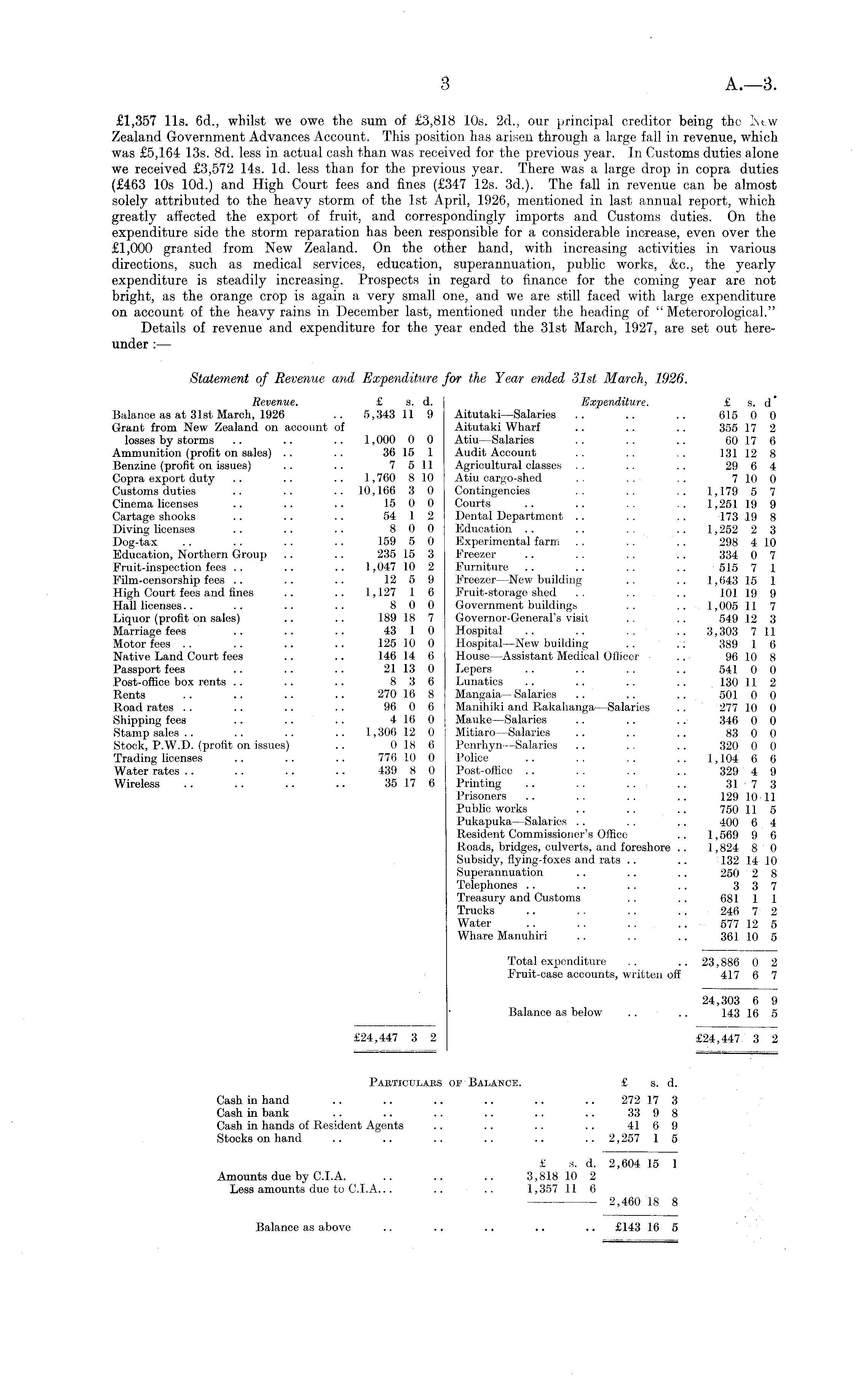 £1,357 lis. 6d., whilst we owe the sum of £3,818 10s. 2d., our principal creditor being the l\tw Zealand Government Advances Account. This position has arisen through a large fall in revenue, which was £5,164 13s. Bd. less in actual cash than was received for the previous year. In Customs duties alone we received £3,572 14s. Id. less than for the previous year. There was a large drop in copra duties (£463 10s lOd.) and High Court fees and fines (£347 12s. 3d.). The fall in revenue can be almost solely attributed to the heavy storm of the Ist April, 1926, mentioned in last annual report, which greatly affected the export of fruit, and correspondingly imports and Customs duties. On the expenditure side the storm reparation has been responsible for a considerable increase, even over the £1,000 granted from New Zealand. On the other hand, with increasing activities in various directions, such as medical services, education, superannuation, public works, &c., the yearly expenditure is steadily increasing. Prospects in regard to finance for the coming year are not bright, as the orange crop is again a very small one, and we are still faced with large expenditure on account of the heavy rains in December last, mentioned under the heading of " Meterorological." Details of revenue and expenditure for the year ended the 31st March, 1927, are set out hereunder :— Statement of Revenue and Expenditure for the Year ended 31st March, 1926. Revenue. £ s. d. Expenditure. £ s. d* Balance as at 31st March, 1926 .. 5,343 11 9 Aitutaki—Salaries .. .. .. 615 0 0 Grant from New Zealand on account of Aitutaki Wharf .. .. .. 355 17 2 losses by storms .. .. .. 1,000 0 0 Atiu —Salaries .. .. .. 60 17 6 Ammunition (profit on sales) .. .. 36 15 1 Audit Account .. .. . . 131 12 8 Benzine (profit on issues) .. .. 7 511 Agricultural classes .. .. .. 29 6 4 Copra export duty .. .. .. 1,760 810 Atiu cargo-shed .. .. . . 710 0 Customs duties .. .. .. 10,166 3 0 Contingencies .. .. .. 1,179 5 7 Cinema licenses .. .. .. 15 0 0 Courts .. .. .. .. 1,251 19 9 Cartage shooks .. .. .. 54 1 2 Dental Department .. .. .. 173198 Diving licenses .. .. .. 8 0 0 Education .. .. . , .. 1,252 2 3 Dog-tax .. .. .. .. 159 5 0 Experimental farm . . . . . . 298 410 Education, Northern Group .. .. 235 15 3 Freezer .. .. . . .. 334 0 7 Fruit-inspection fees .. .. .. 1,047 10 2 Furniture .. .. .. .. 515 7 1 Film-censorship fees .. .. .. 12 5 9 Freezer—New building .. .. 1,643 15 1 High Court fees and fines .. .. 1,127 1 6 Fruit-storage shed . . . . . . 101 19 9 Hall licenses.. .. .. .. 8 0 0 Government buildings . . .. 1,005 11 7 Liquor (profit on sales) .. .. 189 18 7 Governor-General's visit .. .. 549 12 3 Marriage fees .. .. .. 43 1 0 Hospital .. .. .. .. 3,303 711 Motor fees .. .. .. .. 125 10 0 Hospital—New building .. . : 389 1 6 Native Land Court fees .. .. 146 14 6 House—Assistant Medical Officer .. 96 10 8 Passport fees .. .. .. 21 13 0 Lepers .. .. .. .. 541 0 0 Post-office box rents .. .. .. 8 3 6 Lunatics .. .. .. .. 130 11 2 Rents .. .. .. .. 270 16 8 Mangaia—Salaries .. .. .. 501 0 0 Road rates . . .. .. .. 96 0 6 Manihiki and Rakahanga—Salaries .. 277 10 0 Shipping fees .. .. .. 416 0 Mauke—Salaries .. .. ... 346 0 0 Stamp sales .. .. .. .. 1,306 12 0 Mitiaro —Salaries .. .. .. 83 0 0 Stock, P.W.D. (profit on issues) .. 018 6 Penrhyn—Salaries .. . . .. 320 0 0 Trading licenses .. .. .. 776 10 0 Police .. .. .. .. 1,104 6 6 Water rates .. .. .. .. 439 8 0 Post-office .. .. ~ .. 329 4 9 Wireless .. .. .. .. 35 17 6 Printing .. .. .. .. 31 7 3 Prisoners .. .. .. .. 129 10 11 Public works .. .. .. 750 11 5 Pukapuka—Salaries .. .. .. 400 6 4 Resident Commissioner's Office .. 1,569 9 6 Roads, bridges, culverts, and foreshore .. 1,824 8 0 Subsidy, flying-foxes and rats .. .. 132 14 10 Superannuation .. .. .. 250 2 8 Telephones .. .. .. .. 3 3 7 Treasury and Customs . . .. 681 1 1 Trucks .. .. .. .. 246 7 2 Water .. . . . . .. 577 12 5 Whare Manuhiri .. .. .. 361 10 5 Total expenditure . . .. 23,886 0 2 Fruit-case accounts, written off 417 6 7 24,303 6 9 Balance as below . . .. 143 16 5 £24,447 3 2 £24,447. 3 2 Particulars of Balance. £ s. d. Cash in hand .. .. .. .. .. .. 272 17 3 Cash in bank .. .. .. .. .. .. 33 9 8 Cash in hands of Resident Agents .. .. .. .. 4169 Stocks on hand .. .. .. .. .. .. 2,257 1 5 £ s. d. 2,604 15 1 Amounts due by C.IA. .. .. .. 3,818 10 2 Less amounts due to C.1.A... .. .. 1,357 11 6 2,460 18 8 Balance as above .. .. .. .. .. £143 16 5