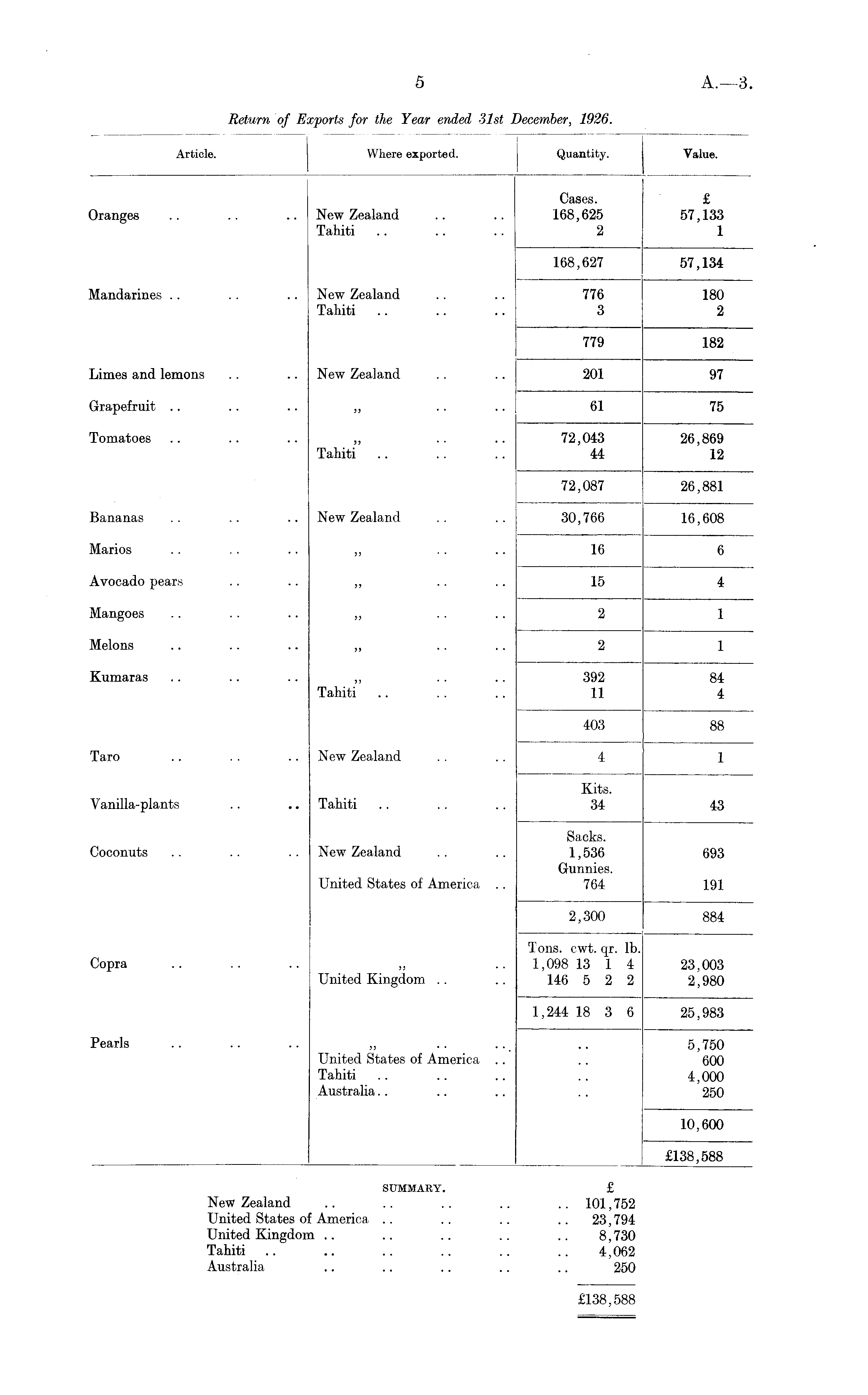 SUMMARY. £ New Zealand .. .. .. .. .. 101,752 United States of America .. .. .. .. 23,794 United Kingdom .. .. .. .. .. 8,730 Tahiti .. .. .. .. .. .. 4,062 Australia .. .. .. .. .. 250 £138,588