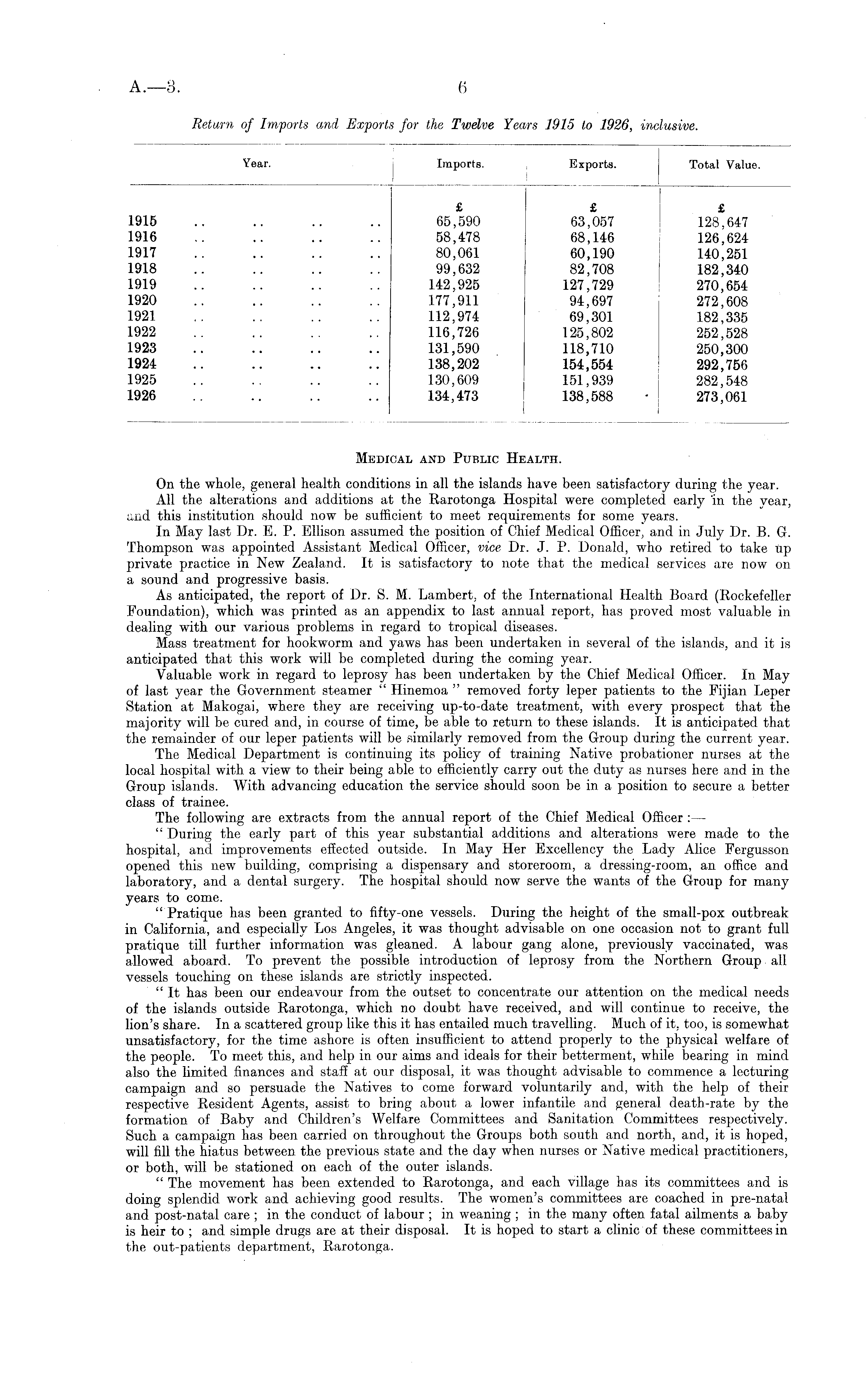 Medical and Public Health. On the whole, general health conditions in all the islands have been satisfactory during the year. All the alterations and additions at the Rarotonga Hospital were completed early 'in the year, and this institution should now be sufficient to meet requirements for some years. In May last Dr. E. P. Ellison assumed the position of Chief Medical Officer, and in July Dr. B. G. Thompson was appointed Assistant Medical Officer, vice Dr. J. P. Donald, who retired to take tip private practice in New Zealand. It is satisfactory to note that the medical services are now on a sound and progressive basis. As anticipated, the report of Dr. S. M. Lambert, of the International Health Board (Rockefeller Foundation), which was printed as an appendix to last annual report, has proved most valuable in dealing with our various problems in regard to tropical diseases. Mass treatment for hookworm and yaws has been undertaken in several of the islands, and it is anticipated that this work will be completed during the coming year. Valuable work in regard to leprosy has been undertaken by the Chief Medical Officer. In May of last year the Government steamer " Hinemoa " removed forty leper patients to the Fijian Leper Station at Makogai, where they are receiving up-to-date treatment, with every prospect that the majority will be cured and, in course of time, be able to return to these islands. It is anticipated that the remainder of our leper patients will be similarly removed from the Group during the current year. The Medical Department is continuing its policy of training Native probationer nurses at the local hospital with a view to their being able to efficiently carry out the duty as nurses here and in the Group islands. With advancing education the service should soon be in a position to secure a better class of trainee. The following are extracts from the annual report of the Chief Medical Officer : — " During the early part of this year substantial additions and alterations were made to the hospital, and improvements effected outside. In May Her Excellency the Lady Alice Fergusson opened this new building, comprising a dispensary and storeroom, a dressing-room, an office and laboratory, and a dental surgery. The hospital should now serve the wants of the Group for many years to come. " Pratique has been granted to fifty-one vessels. During the height of the small-pox outbreak in California, and especially Los Angeles, it was thought advisable on one occasion not to grant full pratique till further information was gleaned. A labour gang alone, previously vaccinated, was allowed aboard. To prevent the possible introduction of leprosy from the Northern Group all vessels touching on these islands are strictly inspected. "It has been our endeavour from the outset to concentrate our attention on the medical needs of the islands outside Rarotonga, which no doubt have received, and will continue to receive, the lion's share. In a scattered group like this it has entailed much travelling. Much of it, too, is somewhat unsatisfactory, for the time ashore is often insufficient to attend properly to the physical welfare of the people. To meet this, and help in our aims and ideals for their betterment, while bearing in mind also the limited finances and staff at our disposal, it was thought advisable to commence a lecturing campaign and so persuade the Natives to come forward voluntarily and, with the help of their respective Resident Agents, assist to bring about a lower infantile and general death-rate by the formation of Baby and Children's Welfare Committees and Sanitation Committees respectively. Such a campaign has been carried on throughout the Groups both south and north, and, it is hoped, will fill the hiatus between the previous state and the day when nurses or Native medical practitioners, or both, will be stationed on each of the outer islands. " The movement has been extended to Rarotonga, and each village has its committees and is doing splendid work and achieving good results. The women's committees are coached in pre-natal and post-natal care ; in the conduct of labour ; in weaning ; in the many often fatal ailments a baby is heir to ; and simple drugs are at their disposal. It is hoped to start a clinic of these committees in the out-patients department, Rarotonga.