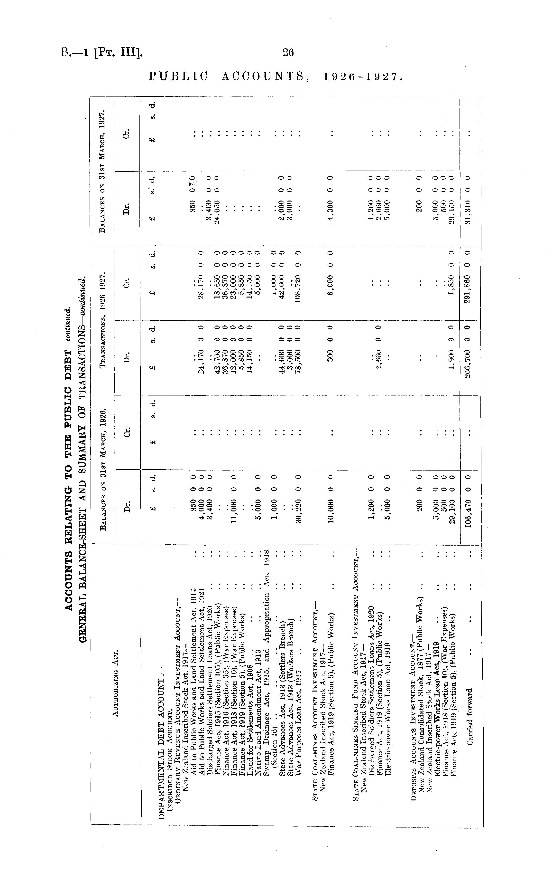 Balances on 31st Makch, 1926. Transactions, 1926-1927. Balances on 31st March, 1927. Authorizing Act. Dr. Cr. Dr. Cr. Dr. Cr. £ s. d. £ s. d. £ s. d. £ s. d. £ s. d. £ s. d. DEPARTMENTAL DEBT ACCOUNT Inscribed Stock Account, — Ordinary Revenue Account Investment Account, — New Zealand Inscribed Stock Act, 1917 — Aid to Public Works and Land Settlement Act, 1914 .. 850 0 0 .. .. .. 850 0J[0 Aid to Public Works and Land Settlement Act, 1921 .. 4,000 0 0 .. 24,170 0 0 28,170 0 0 Discharged Soldiers Settlement Loans Act, 1920 .. .. 3,400 0 0 .. .. •• 3,400 0 0 Einanee Act, 1915 (Section 105), (Public Works) .. .. .. .. 42,700 0 0 18,650 0 0 24,050 0 0 Finance Act, 1916 (Section 35), (War Expenses) .. .. .. .. 36,870 0 0 36,870 0 0 Finance Act, 1918 (Section 10), (War Expenses) .. .. 11,000 0 0 .. 12,000 0 0 23,000 0 0 Finance Act, 1919 (Section 5), (Public Works) .. .. .. .. 5,850 0 0 5,850 0 0 Land for Settlements Act, 1908 .. .. .. .. .. .. 14,150 0 0 14,150 0 0 Native Land Amendment Act, 1913 .. .. .. 5,000 0 0 .. .. 5,000 0 0 Swamp Drainage Act, 1915, and Appropriation Act, 1918 (Section 46) .. .. .. .. .. .. 1,000 0 0 .. .. 1,000 0 0 State Advances Act, 1913 (Settlers Branch) .. .. .. .. 44,600 0 0 42,600 0 0 2,000 0 0 State Advances Act. 1913 (Workers Branch) .. .. .. .. 3,000 0 0 .. 3,000 0 0 War Purposes Loan Act, 1917 .. .. .. .. 30,220 0 0 .. 78,500 0 0 108,720 0 0 State Coal-mines Account Investment Account, — New Zealand Inscribed Stock Act, 1917 — Finance Act, 1919 (Section 5), (Public Works) .. .. 10,000 0 0 .. 300 0 0 6,000 0 0 4,300 0 0 State Coal-mines Sinking Fund Account Investment Account, — New Zealand Inscribed Stock Act, 1917 — Discharged Soldiers Settlement Loans Act, 1920 .. .. 1,200 0 0 .. .. 1,200 0 0 Finance Act, 1919 (Section 5), (Public Works) .. .. .. .. 2,660 0 0 .. 2,660 0 0 Electric-power Works Loan Act, 1919 .. .. .. 5,000 0 0 .. .. 5,000 0 0 Deposits Accounts Investment Account, — New Zealand Consolidated Stock, 1877 (Public Works) .. .. 200 0 0 .. .. • ■ 200 0 0 New Zealand Inscribed Stock Act, 1917 — I Electric-power Works Loan Act, 1919 .. .. .. 5,000 0 0 •.. •• 5,000 0 0 Finance Act, 1918 (Section 10), (War Expenses) .. .. 500 0 0 - ■ • • ■ - 500 0 0 Finance Act, 1919 (Section 5), (Public Works) .. .. 29,100 0 0 .. 1,900 0 0 1,850 0 0 29,150 0 0 Carried forward .. •• .. •• 106,470 0 0 .. 266,700 0 0 291,860 0 0 81,310 0 0