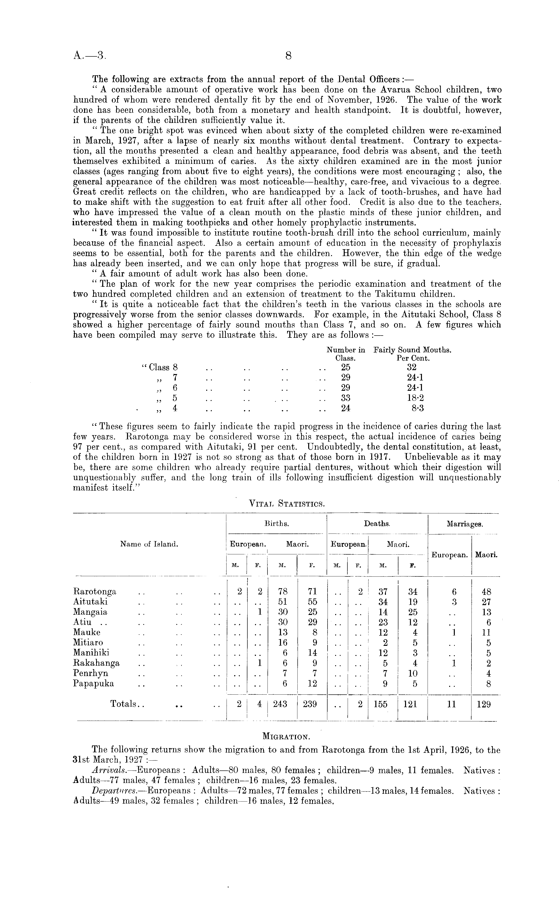 The following are extracts from the annual report of the Dental Officers: — " A considerable amount of operative work has been done on the Avarua School children, two hundred of whom were rendered dentally fit by the end of November, 1926. The value of the work done has been considerable, both from a monetary and health standpoint. It is doubtful, however, if the parents of the children sufficiently value it. " The one bright spot was evinced when about sixty of the completed children were re-examined in March, 1927, after a lapse of nearly six months without dental treatment. Contrary to expectation, all the mouths presented a clean and healthy appearance, food debris was absent, and the teeth themselves exhibited a minimum of caries. As the sixty children examined are in the most junior classes (ages ranging from about five to eight years), the conditions were most encouraging ; also, the general appearance of the children was most noticeable—healthy, care-free, and vivacious to a degree. Great credit reflects on the children, who are handicapped by a lack of tooth-brushes, and have had to make shift with the suggestion to eat fruit after all other food. Credit is also due to the teachers, who have impressed the value of a clean mouth on the plastic minds of these junior children, and interested them in making toothpicks and other homely prophylactic instruments. " It was found impossible to institute routine tooth-brush drill into the school curriculum, mainly because of the financial aspect. Also a certain amount of education in the necessity of prophylaxis seems to be essential, both for the parents and the children. However, the thin edge of the wedge has already been inserted, and we can only hope that progress will be sure, if gradual. " A fair amount of adult work has also been done. " The plan of work for the new year comprises the periodic examination and treatment of the two hundred completed children and an extension of treatment to the Takitumu children. " It is quite a noticeable fact that the children's teeth in the various classes in the schools are progressively worse from the senior classes downwards. For example, in the Aitutaki School, Class 8 showed a higher percentage of fairly sound mouths than Class 7, and so on. A few figures which have been compiled may serve to illustrate this. They are as follows :— Number in Fairly Sound Mouths. Class. Per Cent. " Class 8 .. .. .. .. 25 32 „ 7 .. .. .. .. 29 24-1 „ 6 .. .. .. .. 29 24-1 „ 5 .. .. .. .. 33 18-2 „ 4 .. .. .. .. 24 8-3 " These figures seem to fairly indicate the rapid progress in the incidence of caries during the last few years. Rarotonga may be considered worse in this respect, the actual incidence of caries being 97 per cent., as compared with Aitutaki, 91 per cent. Undoubtedly, the dental constitution, at least, of the children born in 1927 is not so strong as that of those born in 1917. Unbelievable as it may be, there are some children who already require partial dentures, without which their digestion will unquestionably suffer, and the long train of ills following insufficient digestion will unquestionably manifest itself."