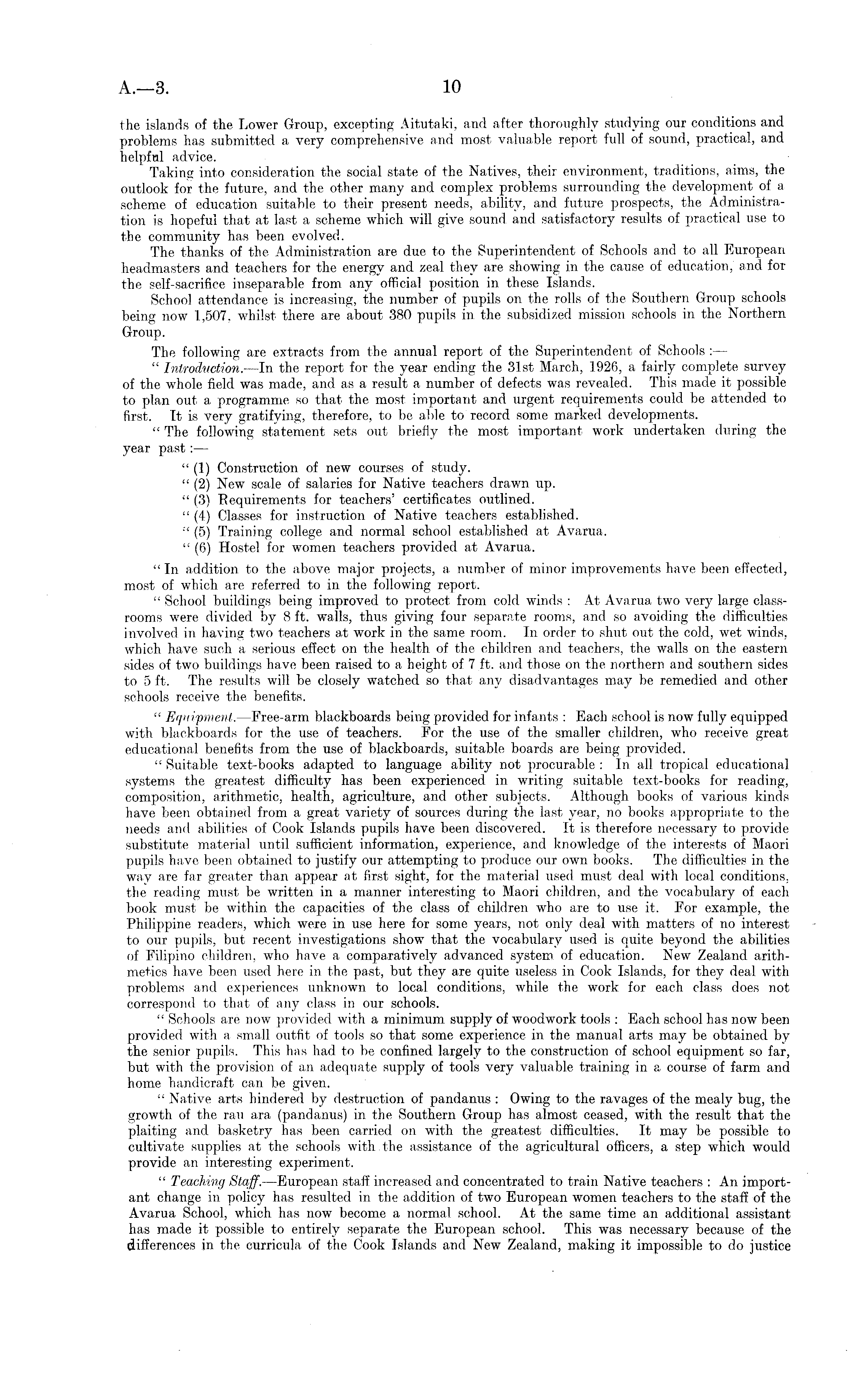 the islands of tie Lower Group, excepting Aitutaki, and after thoroughly studying our conditions and problems has submitted a very comprehensive and most valuable report full of sound, practical, and helpful advice. Taking into consideration the social state of the Natives, their environment, traditions, aims, the outlook for the future, and the other many and complex problems surrounding the development of a scheme of education suitable to their present needs, ability, and future prospects, the Administration is hopeful that at last a scheme which will give sound and satisfactory results of practical use to the community has been evolved. The thanks of the Administration are due to the Superintendent of Schools and to all European headmasters and teachers for the energy and zeal they are showing in the cause of education, and for the self-sacrifice inseparable from any official position in these Islands. School attendance is increasing, the number of pupils on the rolls of the Southern Group schools being now 1,507, whilst there are about 380 pupils in the subsidized mission schools in the Northern Group. The following are extracts from the annual report of the Superintendent of Schools : — " Introduction. —In the report for the year ending the 31st March, 1926, a fairly complete survey of the whole field was made, and as a result a number of defects was revealed. This made it possible to plan out a programme so that the most important and urgent requirements could be attended to first. It is very gratifying, therefore, to be able to record some marked developments. " The following statement sets out briefly the most important work undertaken during the year past: — " (1) Construction of new courses of study. " (2) New scale of salaries for Native teachers drawn up. " (3) Bequirements for teachers' certificates outlined. " (4) Classes for instruction of Native teachers established. " (5) Training college and normal school established at Avarua. " (6) Hostel for women teachers provided at Avarua. " In addition to the above major projects, a number of minor improvements have been effected, most of which are referred to in the following report. " School buildings being improved to protect from cold winds : At Avarua two very large classrooms were divided by 8 ft. walls, thus giving four separate rooms, and so avoiding the difficulties involved in having two teachers at work in the same room. In order to shut out the cold, wet winds, which have such a serious effect on the health of the children and teachers, the walls on the eastern sides of two buildings have been raised to a height of 7 ft. and those on the northern and southern sides to 5 ft. The results will be closely watched so that any disadvantages may be remedied and other schools receive the benefits. " Equipment. —Free-arm blackboards being provided for infants : Each school is now fully equipped with blackboards for the use of teachers. For the use of the smaller children, who receive great educational benefits from the use of blackboards, suitable boards are being provided. " Suitable text-books adapted to language ability not procurable : In all tropical educational systems the greatest difficulty has been experienced in writing suitable text-books for reading, composition, arithmetic, health, agriculture, and other subjects. Although books of various kinds have been obtained from a great variety of sources during the last year, no books appropriate to the needs and abilities of Cook Islands pupils have been discovered. It is therefore necessary to provide substitute material until sufficient information, experience, and knowledge of the interests of Maori pupils have been obtained to justify our attempting to produce our own books. The difficulties in the way are far greater than appear at first sight, for the material used must deal with local conditions, the reading must be written in a manner interesting to Maori children, and the vocabulary of each book must be within the capacities of the class of children who are to use it. For example, the Philippine readers, which were in use here for some years, not only deal with matters of no interest to our pupils, but recent investigations show that the vocabulary used is quite beyond the abilities of Filipino children, who have a comparatively advanced system, of education. New Zealand arithmetics have been used here in the past, but they are quite useless in Cook Islands, for they deal with problems and experiences unknown to local conditions, while the work for each class does not correspond to that of any class in our schools. " Schools are now provided with a minimum supply of woodwork tools : Each school has now been provided with a small outfit of tools so that some experience in the manual arts may be obtained by the senior pupils. This has had to be confined largely to the construction of school equipment so far, but with the provision of an adequate supply of tools very valuable training in a course of farm and home handicraft can be given. " Native arts hindered by destruction of pandanus : Owing to the ravages of the mealy bug, the growth of the rau ara (pandanus) in the Southern Group has almost ceased, with the result that the plaiting and basketry has been carried on with the greatest difficulties. It may be possible to cultivate supplies at the schools with the assistance of the agricultural officers, a step which would provide an interesting experiment. " Teaching Staff. —European staff increased and concentrated to train Native teachers : An important change in policy has resulted in the addition of two European women teachers to the staff of the Avarua School, which has now become a normal school. At the same time an additional assistant has made it possible to entirely separate the European school. This was necessary because of the differences in the curricula of the Cook Islands and New Zealand, making it impossible to do justice