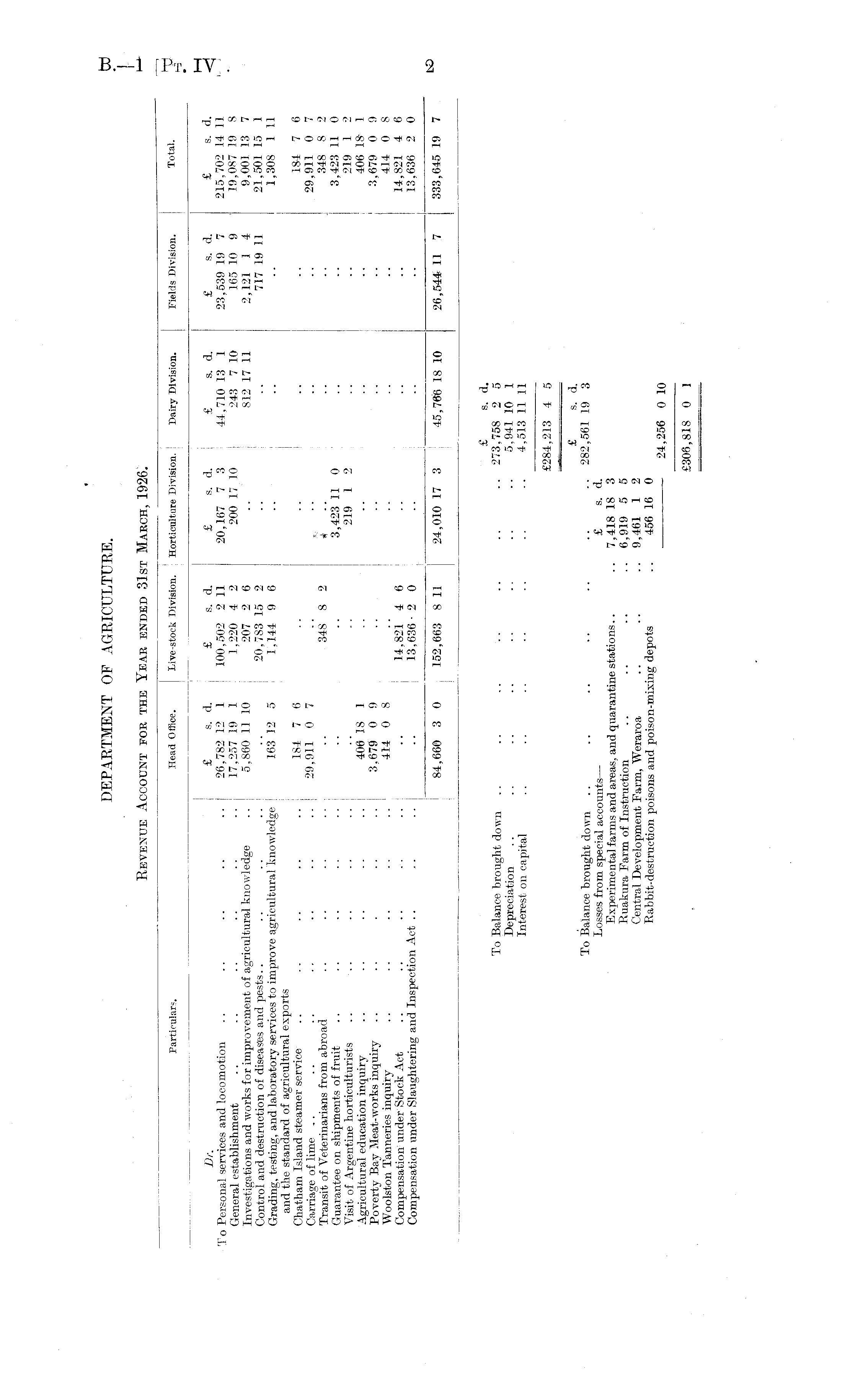 Particulars. Head Office. Live-stock Division. : Horticulture Division. ' Dairy Division. J Fields Division. j Total. Dr. £ s. d. £ s. d. £ s. d. : £ s. d. £ s. d. £ s. d. To Personal services and locomotion .. .. .. .. .. 26,782 12 1 100,502 2 11 20,167 7 3 44,710 13 1 23,539 19 7 215,702 14 11 General establishment .. .. .. •• •• •• 17,257 19 1 1,220 4 2 200 17 10 j 243 7 10 165 10 9 19,087 19 8 Investigations and works for improvement of agricultural knowledge .. 5,860 11 10 207 2 6 .. 812 17 11 2,121 1 4 9,001 13 7 Control and destruction of diseases and pests.. .. .. .. .. 20,783 15 2 .. .. 717 19 11 21,501 15 1 Grading, testing, and laboratory services to improve agricultural knowledge 163 12 5 1,144 9 6 .. .. .. 1,308 1 11 and the standard of agricultural exports Chatham Island steamer service .. .. . • .. • - 184 7 6 .. .. j .. .. 184 7 6 Carriage of lime .. .. .. .. •• .. •• 29,911 0 7 .. .. .. .. 29,911 0 7 Transit of Veterinarians from abroad .. . • .. . • . - 348 8 2 I .. .. 348 8 2 Guarantee on shipments of fruit .. .. .. •• •• .. .. 3,423 11 0 .. .. 3,423 11 0 Visit of Argentine horticulturists .. .. • • .. . . .. .. 219 12 .. .. 219 1 2 Agricultural education inquiry .. .. .. . . .. 406 18 I .. .. .. .. 406 1 Poverty Bay Meat-works inquiry .. .. . .. .. 3,679 0 9 j .. .. .. 3,679 0 9 Woolston Tanneries inquiry .. .. .. •. .. 414 0 8 .. .. .. .. 414 0 8 Compensation under Stock Act .. .. .. . . .. .. j 14,821 4 6 .. .. .. 14,821 4 6 Compensation under Slaughtering and Inspection Act .. ,. .. .. 13,636- 2 0 .. .. .. 13,636 2 0 84,660 3 0 152,663 8 11 24,010 17 3 45,706 18 10 26,544- 11 7 333,645 19 7