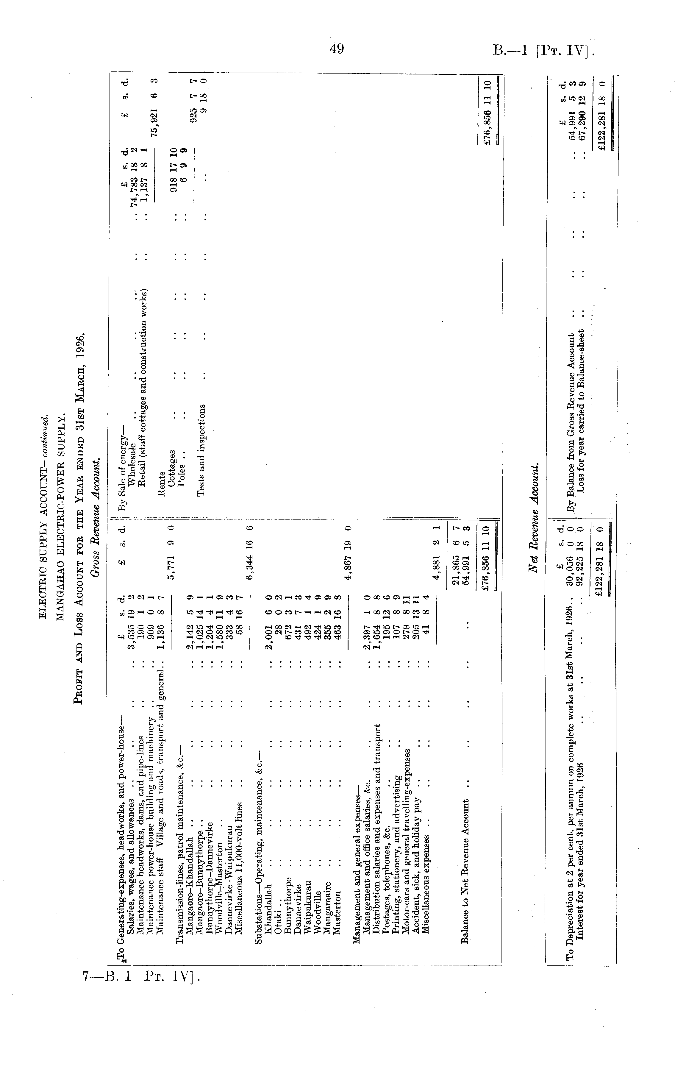 Gross Revenue Account. a To Generating-expenses, headworks, and power-house — £ s. d. £ s. d. By Sale of energy — £ s. d. £ s d Salaries, wages, and allowances .. .. .. .. 3,535 19 2 Wholesale .. .. .. ... ..74 783 18 2 Maintenance headworks, dams, and pipe-lines .. .. 190 1 2 Retail (staff cottages and construction works) .. !! l'137 8 1 Maintenance power-house building and machinery .. .. 909 0 1 __L 75 921 6 3 Maintenance staff —Village and roads, transport and general.. 1,136 8 7 Rents ' 5,771 9 0 Cottages .. .. .. .. .. ,, gjs 17 10 Transmission-lines, patrol maintenance, &c. — Poles .. .. .. .. .. 699 Mangaore-Khandallah .. .. .. .. .. 2,142 5 9 '' "' '' 925 7 7 Mangaore—Bunnythorpe .. .. .. .. .. 1,025 14 1 Tests and inspections .. .. .. .. ., 9180 Bunnythorpe-Dannevirke .. .. .. 1,204 4 1 Woodville-Masterton .. .. .. .. .. 1,580 11 9 Dannevirke-Waipukurau .. .. .. .. 333 4 3 Miscellaneous 11,000- volt lines .. .. .. .. 58 16 7 6,344 16 6 Substations —Operating, maintenance, &c. — Khandallah .. .. .. .. .. .. 2,001 6 0 Otaki .. .. . . .. .. .. .. 28 0 2 Bunnythorpe .. . . .. .. .. .. 672 3 1 Dannevirke .. . . .. .. . . . . 431 7 3 Waipukurau .. .. .. .. .. .. 492 1 4 Woodville . . .. .. .. .. .. 424 1 9 Mangamaire .. .. .. .. .. .. 355 2 9 Masterton .. .. .. .. .. .. 463 16 8 4,867 19 0 Management and general expenses — Management and office salaries, &c. .. .. ..2,39710 Distribution salaries and expenses and transport .. 1,654 8 8 Postages, telephones, &c. .. .. .. .. 195 12 6 Printing, stationery, and advertising .. .. .. 107 8 9 Motor-cars and general travelling-expenses .. .. 279 8 11 Accident, sick, and holiday pay .. .. .. .. 205 13 11 Miscellaneous expenses .. .. .. .. .. 41 8 4 4,881 2 1 21,865 6 7 Balance to Net Revenue Account .. .. .. .. .. 54,991 5 3 £76,856 11 10 £76,856 11 10 Net Revenue Account. , I " ~~ : ! , £ s - d - £ s. d. To Depreciation at 2 per cent, per annum on complete works at 31st March, 1926.. 30,056 0 0 j By Balance from Gross Revenue Account .. .. .. .. .. 54,991 5 3 Interest for year ended 31st March, 1926 .. .. •• •• 92,225 18 0 * Loss for year carried to Balance-sheet .. .. .. .. .. 12 9 £122,281 18 0 . £122,281 18 0