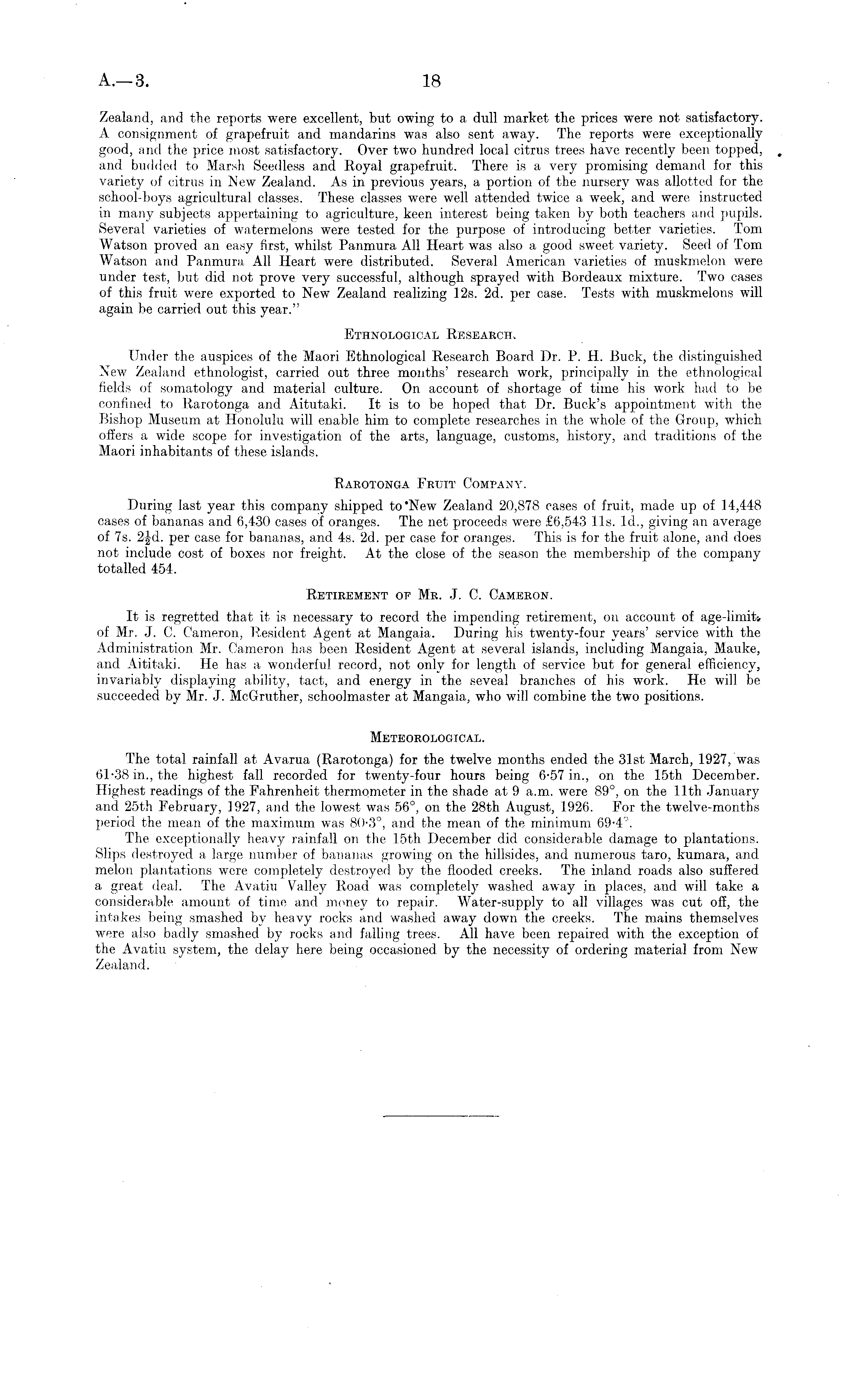 Zealand, and the reports were excellent, but owing to a dull market the prices were not satisfactory. A consignment of grapefruit and mandarins was also sent away. The reports were exceptionally good, and the price most satisfactory. Over two hundred local citrus trees have recently been topped, and budded to Marsh Seedless and Royal grapefruit. There is a very promising demand for this variety of citrus in New Zealand. As in previous years, a portion of the nursery was allotted for the school-boys agricultural classes. These classes were well attended twice a week, and were instructed in many subjects appertaining to agriculture, keen interest being taken by both teachers and pupils. Several varieties of watermelons were tested for the purpose of introducing better varieties. Tom Watson proved an easy first, whilst Panmura All Heart was also a good sweet variety. Seed of Tom Watson and Panmura All Heart were distributed. Several American varieties of muskmelon were under test, but did not prove very successful, although sprayed with Bordeaux mixture. Two cases of this fruit were exported to New Zealand realizing 12s. 2d. per case. Tests with muskmelons will again be carried out this year." Ethnological Research. Under the auspices of the Maori Ethnological Research Board Dr. P. H. Buck, the distinguished New Zealand ethnologist, carried out three months' research work, principally in the ethnological fields of somatology and material culture. On account of shortage of time his work had to be confined to Rarotonga and Aitutaki. It is to be hoped that Dr. Buck's appointment with the Bishop Museum at Honolulu will enable him to complete researches in the whole of the Group, which offers a wide scope for investigation of the arts, language, customs, history, and traditions of the Maori inhabitants of these islands. Rarotonga Fruit Company. During last year this company shipped to' New Zealand 20,878 cases of fruit, made up of 14,448 cases of bananas and 6,430 cases of oranges. The net proceeds were £6,543 lis. Id., giving an average of 7s. 2§d. per case for bananas, and 4s. 2d. per case for oranges. This is for the fruit alone, and does not include cost of boxes nor freight. At the close of the season the membership of the company totalled 454. Retirement of Mr. J. C. Cameron. It is regretted that it is necessary to record the impending retirement, on account of age-limxW of Mr. J. C. Cameron, Resident Agent at Mangaia. During his twenty-four years' service with the Administration Mr. Cameron has been Resident Agent at several islands, including Mangaia, Mauke, and Aititaki. He has a wonderful record, not only for length of service but for general efficiency, invariably displaying ability, tact, and energy in the seveal branches of his work. He will be succeeded by Mr. J. McGruther, schoolmaster at Mangaia, who will combine the two positions. Meteorological. The total rainfall at Avarua (Rarotonga) for the twelve months ended the 31st March, 1927, was 61-38 in., the highest fall recorded for twenty-four hours being 6-57 in., on the 15th December. Highest readings of the Fahrenheit thermometer in the shade at 9 a.m. were 89°, on the 11th January and 25th February, 1927, and the lowest was 56°, on the 28th August, 1926. For the twelve-months period the mean of the maximum was 80-3°, and the mean of the minimum 69-4°. The exceptionally heavy rainfall on the 15th December did considerable damage to plantations. Slips destroyed a large number of bananas growing on the hillsides, and numerous taro, kumara, and melon plantations were completely destroyed by the flooded creeks. The inland roads also suffered a great deal. The Avatiu Valley Road was completely washed away in places, and will take a considerable amount of time and money to repair. Water-supply to all villages was cut off, the intakes being smashed by heavy rocks and washed away down the creeks. The mains themselves were also badly smashed by rocks and falling trees. All have been repaired with the exception of the Avatiu system, the delay here being occasioned by the necessity of ordering material from New Zealand.