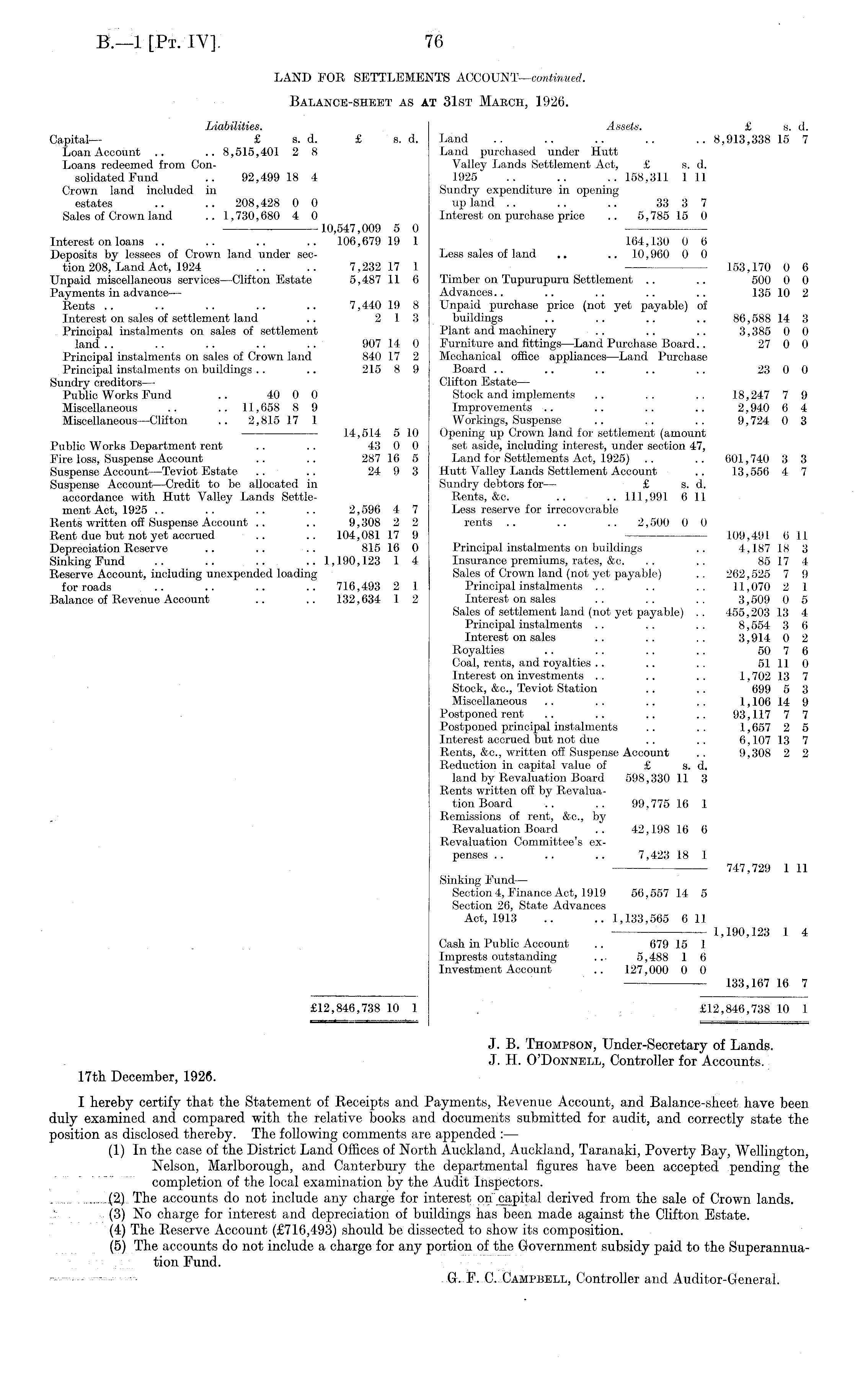 LAND FOR SETTLEMENTS ACCOUNT —continued. Balance-sheet as at 31st March, 1926. Liabilities. Assets. £ s. d. Capital— £ s. d. £ s. d. Land .. .. .. .. .. 8,913,338 15 7 Loan Account .. .. 8,515,401 2 8 Land purchased under Hutt Loans redeemed from Con- Valley Lands Settlement Act, £ s. d. solidated Fund .. 92,499 18 4 1925 .. .. .. 158,311 1 11 Crown land included in Sundry expenditure in opening estates ... .. 208,428 0 0 up land .. .. .. 33 3 7 Sales of Crown land .. 1,730,680 4 0 Interest on purchase price .. 5,785 15 0 10,547,009 5 0 Interest on loans .. .. .. .. 106,679 19 1 164,130 0 6 Deposits by lessees of Crown land under sec- Less sales of land .. .. 10,960 0 0 tion 208, Land Act, 1924 .. .. 7,232 17 1 153,170 0 6 Unpaid miscellaneous services—Clifton Estate 5,487 11 6 Timber on Tupurupuru Settlement .. .. 500 0 0 Payments in advance — Advances.. .. .. .. .. 135 10 2 Rents .. .. .. .. .. 7,440 19 8 Unpaid purchase price (not yet payable) of Interest on sales of settlement land .. 2 13 buildings .. .. .. .. 86,588 14 3 Principal instalments on sales of settlement Plant and machinery .. .. .. 3,385 0 0 land .. .. .. .. .. 907 14 0 Furniture and fittings—Land Purchase Board.. 27 0 0 Principal instalments on sales of Crown land 840 17 2 Mechanical office appliances—Lund Purchase Principal instalments on buildings .. .. 215 8 9 Board .. .. .. .. .. 23 0 0 Sundry creditors — Clifton Estate— Public Works Fund .. 40 0 0 Stock and implements .. .. .. 18,247 7 9 Miscellaneous .. .. 11,658 8 9 Improvements .. .. .. .. 2,940 6 4 Miscellaneous —Clifton .. 2,815 17 1 Workings, Suspense .. .. .. 9,724 0 3 14,514 510 Opening up Crown land for settlement (amount Public Works Department rent .. .. 43 0 0 set aside, including interest, under section 47, Fire loss, Suspense Account .. .. 287 16 5 Land for Settlements Act, 1925) .. .. 601,740 3 3 Suspense Account—Teviot Estate .. .. 24 9 3 Hutt Valley Lands Settlement Account .. 13,556 4 7 Suspense Account —Credit to be allocated in Sundry debtors for— £ s. d. accordance with Hutt Valley Lands Settle- Rents, &c. .. .. 111,991 6 11 ment Act, 1925 .. .. .. .. 2,596 4 7 Less reserve for irrecoverable Rents written ofi Suspense Account .. .. 9,308 2 2 rents .. .. .. 2,500 0 0 Rent due but not yet accrued .. .. 104,081 17 9 109,491 611 Depreciation Reserve .. .. .. 815 16 0 Principal instalments on buildings .. 4,187 18 3 Sinking Fund .. .. .. .. 1,190,123 1 4 Insurance premiums, rates, &c. .. .. 85 17 4 Reserve Account, including unexpended loading Sales of Crown land (not yet payable) .. 262,525 7 9 for roads .. .. .. .. 716,493 2 1 Principal instalments .. .. .. 11,070 2 1 Balance of Revenue Account .. .. 132,634 1 2 Interest on sales .. .. .. 3,509 0 5 Sales of settlement land (not yet payable) .. 455,203 13 4 Principal instalments .. .. . . 8,554 3 6 Interest on sales .. .. .. 3,914 0 2 Royalties .. .. .. .. 50 7 6 Coal, rents, and royalties .. .. .. 51 11 0 Interest on investments .. .. .. 1,702 137 Stock, &c., Teviot Station .. .. 699 5 3 Miscellaneous .. . . .. .. 1,106 14 9 Postponed rent .. .. .. .. 93,117 7 7 Postponed principal instalments .. .. 1,657 2 5 Interest accrued but not due .. .. 6,107 13 7 Rents, &c., written off Suspense Account .. 9,308 2 2 Reduction in capital value of £ s. d. land by Revaluation Board 598,330 11 3 Rents written off by Revaluation Board .. .. 99,775 16 1 Remissions of rent, &c., by Revaluation Board .. 42,198 16 6 Revaluation Committee's expenses .. .. .. 7,423 18 1 747,729 1 11 Sinking Fund — Section 4, Finance Act, 1919 56,557 14 5 Section 26, State Advances Act, 1913 .. .. 1,133,565 6 11 1,190,123 1 4 Cash in Public Account .. 679 15 1 Imprests outstanding ... 5,488 I 6 Investment Account .. 127,000 0 0 133,167 16 7 £12,846,738 10 1 £12,846,738 10 1 J. B. Thompson, Under-Secretary of Lands. J. H. O'Donnell, Controller for Accounts. 17th December, 1926. I hereby certify that the Statement of Receipts and Payments, Revenue Account, and Balance-sheet have been duly examined and compared with the relative books and documents submitted for audit, and correctly state the position as disclosed thereby. The following comments are appended : — (1) In the case of the District Land Offices of North Auckland, Auckland, Taranaki, Poverty Bay, Wellington, Nelson, Marlborough, and Canterbury the departmental figures have been accepted pending the completion of the local examination by the Audit Inspectors. .... _(2) The accounts do not include any charge for interest on capital derived from the sale of Crown lands. (3) No charge for interest and depreciation of buildings has been made against the Clifton Estate. (4) The Reserve Account (£716,493) should be dissected to show its composition. (5) The accounts do not include a charge for any portion of the Government subsidy paid to the Superannuation Fund. - G. P. C. Campbell, Controller and Auditor-General.