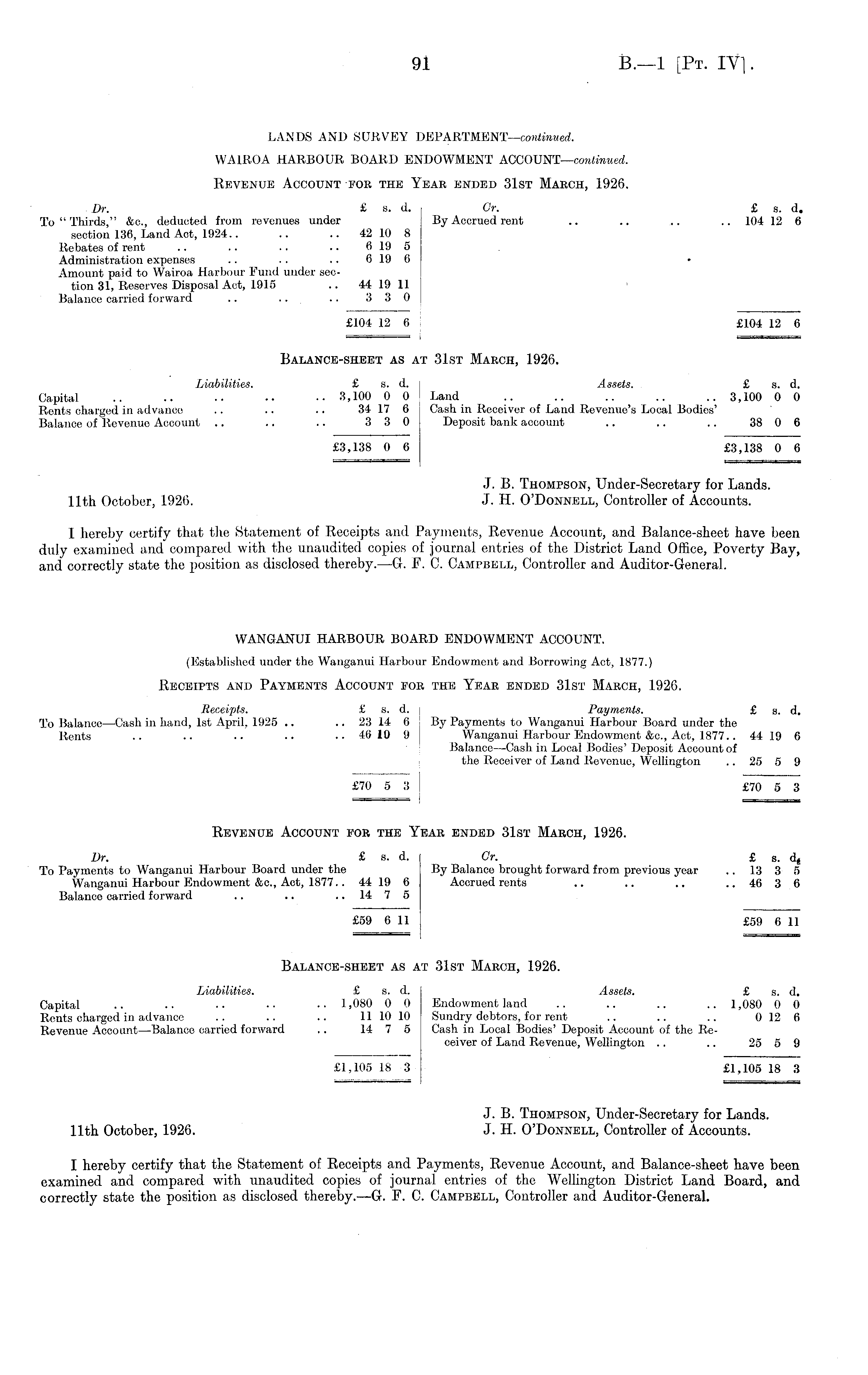 LANDS AND SURVEY DEPARTMENT—continued. WAIROA HARBOUR BOARD ENDOWMENT ACCOUNT—continued. Revenue Account foe the Yeas ended 31st March, 1926. Dr. £ s. d. Gr. £ s. d. To " Thirds," &c., deducted from revenues under By Accrued rent .. .. ~ .. 104 12 6 section 136, Land Act, 1924.. .. .. 42 10 8 Rebates of rent .. .. .. .. 6 19 5 Administration expenses ...... 6 19 6 • Amount paid to Wairoa Harbour Fund under section 31, Reserves Disposal Act, 1915 .. 44 19 11 Balance carried forward .. .. .. 3 3 0 £104 12 6 , £104 12 6 =» i r ■ — Balance-sheet as at 31st March, 1926. Liabilities. £ s. d. Assets. £ s. d. Capital .. .. .. •• •• 3,100 0 0 Land .. .. .. .. .. 3,100 0 0 Rents charged in advance .. .. .. 34 17 6 Cash in Receiver of Land Revenue's Local Bodies' Balance of Revenue Account .. .. .. 3 3 0 Deposit bank account .. .. .. 38 0 6 £3,138 0 6 £3,138 0 6 J. B. Thompson, Under-Secretary for Lands. 11th October, 1926. J. H. O'Donnell, Controller of Accounts. 1 hereby certify that the Statement of Receipts and Payments, Revenue Account, and Balance-sheet have been duly examined and compared with the unaudited copies of journal entries of the District Land Office, Poverty Bay, and correctly state the position as disclosed thereby.—G. P. C. Campbell, Controller and Auditor-General. WANGANUI HARBOUR BOARD ENDOWMENT ACCOUNT. (Established under the Wanganui Harbour Endowment and Borrowing Act, 1877.) Receipts and Payments Account for the Year ended 31st March, 1926. Receipts. £ s. d. Payments. £ s. d. To Balance —Cash in hand, Ist April, 1925 .. .. 23 14 6 By Payments to Wanganui Harbour Board under the Rents .. .. .. .. .. 46 10 9 Wanganui Harbour Endowment &c., Act, 1877.. 44 19 6 Balance—Cash in Local Bodies' Deposit Account of the Receiver of Land Revenue, Wellington 25 5 9 £70 5 3 £70 5 3 Revenue Account for the Year ended 31st March, 1926. Dr. £ S. d. Gr. £ s . d 4 To Payments to Wanganui Harbour Board under the By Balance brought forward from previous year .. 13 3 5 Wanganui Harbour Endowment &c., Act, 1877.. 44 19 6 Accrued rents .. .. .. .. 46 3 6 Balance carried forward .. .. 14 7 5 £59 6 11 £59 6 11 Balance-sheet as at 31st March, 1926. Liabilities. £ s. d. Assets. £ s. d. Capital .. .. .. •• 1,080 0 0 Endowment land .. .. .. .. 1,080 0 0 Rents charged in advance .. .. .. 11 10 10 Sundry debtors, for rent .. .. .. 012 6 Revenue Account —Balance carried forward .. 14 7 5 Cash in Local Bodies' Deposit Account of the Receiver of Land Revenue, Wellington .. .. 25 5 9 £1,105 18 3 £1,105 18 3 J. B. Thompson, Under-Secretary for Lands. 11th October, 1926. J. H. O'Donnell, Controller of Accounts. I hereby certify that the Statement of Receipts and Payments, Revenue Account, and Balance-sheet have been examined and compared with unaudited copies of journal entries of the Wellington District Land Board, and correctly state the position as disclosed thereby. —G. F. C. Campbell, Controller and Auditor-General.