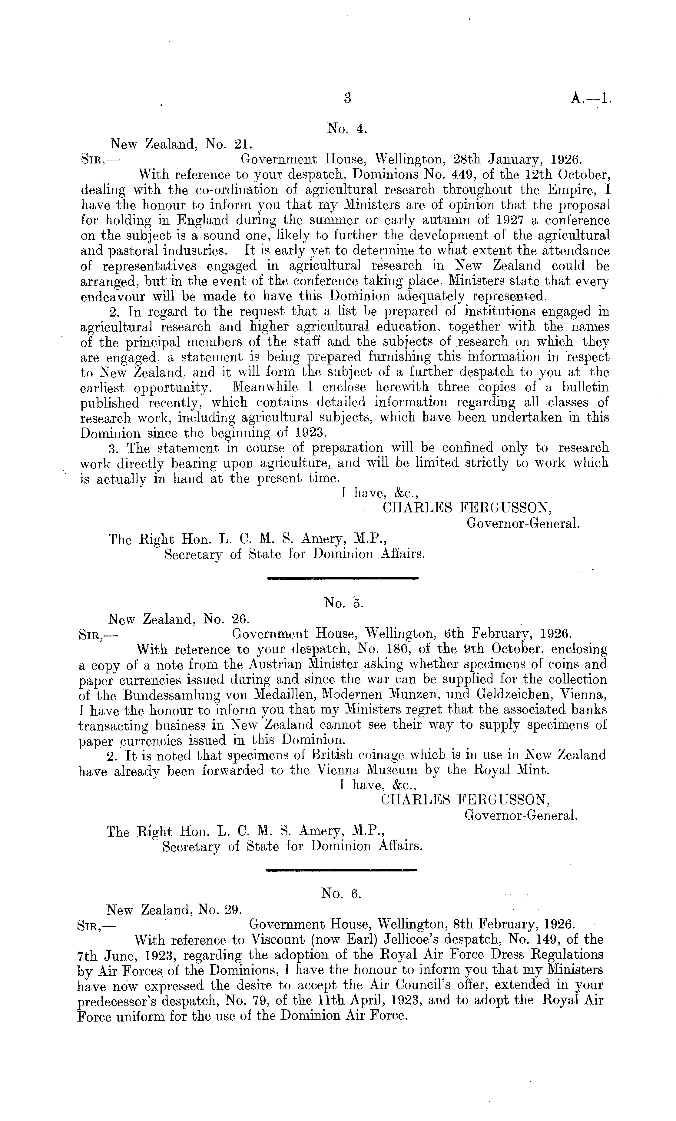 New Zealand, No. 21. Sir, —- Government House, Wellington, 28tli January, 1926. With reference to your despatch, Dominions No. 449, of the 12th October, dealing with the co-ordination of agricultural research throughout the Empire, I have the honour to inform you that my Ministers are of opinion that the proposal for holding in England during the summer or early autumn of 1927 a conference on the subject is a sound one, likely to further the development of the agricultural and pastoral industries. It is early yet to determine to what extent the attendance of representatives engaged in agricultural research in New Zealand could be arranged, but in the event of the conference taking place, Ministers state that every endeavour will be made to have this Dominion adequately represented. 2. In regard to the request that a list be prepared of institutions engaged in agricultural research and higher agricultural education, together with the names of the principal members of the staff and the subjects of research on which they are engaged, a statement is being prepared furnishing this information in respect to New Zealand, and it will form the subject of a further despatch to you at the earliest opportunity. Meanwhile I enclose herewith three copies of a bulletin published recently, which contains detailed information regarding all classes of research work, including agricultural subjects, which have been undertaken in this Dominion since the beginning of 1923. 3. The statement in course of preparation will be confined only to research work directly bearing upon agriculture, and will be limited strictly to work which is actually in hand at the present time. I have, &c., CHARLES FERGUSSON, Governor-General. The Right Hon. L. C. M. S. Amery, M.P., Secretary of State for Dominion Affairs.