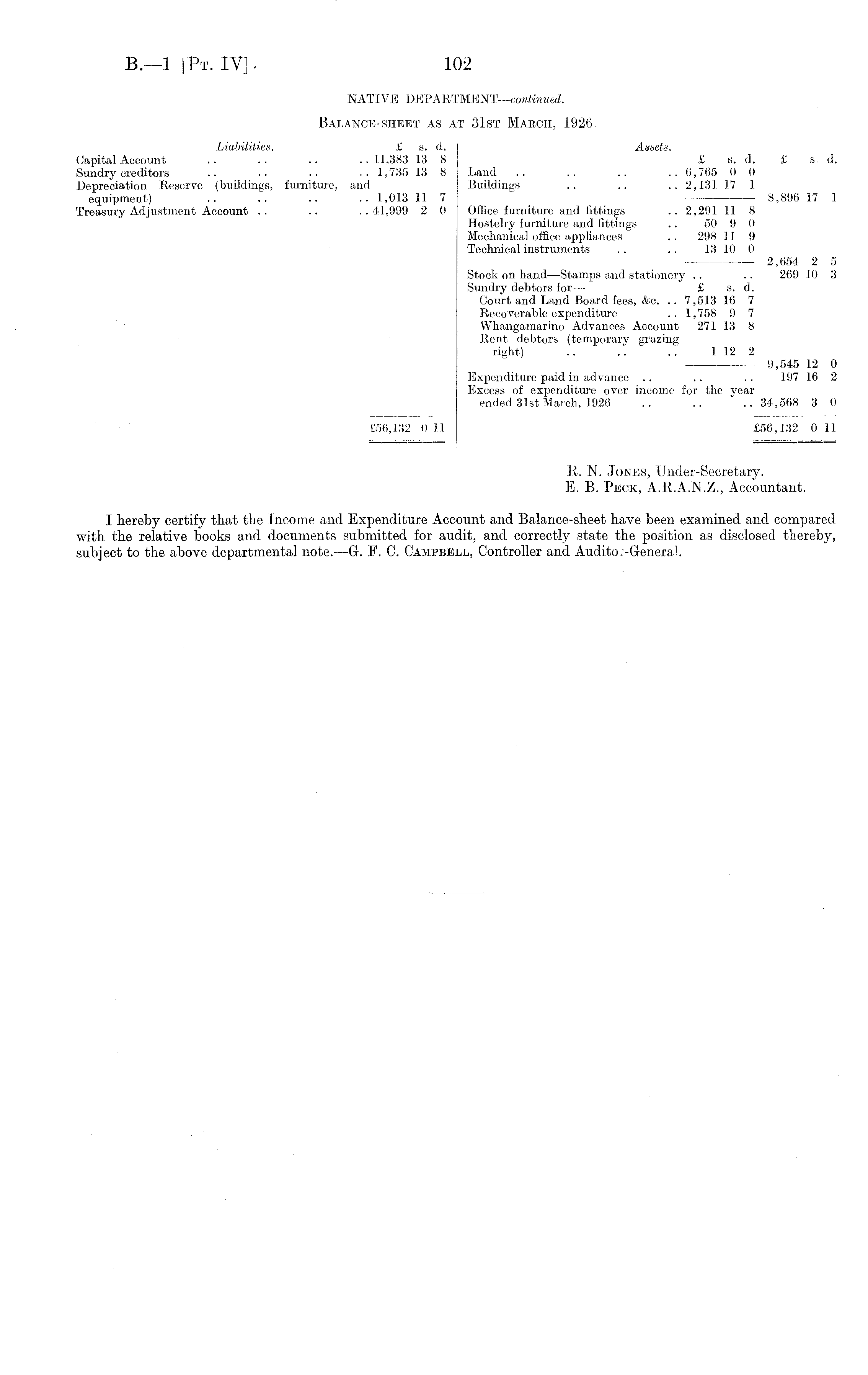 NATIVE DEPARTMENT—continued. Balance-sheet as at 31st March, 1926. Liabilities. £ s. d. Assets. Capital Account .. .. .. .. 11,383 13 8 £ s. d. £ s. d. Sundry creditors .. . . .. . . 1,735 13 8 Land .. .. .. .. 6,765 0 0 Depreciation Reserve (buildings, furniture, and Buildings .. .. .. 2,131 17 1 equipment) .. .. .. .. 1,013 11 7 8,896 17 1 Treasury Adjustment Account .. .. ..41,999 2 0 Office furniture and fittings .. 2,291 11 8 Hostelry furniture and fittings .. 50 9 0 Mechanical office appliances .. 298 11 9 Technical instruments .. .. 13 10 0 2,654 2 5 Stock on hand—Stamps and stationery .. .. 269 10 3 Sundry debtors for — £ s. d. Court and Land Board fees, &c. .. 7,513 16 7 Recoverable expenditure ..1,758 9 7 Whangamarino Advances Account 271 13 8 Rent debtors (temporary grazing right) .. .. .. 1 12 2 ; 9,545 12 0 Expenditure paid in advance .. .. .. 197 16 2 Excess of expenditure over income for the year ended 31st March, 1926 .. .. .. 34,568 3 0 £56,132 0 11 £56,132 0 11 R. N. Jones, Under-Secretary. E. B. Peck, A.K.A.N.Z., Accountant. I hereby certify tliat the Income and Expenditure Account and Balance-sheet have been examined and compared with the relative books and documents submitted for audit, and correctly state the position as disclosed thereby, subject to the above departmental note. —Gr. F. C. Campbell, Controller and Audito."-General.