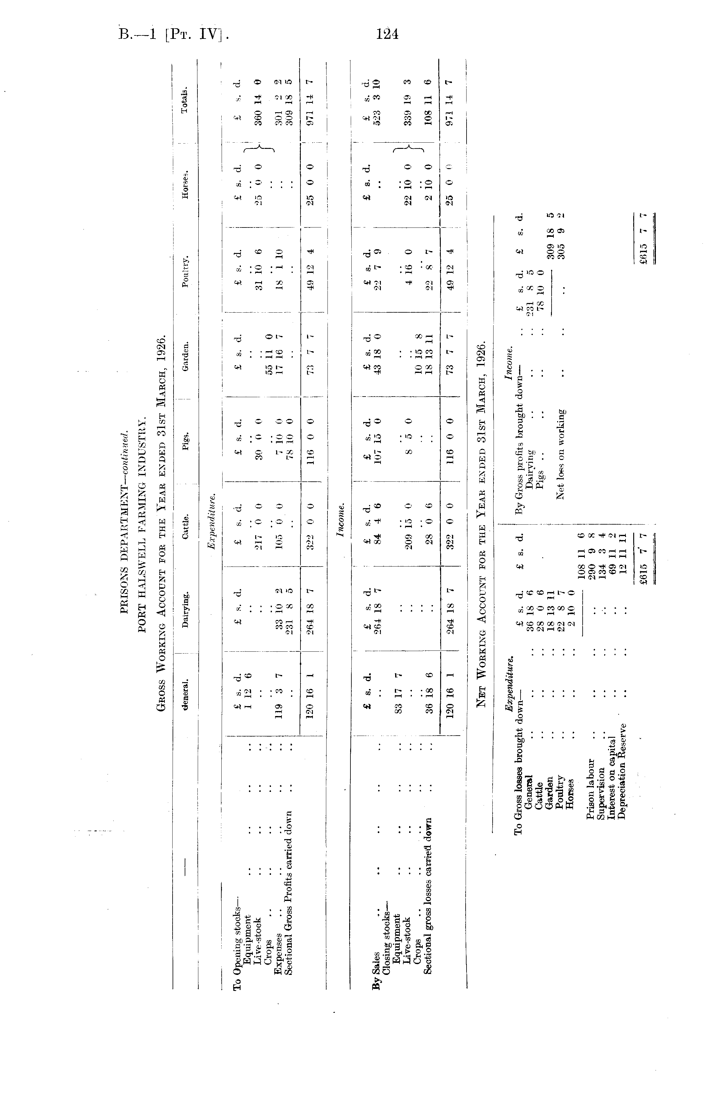 Net Working Account foe the Year ended 31st March, 1926. Expenditure. Income. To Gross losses brought down— £ s. d. £ s. d. By Gross profits brought down— .. £ s. d. £ s. d. General .. .. .. 36 18 6 Dairying .. .. .. 231 8 5 Cattle .. .. 28 0 6 Pigs" .. .. .. .. 78 10 0 Garden .. .. .. 18 13 11 309 18 5 Poultry .. .. .. 22 8 7 Net loss on working .. .. .. 305 9 2 Horses .. .. .. 2 10 0 108 11 6 Prison labour .. .. .. .. 290 9 8 Supervision .. .. .. ... 134 3 4 Interest on capital .. .. .. 69 11 2 Depreciation Reserve .. .. .. 12 11 11 £615 7' 7 £615 7 7