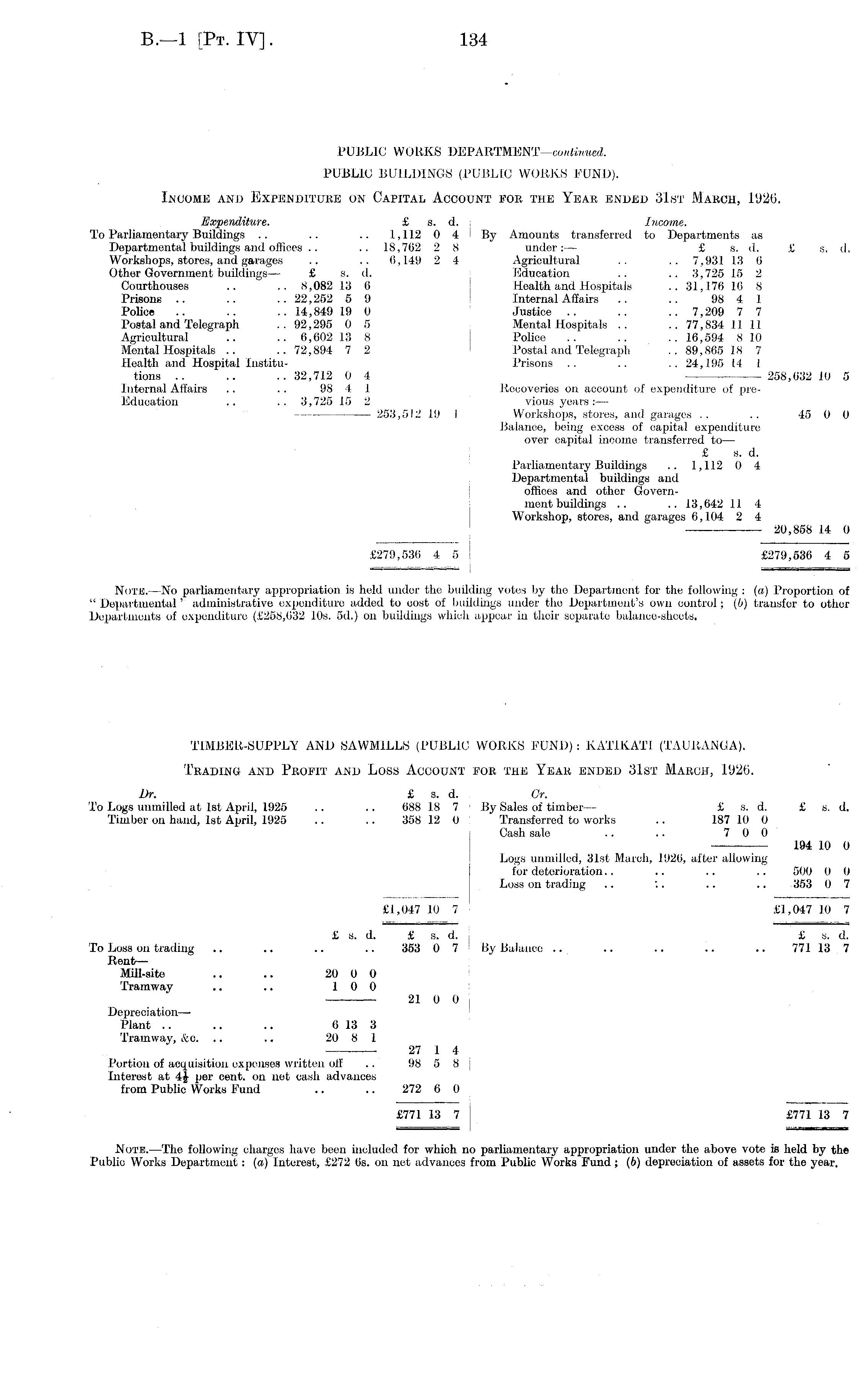 PUBLIC WORKS DEPARTMENT—continued. PUBLIC BUILDINGS (PUBLIC WORKS FUND). Income and Expenditure on Capital Account for the Year ended 31st March, 1 ( J26. Expenditure. £ s. d. i Income. To Parliamentary Buildings .. .. .. 1,112 0 4 By Amounts transferred to Departments as Departmental buildings and offices .. .. 18,762 2 8 under: — £ s. d. £ s. d. Workshops, stores, and garages .. .. 6,149 2 4 Agricultural .. .. 7,931 13 6 Other Government buildings— £ s. d. Education .. .. 3,725 15 2 Courthouses .. .. 8,082 13 6 ; Health and Hospitals .. 31,176 16 8 Prisons .. .. .. 22,252 5 9 Internal Affairs .. .. 98 4 1 Police .. .. .. 14,849 19 0 Justice .. .. .. 7,209 7 7 Postal and Telegraph .. 92,295 0 5 Mental Hospitals .. .. 77,834 11 11 Agricultural .. .. 6,602 13 8 Police .. .. .. 16,594 810 Mental Hospitals .. .. 72,894 7 2 1 Postal and Telegraph .. 89,865 18 7 Health and Hospital Institu- Prisons .. .. .. 24,195 14 1 tions .. .. .. 32,712 0 4 258,632 10 5 Internal Affairs .. . . 98 4 1 Recoveries on account of expenditure of preEducation .. .. 3,725 15 2 vious years:— 253,512 19 1 Workshops, stores, and garages .. .. 45 0 0 Balance, being excess of capital expenditure over capital income transferred to — £ s. d. Parliamentary Buildings .. 1,112 0 4 Departmental buildings and offices and other Government buildings .. .. 13,642 II 4 Workshop, stores, and garages 6,104 2 4 20,858 14 0 £279,536 4 5 1 £279,536 4 5 Note. —No parliamentary appropriation is held under the building votes by the Department for the following : (a) Proportion of " Departmental' administrative expenditure added to cost of buildings under the Department's own control; (0) transfer to other Departments of expenditure (£258,632 10s. 5d.) on buildings which appear in their separate balance-sheets. TIMBER-SUPPLY AND SAWMILLS (PUBLIC WORKS FUND): KATIKATI (TAURANGA). Trading and Profit and Loss Account for the Year ended 31st March, 1926. Dr. £ s. d. Gr. To Logs unmilled at Ist April, 1925 .. .. 688 18 7 By Sales of timber — £ s. d. £ s. d. Timber on hand, Ist April, 1925 .. .. 358 12 0 Transferred to works .. 187 10 0 Cash sale .. .. 7 0 0 194 io 0 Logs unmilled, 31st March, 1926, after allowing for deterioration.. .. .. .. 500 0 0 Loss on trading .. '.. .. .. 353 0 7 £1,047 10 7 £1,047 10 7 £ s. d. £ s. d. £ s. d. To Loss on trading .. .. .. .. 353 0 7 By Balance .. .. .. .. .. 771 13 7 Rent— Mill-site .. .. 20 0 0 Tramway .. .. 10 0 21 0 0 Depreciation— Plant .. .. .. 6 13 3 Tramway, &c. .. .. 20 8 1 27 I 4 Portion of acquisition expenses written off .. 98 5 8 Interest at 4£ per cent, on net cash advances from Public Works Fund .. .. 272 6 0 £771 13 7 I £771 13 7 : Note. —The following charges have been included for which no parliamentary appropriation under the above vote is held by the Public Works Department : (a) Interest, £272 6s. on net advances from Public Works Fund; (6) depreciation of assets for the year.