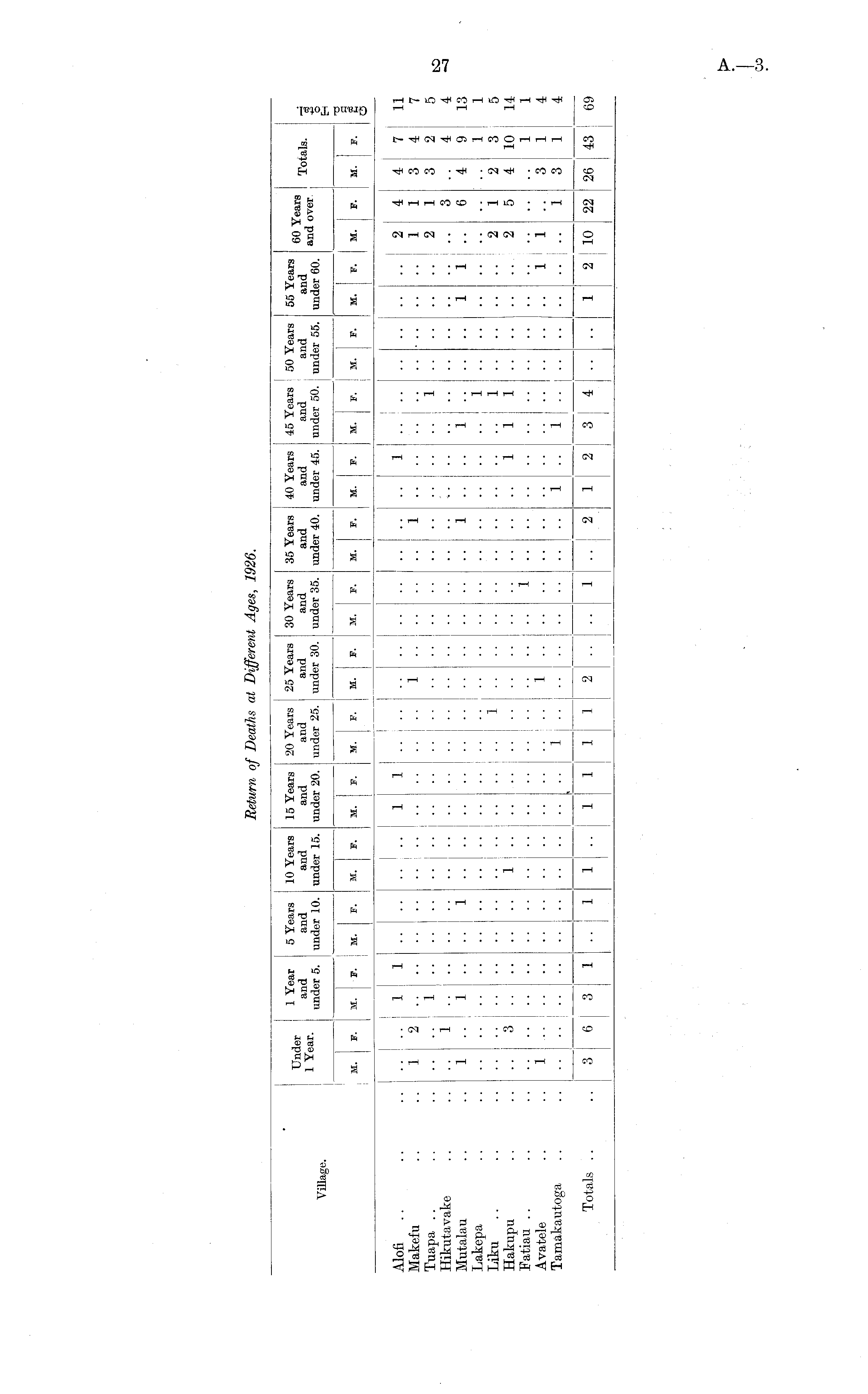 j TT , 1 Year 5 Years 10 Years 15 Years 20 Years 25 Years 30 Years 35 Years 40 Years 45 Years 50 Years 55 Years fift v , er and and and and and and and and and and and and , ears Totals. ear ' under 5. under 10. under 15. under 20. under 25. under 30. under 35. under 40. under 45. under 50. under 55. under 60. an OTer -g village. j En _ : — - - , rs I ■ . . rQ i a M. F. M. F. M. F. M. F. M. F. M. F. M. F. M. F. M. F. M. F. M. F. ' M. F. M. F. M. F. M. F. g i e> Alofi .. .. 1 1 1 1 1 2 4 4 7 11 Makefu .. .. 1 2 1 1 1 1 3 4 7 Tuapa .. .. 1 1 2 1 3 2 5 Hikutavake .. .. .. 1 | i j .. 3 .. 4 4 Mutalau .. .. 1 .. 1 .. .. 1 1 .. .. 1 1 1 .. 6 4 9 13 Lakepa .. 1 1 1 Liku .. .. : 1 1 2 1 2 3 5 Hakupu .. .. .. 3 1 1 1 1 2 5 4 10 14 Fatiau .. .. 1 1 1 Avatele .. .. 1 1 1 1 .. 3 1 4 Tamakautoga .. | 1 1 .. 1 j .. 1 3 1 4 Totals .. .. 3 6 3 1 .. 1 1 .. 1 1 1 1 2 .. .. 1 .. 2 1 2 3 4 .. .. 1 2 | 10 22 26 43 69