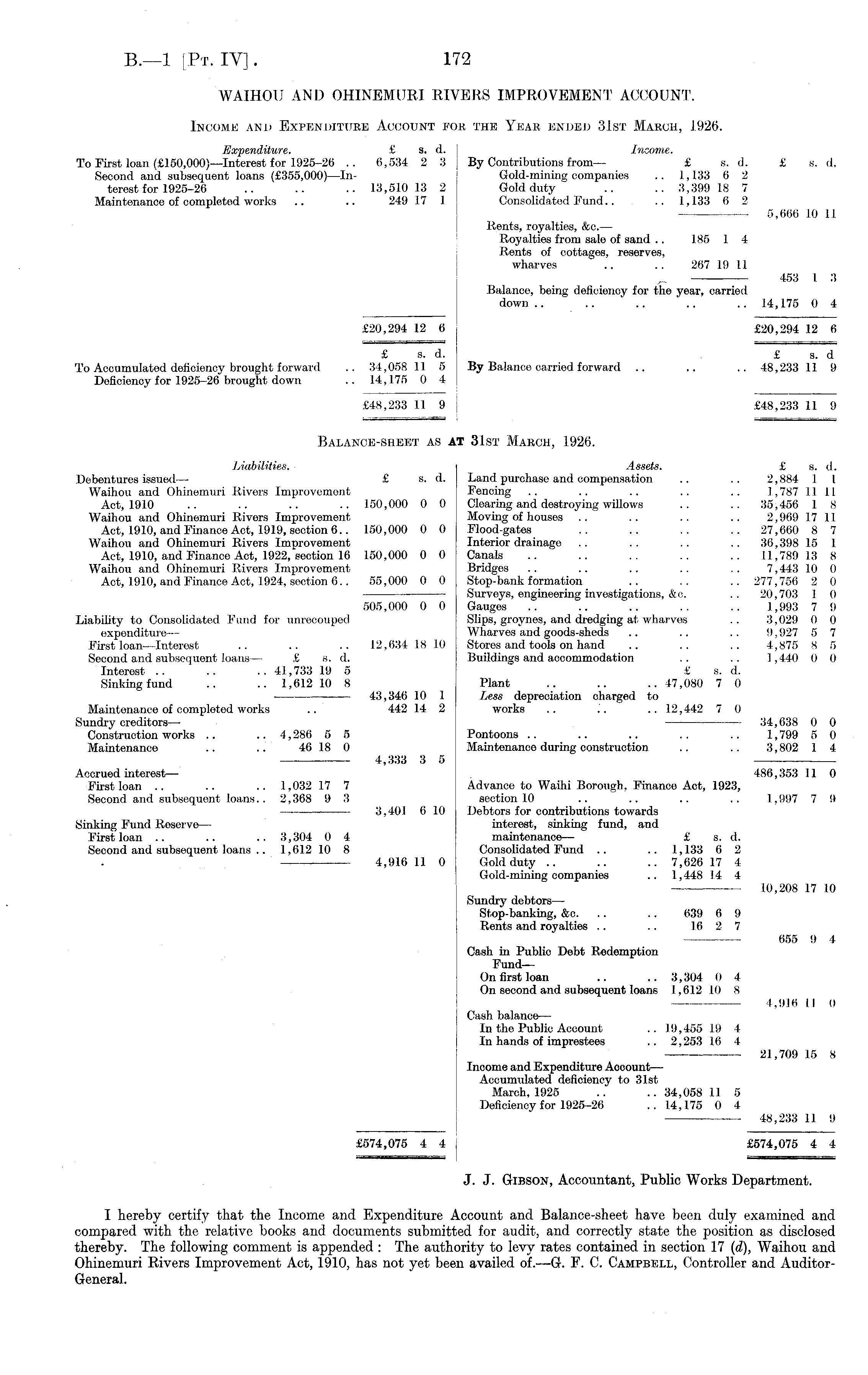 WAIHOU AND OHINEMURI RIVERS IMPROVEMENT ACCOUNT. Income and Expenditure Account fob the Year ended 31st March, 1926. Expenditure. £ s. d. Income. To First loan (£150,000) —Interest for 1925-26 .. 6,534 2 3 By Contributions from— £ s. d. £ s. d. Second and subsequent loans (£355,000) —In- Gold-mining companies .. 1,133 6 2 terest for 1925-26 .. .. .. 13,510 13 2 Gold duty .. .. 3,399 18 7 Maintenance of completed works .. .. 249 17 1 Consolidated Fund.. .. 1,133 6 2 5,666 10 11 Rents, royalties, &c.— Royalties from sale of sand .. 185 1 4 Rents of cottages, reserves, wharves .. .. 267 19 11 .... — 453 I 3 Balance, being deficiency for the year, carried down .. .. .. .. .. 14,175 0 4 £20,294 12 6 £20,294 12 6 £ s. d. £ s. d To Accumulated deficiency brought forward .. 34,058 11 5 By Balance carried forward .. .. .. 48,233 .11 9 Deficiency for 1925-26 brought down .. 14,175 0 4 £48,233 11 9 £48,233 11 9 Balance-sheet as at 31st March, 1926. Liabilities. Assets. £ s. d. Debentures issued — £ s. d. Land purchase and compensation .. .. 2,884 1 1 Waihou and Ohinemuri Rivers Improvement Fencing .. .. .. .. .. 1,787 11 11 Act, 1910 .. .. .. .. 150,000 0 0 Clearing and destroying willows .. .. 35,456 1 8 Waihou and Ohinemuri Rivers Improvement Moving of houses .. .. .. .. 2,969 17 11 Act, 1910, and Finance Act, 1919, section 6.. 150,000 0 0 Flood-gates .. .. .. .. 27,660 8 7 Waihou and Ohinemuri Rivers Improvement Interior drainage .. .. .. .. 36,398 15 1 Act, 1910, and Finance Act, 1922, section 16 150,000 0 0 Canals .. .. .. .. .. 11,789 13 8 Waihou and Ohinemuri Rivers Improvement Bridges .. .. .. .. .. 7,443 10 0 Act, 1910, and Finance Act, 1924, section 6.. 55,000 0 0 Stop-bank formation .. .. .. 277,756 2 0 Surveys, engineering investigations, &c. .. 20,703 1 0 505,000 0 0 Gauges .. .. .. .. .. 1,993 7 9 Liability to Consolidated Fund for unrecouped Slips, groynes, and dredging at wharves .. 3,029 0 0 expenditure— Wharves and goods-sheds .. .. .. 9,927 5 7 First loan —Interest .. .. .. 12,634 18 10 Stores and tools on hand .. .. .. 4,875 8 5 Second and subsequent loans— £ s. d. Buildings and accommodation .. .. 1,440 0 0 Interest .. .. .. 41,733 19 5 £ s. d. Sinking fund .. .. 1,612 10 8 Plant .. .. .. 47,080 7 0 43,346 10 1 Less depreciation charged to Maintenance of completed works .. 442 14 2 works .. .. .. 12,442 7 0 Sundry creditors—■ — 34,638 0 0 Construction works .. .. 4,286 5 5 Pontoons .. .. .. .. .. 1,799 5 0 Maintenance .. .. 46 18 0 Maintenance during construction .. .. 3,802 1 4 4,333 3 5 Accrued interest— 486,353 11 0 First loan .. .. .. 1,032 17 7 Advance to Waihi Borough, Finance Act, 1923, Second and subsequent loans.. 2,368 9 3 section 10 .. .. .. .. 1,997 7 9 3,401 6 10 Debtors for contributions towards Sinking Fund Reserve — interest, sinking fund, and First loan .. .. .. 3,304 0 4 maintenance— £ s. d. Second and subsequent loans .. 1,612 10 8 Consolidated Fund .. .. 1,133 6 2 4,916 11 0 Gold duty .. .. .. 7,626 17 4 Gold-mining companies .. 1,448 14 4 10,208 17 10 Sundry debtors— Stop-banking, &c. .. .. 639 6 9 Rents and royalties .. .. 16 2 7 655 9 4 Cash in Public Debt Redemption FundOn first loan .. .. 3,304 0 4 On second and subsequent loans 1,612 10 8 — 4,916 II 0 Cash balance — In the Public Account .. 19,455 19 4 In hands of imprestees .. 2,253 16 4 — 21,709 15 8 Income and Expenditure Aeoount— Accumulated deficiency to 31st March, 1925 .. .. 34,058 11 5 Deficiency for 1925-26 .. 14,175 0 4 48,233 11 9 £574,075 4 4 £574,075 4 4 J. J. Gibson, Accountant, Public Works Department. I hereby certify that the Income and Expenditure Account and Balance-sheet have been duly examined and compared with the relative books and documents submitted for audit, and correctly state the position as disclosed thereby. The following comment is appended : The authority to levy rates contained in section 17 (d), Waihou and Ohinemuri Rivers Improvement Act, 1910, has not yet been availed of.—-G. F. C. Campbell, Controller and AuditorGeneral.