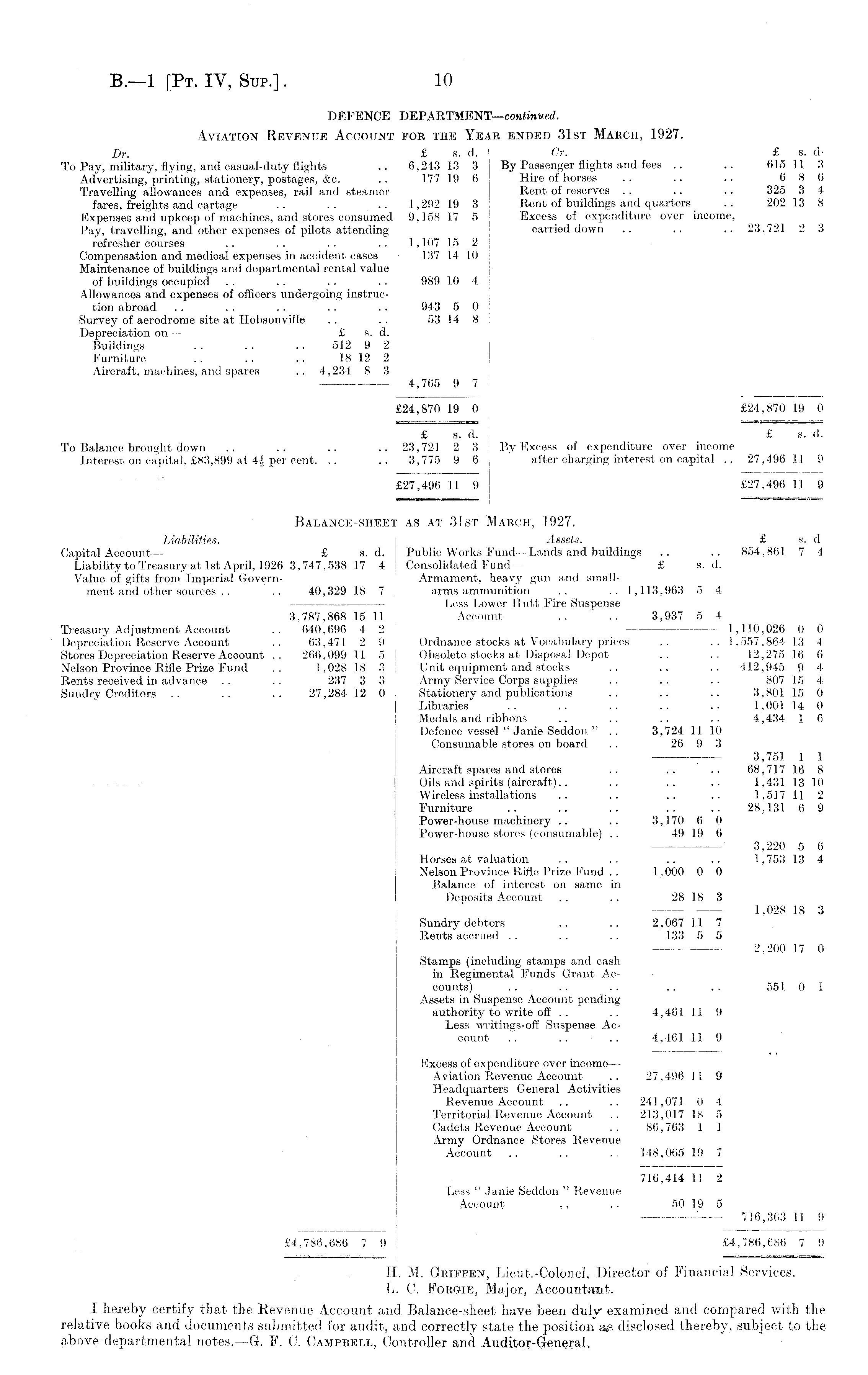 DEFENCE DEPARTMENT —continued. Aviation Revenue Account for the Year ended 31st March, 1927. Dr. £ s. d. i Cr. £ s. dTo Pay, military, flying, and casual-duty flights .. 6,243 13 3 By Passenger flights and fees .. .. 615 11 3 Advertising, printing, stationery, postages, &c. .. 177 19 6 Hire of horses .. .. .. 6 8 6 Travelling allowances and expenses, rail and steamer Rent of reserves .. .. .. 325 3 4 fares, freights and cartage .. .. .. 1,292 19 3 Rent of buildings and quarters .. 202 13 8 Expenses and upkeep of machines, and stores consumed 9,158 17 5 ; Excess of expenditure over income, Pay, travelling, and other expenses of pilots attending carried down . . .. 23,721 2 3 refresher courses . . . . . . . . 1,107 15 2 Compensation and medical expenses in accident cases 137 14 10 Maintenance of buildings and departmental rental value of buildings occupied . . .. .. .. 989 10 4 Allowances and expenses of officers undergoing instruction abroad . . .. . . . . . . 943 5 0 Survey of aerodrome site at Hobsonville . . .. 53 14 8 Depreciation on— £ s. d. Buildings .. .. .. 512 9 2 Furniture .. .. .. 18 12 2 Aircraft, machines, and spares .. 4,234 8 3 4,765 9 7 £24,870 19 0 £24,870 19 0 £ s. d. £ s. d. To Balance brought down .. .. .. .. 23,721 2 3 By Excess of expenditure over income Interest on capital, £83,899 at 4£ per cent. .. .. 3,775 9 6 after charging interest on capital .. 27,496 11 9 £27,496 11 9 J £27,496 II 9 Balance-sheet as at 31st March, 1927. Liabilities. \ Assets. £ s. d Capital Account— £ s. d. Public Works Fund —Lands and buildings .. .. 854,861 7 4 Liability to Treasury at Ist April, 1926 3,747,538 17 4 j Consolidated Fund— £ s. d. Value of gifts from Imperial Govern- Armament, heavy gun and smallment and other sources . . .. 40,329 18 7 arms ammunition .. .. 1,113,963 5 4 Less Lower Hutt Fire Suspense 3,787,868 15 11 Account .. .. 3,937 5 4 Treasury Adjustment Account .. 640,696 4 2 1,110,026 0 0 Depreciation Reserve Account .. 63,471 2 9 Ordnance stocks at Vocabulary prices .. .. 1,557,864 13 4 Stores Depreciation Reserve Account .. 266,099 II 5 1 Obsolete stocks at Disposal Depot .. .. 12,275 16 6 Nelson Province Rifle Prize Fund .. 1,028 18 3 j Unit equipment and stocks .. .. .. 412,945 9 4 Rents received in advance . . . . 237 3 3 Army Service Corps supplies .. . . .. 807 15 4 Sundry Creditors .. .. .. 27,284 12 0 Stationery and publications .. .. .. 3,801 15 0 Libraries .. .. .. .. .. 1,001 14 0 Medals and ribbons .. .. .. . . 4,434 1 6 Defence vessel " Janie Seddon " .. 3,724 11 10 Consumable stores on board . . 26 9 3 3,751 i i Aircraft spares and stores .. .. .. 68,71716 8 Oils and spirits (aircraft).. .. .. .. 1,431 13 10 Wireless installations .. .. .. .. 1,517112 Furniture .. .. .. .. .. 28,131 6 9 Power-house machinery .. .. 3,170 6 0 Power-house stores (consumable) .. 49 19 6 3,220 5 6 Horses at valuation .. .. .. .. 1,753 13 4 Nelson Province Rifle Prize Fund .. 1,000 0 0 Balance of interest on same in Deposits Account .. .. 28 18 3 1,028 18 3 Sundry debtors .. . . 2,067 11 7 Rents accrued . . . . .. 133 5 5 2,200 17 0 Stamps (including stamps and cash in Regimental Funds Grant Accounts) .. .. .. .. .. 551 0 1 Assets in Suspense Account pending authority to write off .. .. 4,461 11 9 Less writings-off Suspense Account . . .. .. 4,461 11 9 Excess of expenditure over income— Aviation Revenue Account .. 27,496 II 9 Headquarters General Activities Revenue Account .. .. 241,071 0 4 Territorial Revenue Account .. 213,017 18 5 Cadets Revenue Account . . 86,763 I I Army Ordnance Stores Revenue Account .. .. .. 148,065 19 7 716,414 11 2 Less " Janie Seddon " Revenue Account i. . • 50 19 5 —_• 716,363 11 9 £4,786.686 7 9! £4,786,686 7 9 -- - | =«= H. M. Griffen, Lieut.-Colonel, Director of Financial Services. L. 0. Forgie, Major, Accountant. I hereby certify that the Revenue Account and Balance-sheet have been duly examined and compared with the relative books and documents submitted for audit, and correctly state the position as disclosed thereby, subject to the above departmental notes. —6. F. 0. Campbell, Controller and Auditor-General,