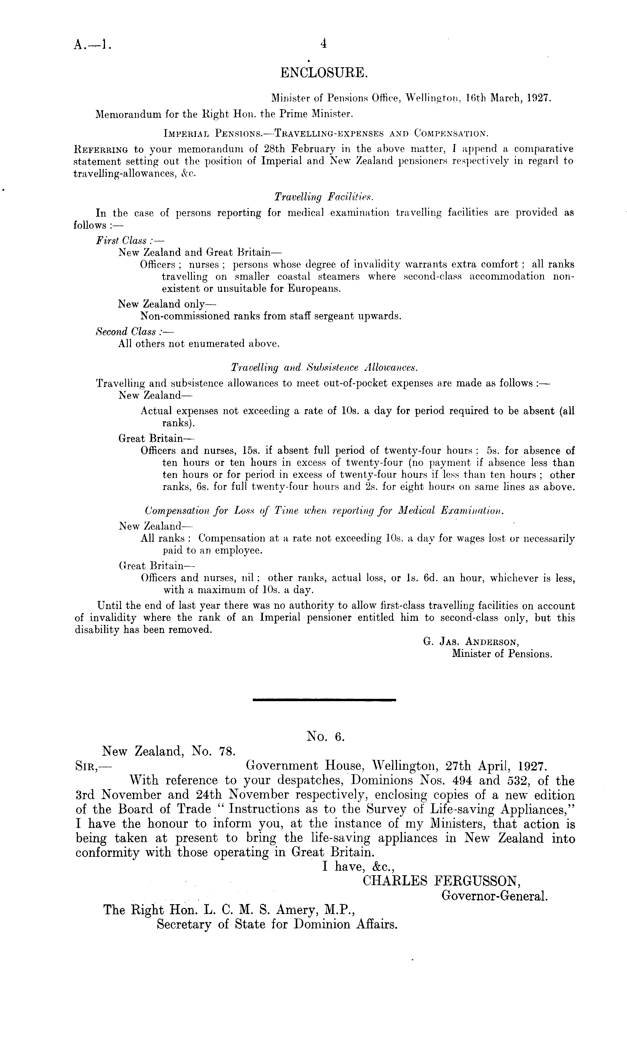 ENCLOSURE. Minister of Pensions Office, Wellington, 16th March, 1927. Memorandum for the Right- Hon. the Prime Minister. Imperial Pensions.—Travelling-expenses and Compensation. Referring to your memorandum of 28th February in the above matter, I append a comparative statement setting out the position of Imperial and New Zealand pensioners respectively in regard to travelling-allowances, &c. Travelling Facilities. In the case of persons reporting for medical examination travelling facilities are provided as follows — First Class : — New Zealand and Great Britain — Officers ; nurses ; persons whose degree of invalidity warrants extra comfort; all ranks travelling on smaller coastal steamers where second-class accommodation nonexistent or unsuitable for Europeans. New Zealand only— Non-commissioned ranks from staff sergeant upwards. Second Class : — All others not enumerated above. Travelling and Subsistence Allowances. Travelling and subsistence allowances to meet out-of-pocket expenses are made as follows : — New Zealand— Actual expenses not exceeding a rate of 10s. a day for period required to be absent (all ranks). Great Britain — Officers and nurses, 15s. if absent full period of twenty-four hours ; ss. for absence of ten hours or ten hours in excess of twenty-four (no payment if absence less than ten hours or for period in excess of twenty-four hours if less than ten hours ; other ranks, 6s. for full twenty-four hours and 2s. for eight hours on same lines as above. Compensation for Loss of Time when reporting for Medical Examination. New Zealand — All ranks : Compensation at a rate not exceeding 10s. a day for wages lost or necessarily paid to an employee. Great Britain— Officers and nurses, nil; other ranks, actual loss, or Is. 6d. an hour, whichever is less, with a maximum of 10s. a day. Until the end of last year there was no authority to allow first-class travelling facilities on account of invalidity where the rank of an Imperial pensioner entitled him to second-class only, but this disability has been removed. G. Jas. Anderson, Minister of Pensions.