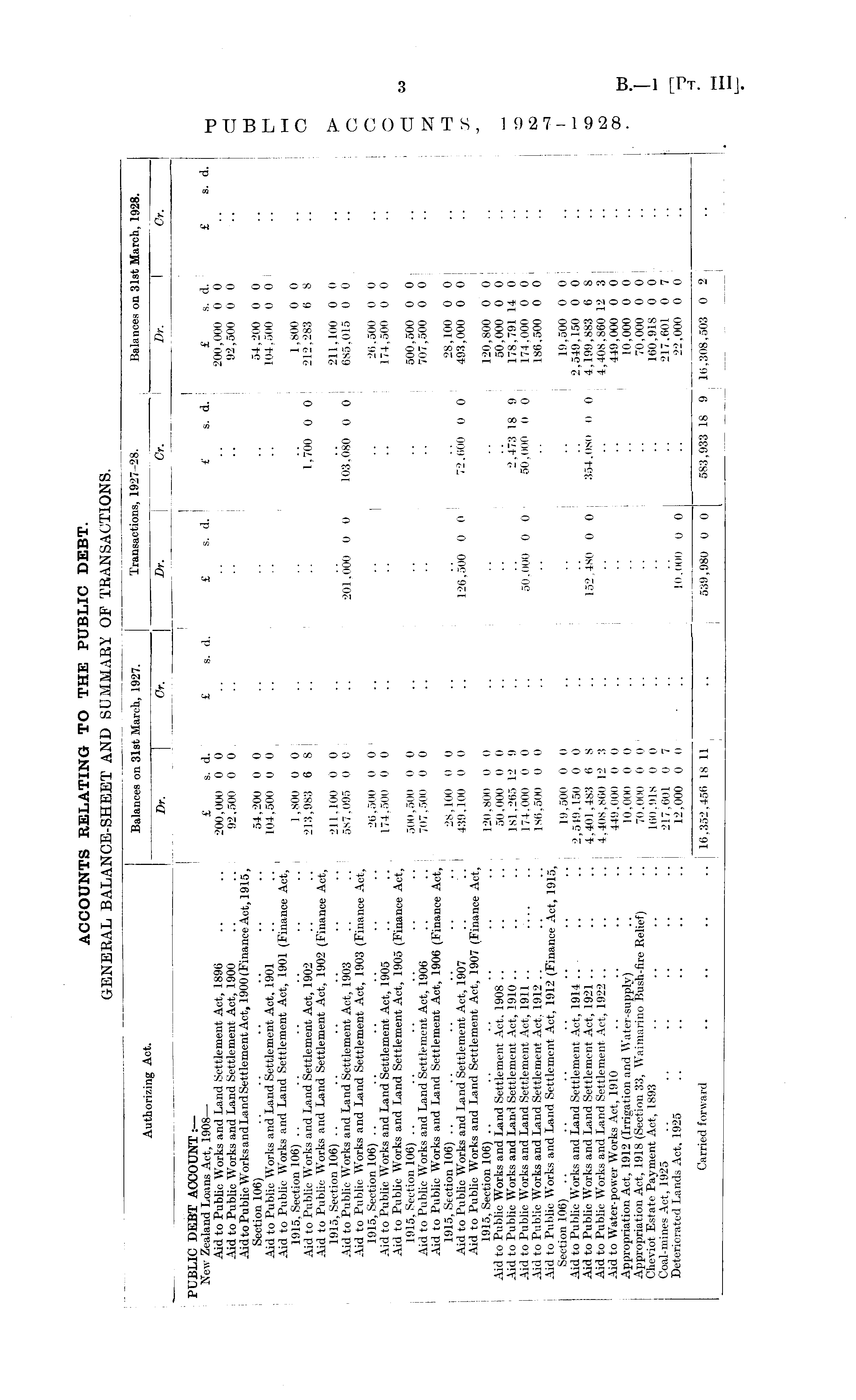 Balances on 31st March, 1927. Transactions, 1927-28. Balances on 31st March, 1928. Authorizing Act. _ . L — _ r Dr. | Or. Dr. j Gr. '< Dr. I Or. PUBLIC DEBT ACCOUNT New Zealand Loans Act, 1908 — £ s. d. £ s. d. £ s. d. £ s. d. | £ s. d. £ s. d. Aid to Public Works and Land Settlement Act, 1896 .. .. 200,000 0 0 .. .. .. j 200,000 0 0 Aid to Public Works and Land Settlement Act, 1900 .. .. 92,500 0 0, .. .. .. 92,500 0 0 Aidto Public WorksandLandSettlement Act, 1900 (Finance Act, 1915, Section 106) .. ■. .. .. .. .. 54,200 0 0 .. .. .. ! 54,200 0 0 Aid to Public Works and Land Settlement Act, 1901 .. .. 104,500 0 0 .. .. .. 104,500 0 0 Aid to Public Works and Land Settlement Act, 1901 (Finance Act, 1915, Section 106) .. .. .. .. .. .. 1,800 0 0! .. .. .. j 1,800 0 0 Aid to Public Works and Land Settlement Act, 1902 .. .. 213,983 6 8! .. .. 1,700 0 0 ; 212,283 6 8 Aid to Public Works and Land Settlement Act, 1902 (Finance Act, 1915, Section 106) .. .. .. .. .. .. j 211,100 0 0.. .. ... j 211,100 0 0 Aid to Public Works and Land Settlement Act, 1903 .. .. 587,095 0 0 .. 201,000 0 0 103,080 0 0 685,015 0 0 Aid to Public Works and Land Settlement Act, 1903 (Finance Act, 1915, Section 106) .. .. .. .. .. .. 26,500 0 0 .. .. I .. 26,500 0 0 Aid to Public Works and Land Settlement Act, 1905 .. .. 174,500 0 0 .. .. .. 174,500 0 0 Aid to Public Works and Land Settlement Act, 1905 (Finance Act, 1915, Section 106) .. .. .. .. .. .. 500,500 0 0 .. .. .. 500,500 0 0 Aid to Public Works and Land Settlement Act, 1906 .. .. 707,500 0 0 .. .. .. 707,500 0 0 Aid to Public Works and Land Settlement Act, 1906 (Finance Act, 1915, Section 106) .. .. .. .. .. .. 28,100 0 0 .. .. .. 28,100 0 0 Aid to Public Works and Land Settlement Act, 1907 .. .. 439,100 0 0 .. 126,500 0 0 72,600 0 0 493,000 0 0 Aid to Public Works and Land Settlement Act, 1907 (Finance Act, 1915, Section 106) .. .. .. .. .. .. 120,800 0 0 .. .. .. 120,800 0 0 Aid to Public Works and Land Settlement Act. 1908 .. .. .. 50,000 0 0 .. .. .. 50,000 0 0 Aid to Public Works and Land Settlement Act, 1910 .. .. .. 181,265 12 9 .. .. 2,473 18 9 178,791 14 0 Aid to Public Works and Land Settlement Act, 1911 .. .... .. 174,000 0 0 .. 50,000 0 0 50,000 0 0 174,000 0 0 Aid to Public Works and Land Settlement Act, 1912 .. .. .. 186,500 0 0 .. .. .. 186,500 0 0 Aid to Public Works and Land Settlement Act, 1912 (Finance Act, 1915, Section 106) .. .. .. .. .. .. .. j 19,500 0 0 .. .. .. 19,500 0 0 Aid to Public Works and Land Settlement Act, 1914 .. .. .. 2,549,150 0 0 .. .. .. 2,549,150 0 0 Aid to Public Works and Land Settlement Act, 1921 .. .. .. , 4,401,483 6 8* .. 152,480 0 0 354,080 0 0 4,199,883 6 8 Aid to Public Works and Land Settlement Act, 1922 .. .. .. I 4,408,860 12 3 .. .. .. 4,408,860 12 3 Aid to Water-power Works Act, 1910 .. .. .. .. 449,000 0 0 .. .. .. 449,000 0 0 Appropriation Act, 1912 (Irrigation and Water-supply) .. .. 10,000 0 0 .. .. .. 10,000 0 0 Appropriation Act, 1918 (Section 33, Waimarino Bush-fire Relief) .. 70,000 0 0 .. .. .. 70,000 0 0 Cheviot Estate Payment Act, 1893 .. .. .. .. 160,918 0 0 .. .. .. 160,918 0 0 Coal-mines Act, 1925 .. .. .. .. .. .. 217,601 0 7 .. .. .. 217.601 0 7 Deteriorated Lands Act, 1925 .. .. .. .. .. 12,000 0 0 .. 10,000 0 0 .. 22,000 0 0 Carried forward .. .. .. .. 16,352,456 18 11 .. 539,980 0 0 583,933 18 9 16,308,503 0 2