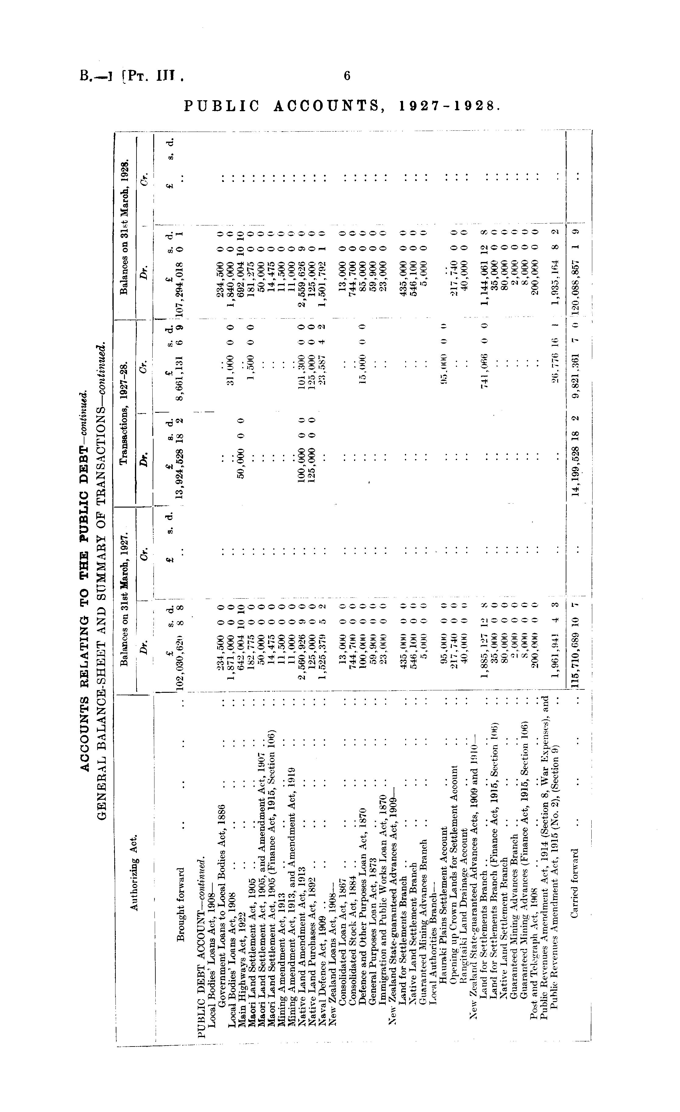 Balances on 31st March, 1927. Transactions, 1927-28. Balances on 31st Maroh, 1928. Authorizing Act. — —- Dr. \ Cr. Dr. I Or. Dr. < Cr. £ s. d. £ a. d. £ s. d. £ s. d. £ s. d. £ s. d. Brought forward .. .. .. ..102,030,620 8 8 .. 13,924,528 18 2 8,661,131 6 9 1107,294,018 0 1 PUBLIC DEBT ACCOUNT —continued. Local Bodies' Loans Act, 1908 — Government Loans to Local Bodies Act, 1886 .. .. . • 234,500 0 0 .. .. • • 234,500 0 0 Local Bodies' Loans Act, 1908 .. .. .. .. •• 1,871,000 0 0 .. .. 31,000 0 0 1,840,000 0 0 Main Highways Act, 1922 .. .. .. .. •• 642,004 10 10 .. 50,000 0 0 .. 692,004 10 10 Maori Land Settlement Act, 1905 .. .. •• •• •• 182,775 0 0 .. .. 1,500 0 0 181,275 0 0 Maori Land Settlement Act, 1905, and Amendment Act, 1907 .. .. 50,000 0 0 .. • • • • 50,000 0 0 Maori Land Settlement Act, 1905 (Finance Act, 1915, Section 106) .. 14,475 0 0 .. .. .. 14,475 0 0 Mining Amendment Act, 1913 .. .. .. .. .. 11,500 0 0 .. .. .. 11,500 0 0 Mining Amendment Act, 1913, and Amendment Act, 1919 .. .. 11,000 0 0 .. .. .. 11,000 0 0 Native Land Amendment Act, 1913 .. .. .. .. 2,560,926 9 0 .. 100,000 0 0 101,300 0 0 2,559,626 9 0 Native Land Purchases Act, 1892 .. .. .. .. .. 125,000 0 0 .. 125,000 0 0 125,000 0 0 125,000 0 0 Naval Defence Act, 1909 .. .. .. .. .. .. 1,525,379 5 2 .. .. 23,587 4 2 1,501,792 1 0 New Zealand Loans Act, 1908 — Consolidated Loan Act, 1867 .. .. .. .. .. 13,000 0 0 .. .. .. 13,000 0 0 Consolidated Stock Act, 1884 .. .. .. .. .. 744,700 0 0 .. .. .. 744,700 0 0 Defence and Other Purposes Loan Act, 1870 .. .. .. 100,000 0 0 .. .. 15,000 0 0 85,000 0 0 General Purposes Loan Act, 1873 .. .. .. .. 59,900 0 0 .. " .. 59,900 0 0 Immigration and Public Works Loan Act, 1870 .. .. .. I 23,000 0 0 .. .. .. 23,000 0 0 New Zealand State-guaranteed Advances Act, 1909 —• Land for Settlements Branch .. .. .. .. .. 435,000 0 0 .. .. .. 435,000 0 0 Native Land Settlement Branch .. .. .. .. 546,100 0 0 .. .. .. 546,100 0 0 Guaranteed Mining Advances Branch .. .. .. .. j 5,000 0 0 .. .. .. 5,000 0 0 Local Authorities Branch — j . Hauraki Plains Settlement Account .. .. .. 95,000 0 0 .. .. 95,000 0 0 Opening up Crown Lands for Settlement Account .. .. 217,740 0 0 .. .. .. 217,740 0 0 Rangitaiki Land Drainage Account .. .. .. 40,000 0 0 .. .. .. 40,000 0 0 New Zealand State-guaranteed Advances Acts, 1909 and 1910 — Land for Settlements Branch .. .. .. .. .. 1,885,127 12 8 .. .. 741,066 0 0 1,144,061 12 8 Land for Settlements Branch (Finance Act, 1915, Section 106) .. | 35,000 0 0 .. .. .. 35,000 0 0 Native Land Settlement Branch .. .. .. .. 80,000 0 0; .. .. .. 80,000 0 0 Guaranteed Mining Advances Branch .. .. .. .. j 2,000 0 0 .. .. .. 2,000 0 0 Guaranteed Mining Advances (Finance Act, 1915, Section 106) .. j 8,000 0 0 .. .. .. 8,000 0 0 Post and Telegraph Act, 1908 .. .. .. .. .. j 200,000 0 0 .. .. .. 200,000 0 0 Public Revenues Amendment Act, 1914 (Section 8, War Expenses), and Public Revenues Amendment Act, 1915 (No. 2), (Section 9) .. j 1,961,94! 4 3 .. .. 26,776 16 I 1,935,164 8 2 Carried forward .. .. .. .. 115,710,689 10 7 .. 14,199,528 18 2 9,821,361 7 0 120,088,857 1 9 I ' . J ' ' 1 |