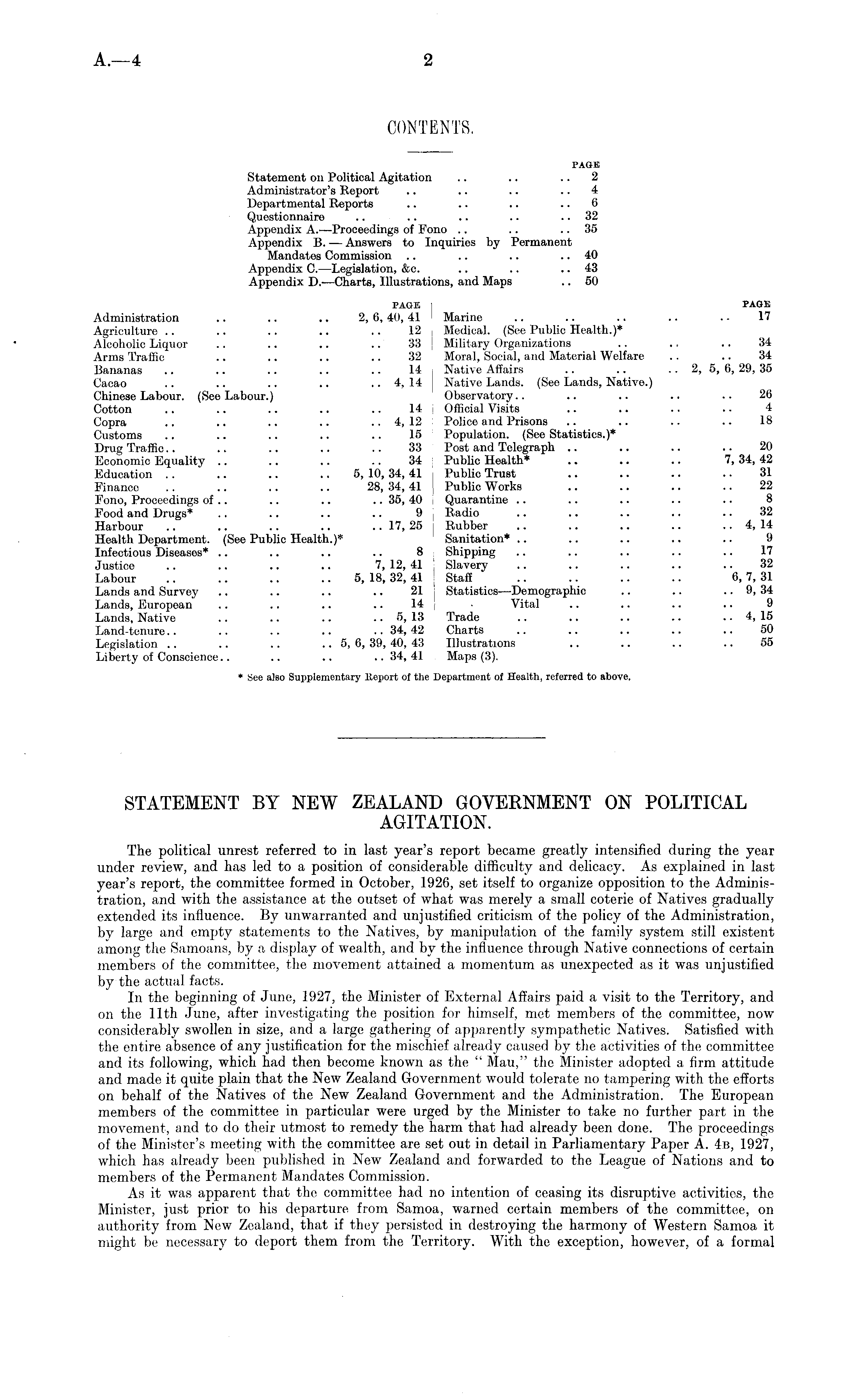 STATEMENT BY NEW ZEALAND GOVERNMENT ON POLITICAL AGITATION. The political unrest referred to in last year's report became greatly intensified during the year under review, and has led to a position of considerable difficulty and delicacy. As explained in last year's report, the committee formed in October, 1926, set itself to organize opposition to the Administration, and with the assistance at the outset of what was merely a small coterie of Natives gradually extended its influence. By unwarranted and unjustified criticism of the policy of the Administration, by large and empty statements to the Natives, by manipulation of the family system still existent among the Samoans, by a display of wealth, and by the influence through Native connections of certain members of the committee, the movement attained a momentum as unexpected as it was unjustified by the actual facts. In the beginning of June, 1927, the Minister of External Affairs paid a visit to the Territory, and on the 11th June, after investigating the position for himself, met members of the committee, now considerably swollen in size, and a large gathering of apparently sympathetic Natives. Satisfied with the entire absence of any justification for the mischief already caused by the activities of the committee and its following, which had then become known as the " Mau," the Minister adopted a firm attitude and made it quite plain that the New Zealand Government would tolerate no tampering with the efforts on behalf of the Natives of the New Zealand Government and the Administration. The European members of the committee in particular were urged by the Minister to take no further part in the movement, and to do their utmost to remedy the harm that had already been done. The proceedings of the Minister's meeting with the committee are set out in detail in Parliamentary Paper A. 4b, 1927, which has already been published in New Zealand and forwarded to the League of Nations and to members of the Permanent Mandates Commission. As it was apparent that the committee had no intention of ceasing its disruptive activities, the Minister, just prior to his departure, from Samoa, warned certain members of the committee, on authority from New Zealand, that if they persisted in destroying the harmony of Western Samoa it might be necessary to deport them from the Territory. With the exception, however, of a formal