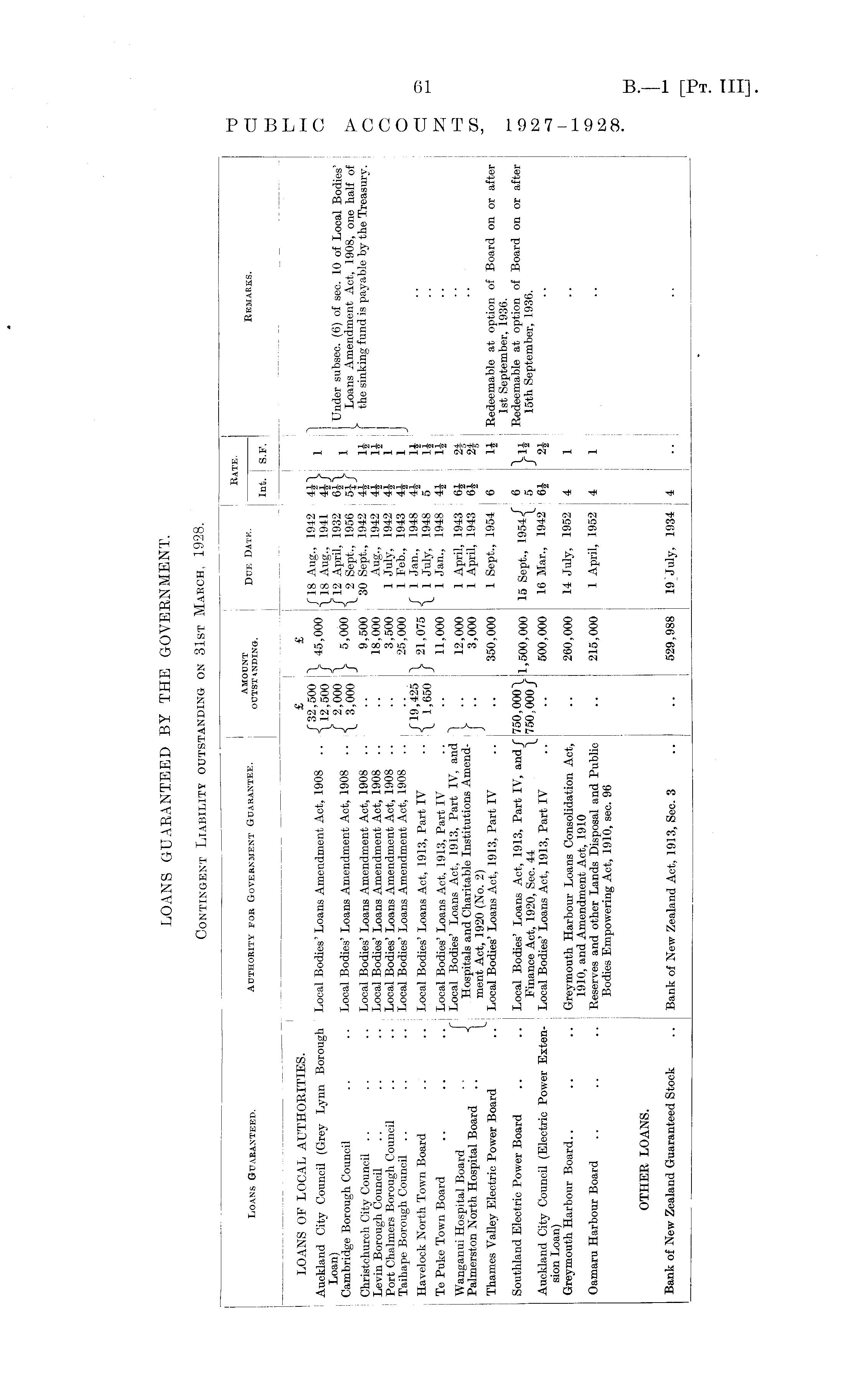 . - Rate. Loans Guaranteed. Authority for Government Guarantee. j outstanding Due Datk - I i Remarks. j Int. | S.F. LOANS OF LOCAL AUTHORITIES. £_ £ Auckland City Council (Grey Lynn Borough Local Bodies' Loans Amendment Act, 1908 .. \ 500 1 1941 4?/ Loan) r 2,000 \ _ nA „ I f 12 April, 1932 6J\ , ! Under subsec. (6) of see. 10 of Local Bodies' I Cambridge Borough Council .. .. Local Bodies Loans Amendment Act, 1908 ••.^ 3j000 / 5 ' 000 |\ 2 Sept., 1956 5if 1 \ Loans Amendment Act, 1908, one half of Christchurch City Council .. .. .. Local Bodies' Loans Amendment Act, 1908 .. .. 9,500 j 30 Sept., 1942 4J 1J j ' the sinking fund is payable by the Treasury. | Levin Borough Council .. .. .. Local Bodies' Loans Amendment Act, 1908 .. .. 18,000 , Aug., 1942 4-1- 1|Port Chalmers Borough Council .. .. Local Bodies' Loans Amendment Act, 1908 .. .. 3,500 1 July, 1942 4§ 1 Taihape Borough Council .. .. .. Local Bodies' Loans Amendment Act, 1908 .. .. 25,000 1 Feb., 1943 4J 1 I Havelock North Town Board .. .. Local Bodies' Loans Act, 1913, Part IV .. j" 21,075 J July' 1948 if Te Puke Town Board .. .. .. Local Bodies' Loans Act, 1913, Part IV .. .. 11,000 1 Jan., 1948 4|- 1J Wanganui Hospital Board .. f L 9^ al Boxes' Loans Act, 1913, Part IV, and 1 12,000 1 April, 1943 6J 2§ Palmerston North Hospital Board .. j ""ntllt ?920 CNrf t f •• 3,000 I 1 April, 1943 6} 2? Thames Valley Electric Power Board .. Local Bodies' Loans Act, 1913, Part IV .. .. 350,000 | 1 Sept., 1954 6 1J Redeemable at option of Board on or after 1st September, 1936. Southland Electric Power Board .. .. Local Bodies' Loans Act, 1913, Part IV, and f 750, 000 \ , - nn nAA i 1f; <j„_ + iqm/ 6 \ li Redeemable at option of Board on or after Finance Act, 1920, Sec. 44 \ 750..000/ i , 5U0 ' U00 | 10 be pt., 5 j>l 2 15th September, 1936. Auckland City Council (Electric Power Exten- Local Bodies' Loans Act, 1913, Part IV .. .. 500,000 | 16 Mar., 1942 6J 2J sion Loan) Greymouth Harbour Board.. .. .. Greymouth Harbour Loans Consolidation Act, .. 260,000 j 14 July, 1952 4 1 1910, and Amendment Act, 1910 Oamaru Harbour Board .. .. .. Reserves and other Lands Disposal and Public .. 215,000 j 1 April, 1952 4 1 Bodies Empowering Act, 1910, see. 96 OTHER LOANS. Bank of New Zealand Guaranteed Stock .. Bank of New Zealand Act, 1913, See. 3 .. .. 529,988 i 19 July, 1934 4 ■ li&lll |