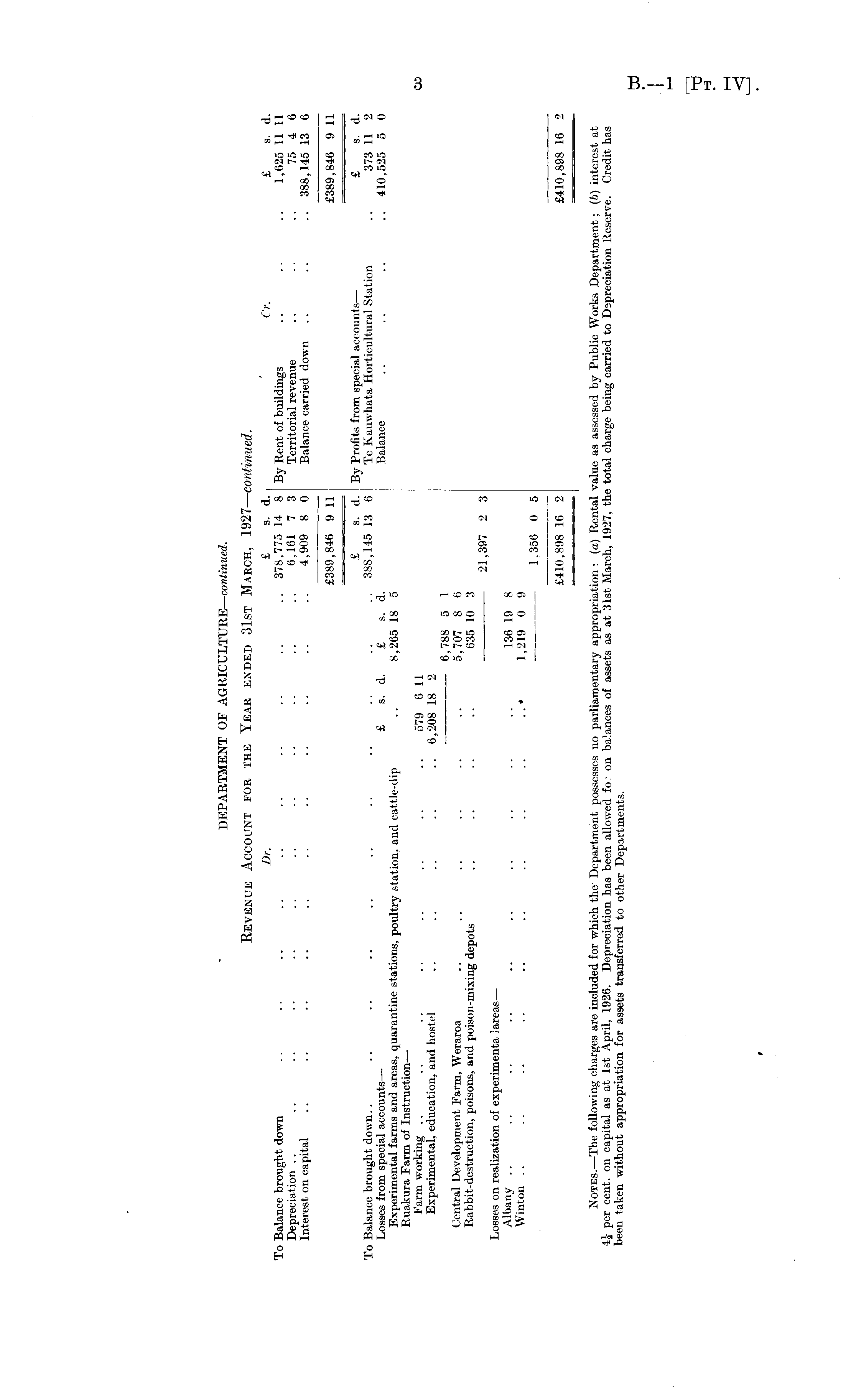 DEPARTMENT OF AGRICULTURE— continued. Revenue Account for the Year ended 31st March, 1927— continued. Dr. £ b. d. Cr. £ s. d. To Balance brought down .. . ■ .. .. .. .. .. .. .. .. 378,775 14 8 By Rent of buildings .. .. .. 1,625 11 11 Depreciation .. .. .. .. .. .. .. .. .. .. .. .. 6,161 7 3 Territorial revenue .. .. .. 75 4 6 Interest on capital .. .. .. .. .. .. .. .. .. .. .. 4,909 8 0 Balance carried down .. .. .. 388,145 13 6 £389,846 9 11 £389,846 9 11 £ s. d. By Profits from special accounts— £ s. d. To Balance brought down.. .. .. .. .. .. .. .. .. .. .. 388,145 13 6 Te Kauwhata Horticultural Station .. 373 11 2 Losses from special accounts— £ s. d. £ s. d. Balance .. .. .. .. 410,525 5 0 Experimental farms and areas, quarantine stations, poultry station, and cattle-dip .. 8,265 18 5 Ruakura Farm of Instruction— Farm working .. .. .. .. .. .. .. .. 579 6 11 Experimental, education, and hostel .. .. .. .. 6,208 18 2 6,788 5 1 Central Development Farm, Weraroa .. .. .. .. .. .. 5,707 8 6 Rabbit-destruction, poisons, and poison-mixing depots .. .. .. .. 635 10 3 21,397 2 3 Losses on realization of experimenta lareas— Albany .. .. .. .. j. .. .. .. .. .. 136 19 8 Winton .. .. .. .. .. .. .. .. .. 1,219 0 9 1,356 0 5 £410,898 16 2 £410,898 16 2 Notes.—The following charges are included for which the Department possesses no parliamentary appropriation : (a) Rental value as assessed by Public Works Department; (6) interest at 4| per cent, on capital as at Ist April, 1926. Depreciation has been allowed fo' on ba'ances of assets as at 31st March, 1927, the total charge being carried to Depreciation Reserve. Credit has been taken without appropriation for assets transferred to other Departments.