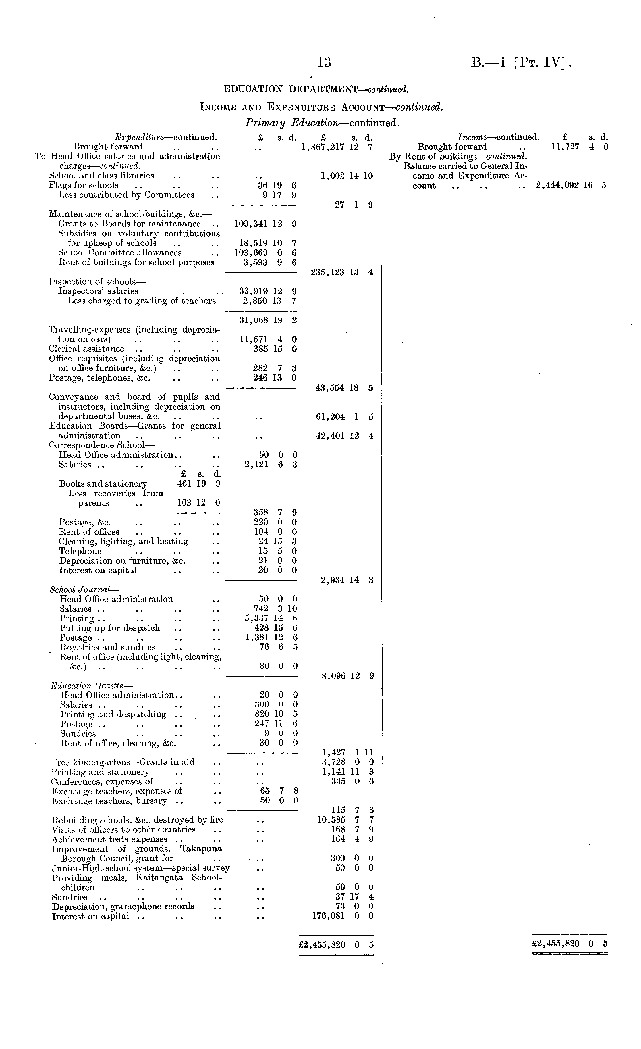 EDUCATION DEPARTMENT—continued. Income and Expenditure Account —continued. Primary Education—continued. Expenditure—continued. £ s. d. £ s. d. Income —continued. £ s. d. Brought forward .. .. .. 1,867,217 12 7 Brought forward .. 11,727 4 0 To Head Office salaries and administration By Rent of buildings —continued. charges—continued. Balance carried to General InSohool and class libraries .. .. .. 1,002 14 10 come and Expenditure AcMags for schools .. .. .. 36 19 6 count .. .. .. 2,444,092 16 5 Less contributed by Committees .. 917 9 _____ 27 1 9 Maintenance of school-buildings, &c. — Grants to Boards for maintenance .. 109,341 12 9 Subsidies on voluntary contributions for upkeep of schools .. .. 18,519 10 7 School Committee allowances .. 103,669 0 6 Rent of buildings for school purposes 3,593 9 6 235,123 13 4 Inspection of schoolsInspectors'salaries .. .. 33,919 12 9 Less charged to grading of teachers 2,850 13 7 31,068 19 2 Travelling-expenses (including depreciation on cars) .. .. .. 11,571 4 0 Clerical assistance .. .. .. 385 15 0 Office requisites (including depreciation on office furniture, &c.) .. .. 282 7 3 Postage, telephones, &c. .. .. 246 13 0 43,554 18 5 Conveyance and board of pupils and instructors, including depreciation on departmental buses, &c. .. .. .. 61,204 1 5 Education Boards—-Grants for general administration .. .. .. .. 42,401 12 4 Correspondence School— Head Office administration.. .. 50 0 0 Salaries .. .. .. .. 2,121 6 3 £ s. d. Books and stationery 461 19 9 Less recoveries from parents .. 103 12 0 358 7 9 Postage, &c. .. .. .. 220 0 0 Rent of offices .. .. .. 104 0 0 Cleaning, lighting, and heating .. 24 15 3 Telephone .. .. .. 15 5 0 Depreciation on furniture, &c. .. 21 0 0 Interest on capital .. .. 20 0 0 2,934 14 3 School Journal— Head Office administration .. 50 0 0 Salaries .. .. .. .. 742 3 10 Printing.. .. .. .. 5,337 14 6 Putting up for despatch .. .. 428 15 6 Postage .. .. .. .. 1,381 12 6 Royalties and sundries .. .. 76 6 5 Rent of office (including light, cleaning, &c.) .. .. .. .. 80 0 0 —— 8,096 12 9 Education Gazette— Head Office administration.. .. 20 0 0 Salaries .. .. .. .. 300 0 0 Printing and despatching .. . .. 820 10 5 Postage .. .. .. .. 247 11 6 Sundries .. .. .. 9 0 0 Rent of office, cleaning, &c. .. 30 0 0 1,427 1 11 Free kindergartens —Grants in aid .. .. 3,728 0 0 Printing and stationery .. .. .. 1,141 11 3 Conferences, expenses of .. .. .. 335 0 6 Exchange teachers, expenses of .. 65 7 8 Exchange teachers, bursarv .. .. 50 0 0 — - 115 7 8 Rebuilding schools, &c., destroyed by fire .. 10,585 7 7 Visits of officers to other countries .. .. 168 7 9 Achievement tests expenses .. .. .. 164 4 9 Improvement of grounds, Takapuna Borough Council, grant for .. .. 300 0 0 Junior-High-school system—special survey .. 50 0 0 Providing meals, Kaitangata Schoolchildren .. .. .. .. 50 0 0 Sundries .. .. .. .. .. 37 17 4 Depreciation, gramophone records .. .. 73 0 0 Interest on capital .. .. .. .. 176,081 0 0 £2,455,820 0 5 £2,455,820 0 5