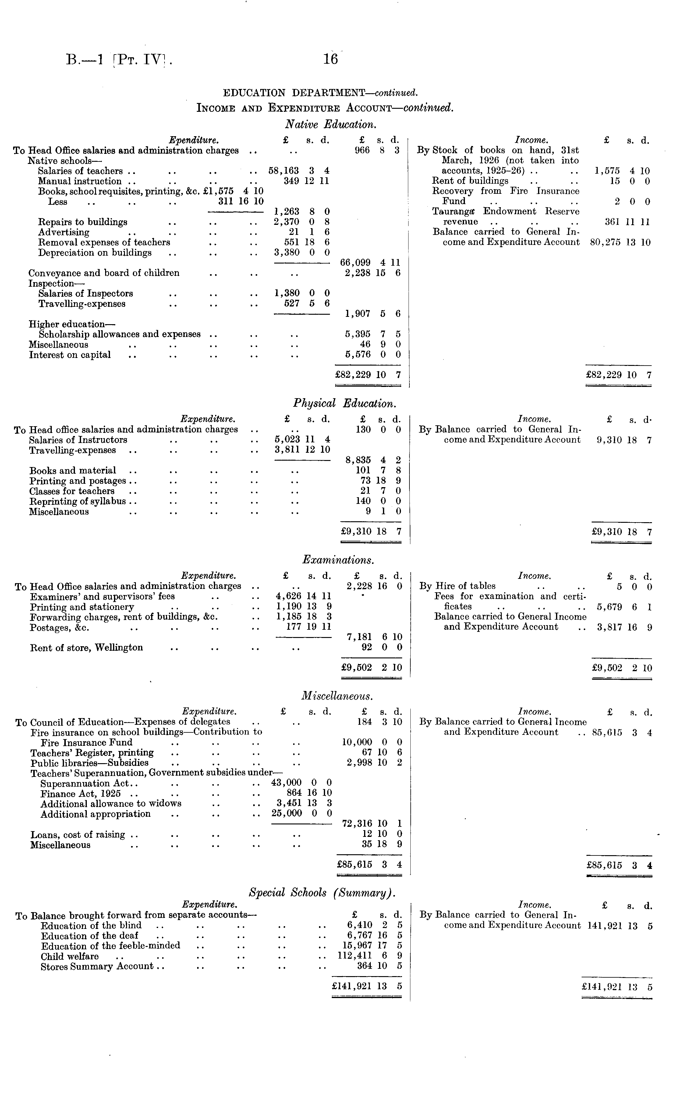 EDUCATION DEPARTMENT —continued. Income and Expenditure Account —continued. Native Education. Ependiture. £ s. d. £ s. d. Income. £ s. d. To Head Office salaries and administration charges .. .. 966 8 3 By Stock of books on hand, 31st Native schools— March, 1926 (not taken into Salaries of teachers .. .. .. .. 58,163 3 4 accounts, 1925-26) .. .. 1,575 410 Manual instruction .. .. .. .. 349 12 11 Rent of buildings .. .. 15 0 0 Books, school requisites, printing, &c. £1,575 4 10 Recovery from Fire Insurance Less .. .. .. 311 16 10 j Fund .. .. .. 2 0 0 1,263 8 0 | Tauranga; Endowment Reserve Repairs to buildings .. .. .. 2,370 0 8 revenue .. .. .. 361 11 11 Advertising .. .. .. .. 21 1 6 Balance carried to General InRemoval expenses of teachers .. .. 551 18 6 | come and Expenditure Account 80,275 13 10 Depreciation on buildings .. .. .. 3,380 0 0 66,099 4 11 Conveyance and board of children .. .. .. 2,238 15 6 Inspection'— Salaries of Inspectors .. .. .. 1,380 0 0 Travelling-expenses .. .. .. 527 5 6 1,907 5 6 Higher education— Scholarship allowances and expenses .. .. .. 5,395 7 5 Miscellaneous .. .. .. .. .. 46 9 0 Interest on capital .. .. .. .. .. 5,576 0 0 £82,229 10 7 £82,229 10 7 Physical Education. Expenditure. £ s. d. £ s. d. Income. £ s. dTo Head office salaries and administration charges .. .. 130 0 0 By Balance carried to General InSalaries of Instructors .. .. .. 5,023 11 4 come and Expenditure Account 9,310 18 7 Travelling-expenses .. .. .. .. 3,811 12 10 8,835 4 2 Books and material .. .. .. .. .. 101 7 8 Printing and postages.. .. .. .. .. 73 18 9 Classes for teachers .. .. .. .. .. 21 7 0 Reprinting of syllabus.. .. .. .. .. 140 0 0 Miscellaneous .. .. .. .. .. 910 £9,310 18 7 £9,310 18 7 Examinations. Expenditure. £ s. d. £ s. d. Income. £ s. d. To Head Office salaries and administration charges .. .. 2,228 16 0 By Hire of tables .. .. 5 0 0 Examiners'and supervisors'fees .. .. 4,626 14 11 • Fees for examination and certiPrinting and stationery .. .. .. 1,190 13 9 ficates .. .. .. 5,679 6 1 Forwarding charges, rent of buildings, &c. .. 1, 185 18 3 Balance carried to General Income Postages, &c. .. .. .. .. 177 19 11 and Expenditure Account .. 3,817 16 9 7,181 6 10 Rent of store, Wellington .. .. .. .. 92 0 0 £9,502 2 10 £9,502 2 10 Miscellaneous. Expenditure. £ s. d. £ s. d. Income. £ s. d. To Council of Education- —Expenses of delegates .. .. 184 310 By Balance carried to General Income Fire insurance on school buildings—Contribution to and Expenditure Account ..85,615 3 4 Fire Insurance Fund .. .. .. .. 10,000 0 0 Teachers' Register, printing .. .. .. .. 67 10 6 Public libraries —Subsidies .. .. .. .. 2,998102 Teachers' Superannuation, Government subsidies under'— Superannuation Act.. .. .. 43,000 0 0 Finance Act, 1925 .. .. .. .. 864 16 10 Additional allowance to widows .. .. 3,451 13 3 Additional appropriation .. .. 25,000 0 0 72,316 10 1 Loans, cost of raising .. .. .. .. .. 12 10 0 Miscellaneous .. .. .. .. .. 35 18 9 £85,615 3 4 £85,615 3 4 Special Schools (Summary). Expenditure. Income. £ s. d. To Balance brought forward from separate accounts— £ s. d. By Balance carried to General InEducation of the blind .. .. .. .. .. 6,410 2 5 come and Expenditure Account 141,921 13 5 Education of the deaf .. .. .. .. .. 6,767 16 5 Education of the feeble-minded .. .. .. .. 15,967 17 5 Child welfare .. .. .. .. .. 112,411 6 9 Stores Summary Account.. .. .. .. .. 364 10 5 £141,921 13 5 £141,921 13 5