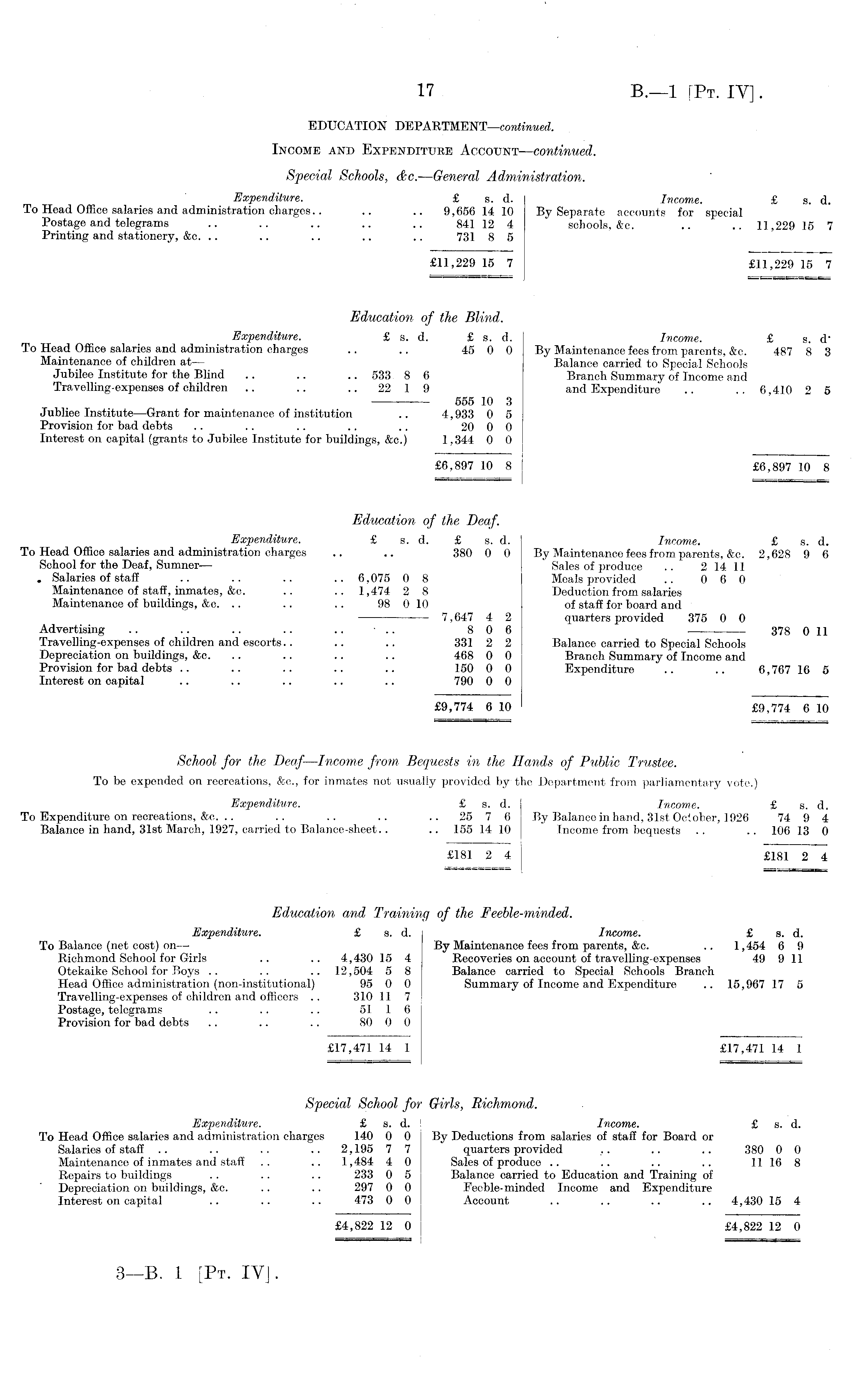 EDUCATION DEPARTMENT—continued. Income and Expenditure Account—continued. Special Schools, &c. —General Administration. Expenditure. £ s. d. Income. £ s. d. To Head Office salaries and administration charges.. .. .. 9,656 14 10 By Separate accounts for special Postage and telegrams .. .. .. .. .. 841 12 4 schools, &c. .. .. 11,229 15 7 Printing and stationery, &c. .. .. .. .. .. 731 8 5 £11,229 15 7 £11,229 15 7 Education of the Blind. Expenditure. £ s. d. £ s. d. Income. £ s. d' To Head Office salaries and administration charges .. .. 45 0 0 By Maintenance fees from parents, &c. 487 8 3 Maintenance of children at— Balance carried to Special Schools Jubilee Institute for the Blind .. .. .. 533 8 6 Branch Summary of Income and Travelling-expenses of children .. .. .. 22 1 9 and Expenditure .. .. 6,410 2 5 555 10 3 Jubliee Institute—Grant for maintenance of institution .. 4,933 0 5 Provision for bad debts .. .. .. .. .. 20 0 0 Interest on capital (grants to Jubilee Institute for buildings, &c.) 1,344 0 0 £6,897 10 8 £6,897 10 8 Education of the Deaf. Expenditure. £ s. d. £ s. d. Income. £ s. d. To Head Office salaries and administration charges .. .. 380 0 0 By Maintenance fees from parents, &c. 2,628 9 6 School for the Deaf, Sumner— Sales of produce .. 214 11 . Salaries of staff .. .. .. .. 6,075 0 8 Meals provided .. 0 6 0 Maintenance of staff, inmates, &c. .. .. 1,474 2 8 Deduction from salaries Maintenance of buildings, &c. .. .. .. 98 0 10 of staff for board and *— 7,647 4 2 quarters provided 375 0 0 Advertising .. .. .. .. .. ■ .. 806 378 0 11 Travelling-expenses of children and escorts.. .. .. 331 2 2 Balance carried to Special Schools Depreciation on buildings, &c. .. .. .. .. 468 0 0 Branch Summary of Income and Provision for bad debts .. .. .. .. .. 150 0 0 Expenditure .. .. 6,767 16 5 Interest on capital .. .. .. .. .. 790 0 0 £9,774 6 10 £9,774 6 10 School for the Deaf —Income from Bequests in the Hands of Public Trustee. To be expended on recreations, &c., for inmates not usually provided by the Department from parliamentary vote.) Expenditure. £ s. d. Income. £ s. d. To Expenditure on recreations, &c. .. .. .. .. 25 7 6 By Balance in hand, 31st October, 1926 74 9 4 Balance in hand, 31st March, 1927, carried to Balance-sheet.. .. 155 14 10 Income from bequests .. .. 106 13 0 £181 2 4 £181 2 4 Education and Training of the Feeble-minded. Expenditure. £ s. d. Income. £ s. d. To Balance (net cost) on— By Maintenance fees from parents, &c. .. 1,454 6 9 Richmond School for Girls .. .. 4,430 15 4 Recoveries on account of travelling-expenses 49 911 Otekaike School for Boys .. .. .. 12,504 5 8 Balance carried to Special Schools Branch Head Office administration (non-institutional) 95 0 0 Summary of Income and Expenditure .. 15,967 17 5 Travelling-expenses of children and officers .. 310 11 7 Postage, telegrams .. .. .. 51 1 6 Provision for bad debts .. .. .. 80 0 0 £17,471 14 1 £17,471 14 1 Special School for Girls, Richmond. Expenditure. £ s. d. Income. £ s. d. To Head Office salaries and administration charges 140 0 0 By Deductions from salaries of staff for Board or Salaries of staff .. .. .. .. 2,195 7 7 quarters provided ~ .. .. 380 0 0 Maintenance of inmates and staff .. .. 1,484 4 0 Sales of produce .. .. .. .. 11 16 8 Repairs to buildings .. .. .. 233 0 5 Balance carried to Education and Training of Depreciation on buildings, &c. .. .. 297 0 0 Feeble-minded Income and Expenditure Interest on capital .. .. .. 473 0 0 Account .. .. .. .. 4,430 15 4 £4,822 12 0 £4,822 12 0