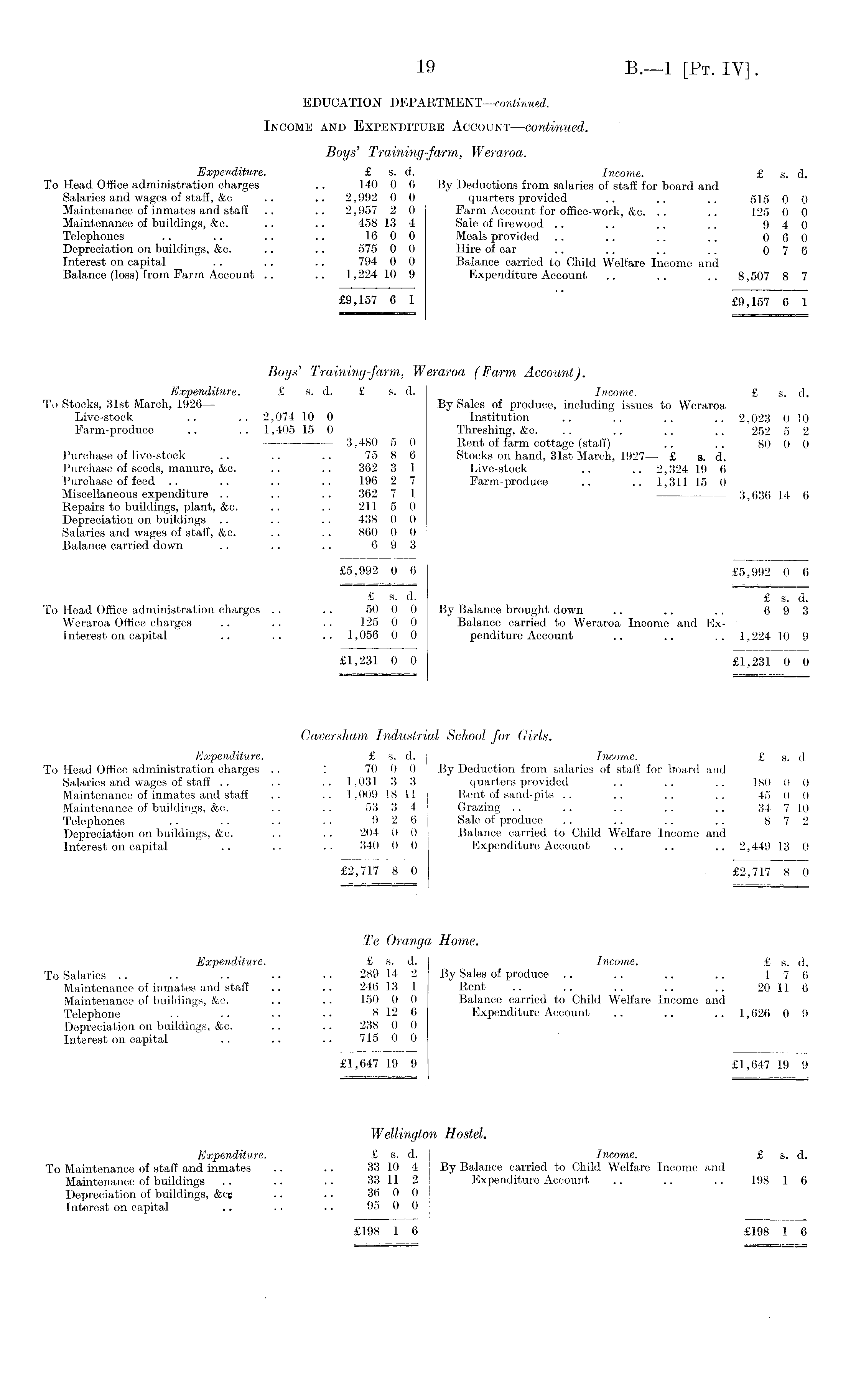 EDUCATION DEPARTMENT—continued. Income and Expenditure Account—continued. Boys' Training-farm, Weraroa. Expenditure. £ s. d. Income. £ s. d. To Head Office administration charges .. 140 0 0 By Deductions from salaries of staff for board and Salaries and wages of staff, &c .. .. 2,992 0 0 quarters provided . . .. .. 515 0 0 Maintenance of inmates and staff .. .. 2,957 2 0 Farm Account for office-work, &c. .. .. 125 0 0 Maintenance of buildings, &c. .. .. 458 13 4 Sale of firewood .. .. .. .. 9 4 0 Telephones .. .. .. .. 16 0 0 Meals provided .. .. .. .. 0 6 0 Depreciation on buildings, &c. .. .. 575 0 0 Hire of car .. .. .. .. 0 7 6 Interest on capital .. .. .. 794 0 0 Balance carried to Child Welfare Income and Balance (loss) from Farm Account .. .. 1,224 10 9 Expenditure Account .. .. .. 8,507 8 7 £9,157 6 1 £9,157 6 1 Boys' Training-farm, Weraroa (Farm Account). Expenditure. £ s. d. £ s. d. Income. £ s. d. To Stocks, 31st March, 1926 — By Sales of produce, including issues to Weraroa Live-stock .. .. 2,074 10 0 Institution .. .. .. .. 2,023 0 10 Farm-produce .. .. 1,405 15 0 Threshing, &c. .. .. .. .. 252 5 2 3,480 5 0 Rent of farm cottage (staff) .. .. 80 0 0 Purchase of live-stock .. .. .. 75 8 6 Stocks on hand, 31st March, 1927— £ s. d. Purchase of seeds, manure, &c. .. .. 362 3 1 Live-stock .. .. 2,324 19 6 Purchase of feed .. .. .. .. 196 2 7 Farm-produce .. .. 1,311 15 0 Miscellaneous expenditure .. .. .. 362 7 1 3,636 14 6 Repairs to buildings, plant, &c. .. .. 211 5 0 Depreciation on buildings .. .. .. 438 0 0 Salaries and wages of staff, &c. .. .. 860 0 0 Balance carried down .. .. .. 6 9 3 £5,992 0 6 £5,992 0 6 £ s. d. £ s. d. To Head Office administration charges .. .. 50 0 0 By Balance brought down .. .. .. 6 9 3 Weraroa Office charges .. .. .. 125 0 0 Balance carried to Weraroa Income aud ExInterest on capital .. .. .. 1,056 0 0 penditure Account .. .. .. 1,224 10 9 £1,231 0 0 £1,231 0 0 Caversham Industrial School for Girls. Expenditure. £ s. d. Income. £ s. d To Head Office administration charges .. ! 70 0 0 By Deduction from salaries of staff for board and Salaries and wages of staff .. .. .. 1,031 3 3 quarters provided .. .. .. 180 0 0 Maintenance of inmates and staff .. .. 1,009 18 11 Rent of sand-pits .. .. .. .. 45 0 0 Maintenance of buildings, &c. .. .. 53 3 4 Grazing .. .. .. .. .. 34 7 10 Telephones .. .. .. .. 9 2 6 Sale of produce .. .. .. .. 8 7 2 Depreciation on buildings, &c. .. .. 204 0 0 Balance carried to Child Welfare Income and Interest on capital .. .. .. 340 0 0 Expenditure Account .. .. .. 2,449 13 0 £2,717 8 0 £2,717 8 0 Te Oranga Home. Expenditure. £ s. d. Income. £ s. d. To Salaries .. .. .. .. .. 289 14 2 By Sales of produce .. .. ~ .. 17 6 Maintenance of inmates and staff .. .. 246 13 1 Rent .. .. .. .. .. 20 11 6 Maintenance of buildings, &c. .. .. 150 0 0 Balance carried to Child Welfare Income and Telephone .. .. .. .. 8126 Expenditure Account .. .. .. 1,626 0 9 Depreciation on buildings, &e. .. .. 238 0 0 Interest on capital .. .. .. 715 0 0 £1,647 19 9 £1,647 19 9 Wellington Hostel. Expenditure. £ s. d. Income. £ s. d. To Maintenance of staff and inmates .. .. 33 10 4 By Balance carried to Child Welfare Income and Maintenance of buildings .. .. .. 33 11 2 Expenditure Account .. .. .. 198 1 6 Depreciation of buildings, &cs . ■ .. 36 0 0 Interest on capital .. .. .. 95 0 0 £198 1 6 £198 1 6