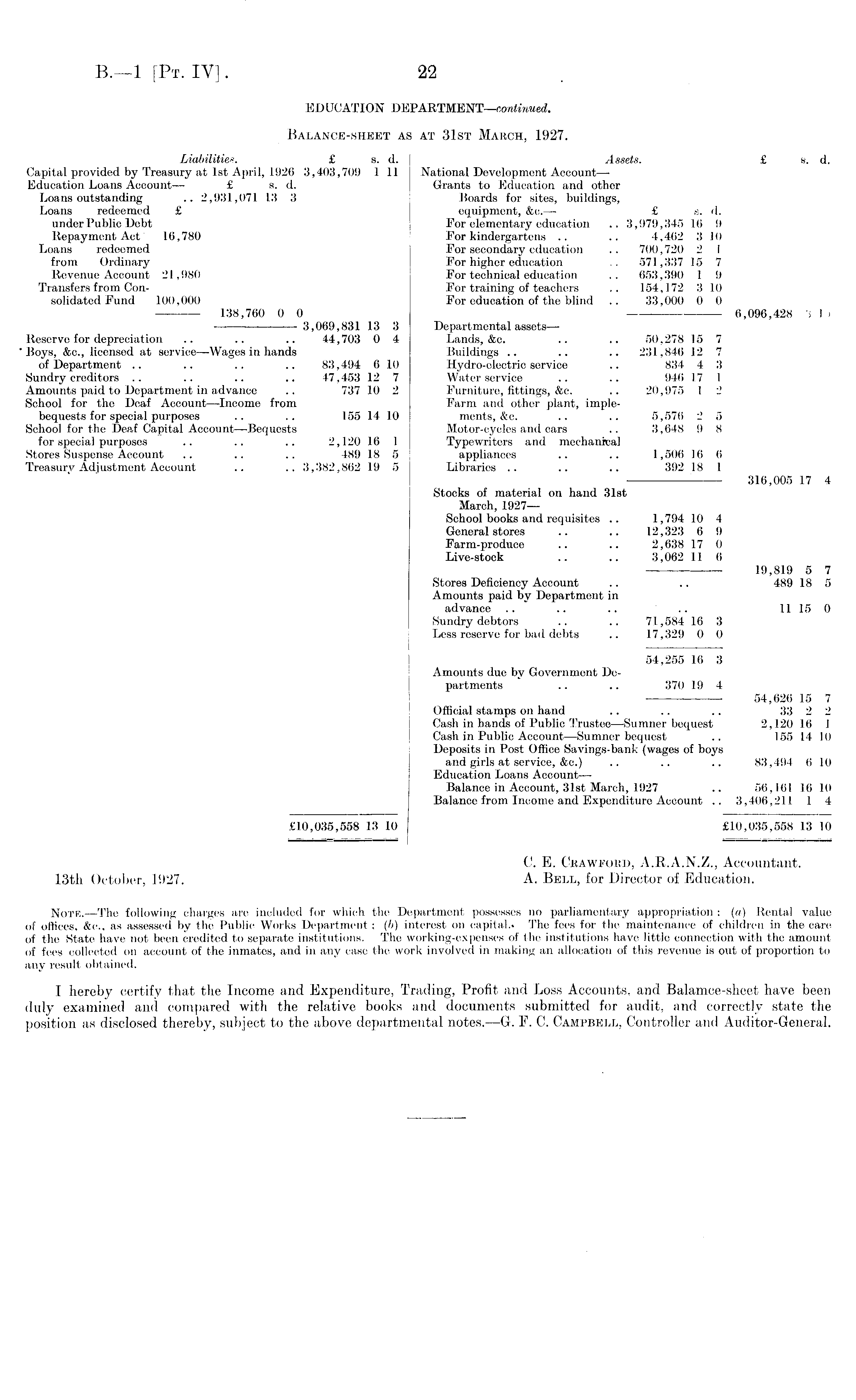 EDUCATION DEPARTMENT—continued. Balance-sheet as at 31st March, 1927. Liabilities. £ s. d. Assets. £ s. d. Capital provided by Treasury at Ist April, 1926 3,403,709 1 11 National Development Account— Education Loans Account — £ s. d. Grants to Education and other Loans outstanding .. 2,931,071 13 3 Boards for sites, buildings, Loans redeemed £ equipment, &c.— £ s. d. under Public Debt For elementary education .. 3,979,345 16 9 Repayment Act 16,780 For kindergartens .. .. 4,462 310 Loans redeemed For secondary education .. 700,720 2 1 from Ordinary For higher education .. 571,337 15 7 Revenue Account 21,980 For technical education .. 653,390 1 9 Transfers from Con- For training of teachers .. 154,172 310 solidated Fund 100,000 For education of the blind .. 33,000 0 0 138,760 0 0 6,096,428 > J > 3,069,831 13 3 Departmental assets — Reserve for depreciation .. .. .. 44,703 0 4 Lands, &c. .. .. 50,278 15 7 Boys, &c., licensed at service—Wages in hands Buildings .. .. .. 231,846 12 7 of Department .. .. .. .. 83,494 6 10 Hydro-electric service .. 834 4 3 Sundry creditors .. .. .. .. 47,453 12 7 Water service .. .. 946 17 1 Amounts paid to Department in advance .. 737 10 2 Furniture, fittings, &c. .. 20,975 1 2 School for the Deaf Account—lncome from Farm and other plant, implebequests for special purposes .. .. 155 14 10 ments, &c. .. .. 5,576 2 5 School for the Deaf Capital Account—Bequests Motor-cycles and cars .. 3,648 9 8 for special purposes .. .. .. 2,120 16 1 Typewriters and mechanical Stores Suspense Account .. .. .. 489 18 5 appliances .. .. 1,506 16 6 Treasurv Adjustment Account .. .. 3,382,862 19 5 Libraries .. .. .. 392 18 1 316,005 17 4 Stocks of material on hand 31st March, 1927 — School books and requisites .. 1,794 10 4 General stores .. .. 12,323 6 9 Farm-produce .. .. 2,638 17 0 Live-stock .. .. 3,062 11 6 19,819 5 7 Stores Deficiency Account .. .. 489 18 5 Amounts paid by Department in advance .. .. .. .. 11 15 0 Sundry debtors .. .. 71,584 16 3 Less reserve for bad debts .. 17,329 0 0 54,255 16 3 Amounts due by Government Departments .. .. 370 19 4 54,626 15 7 Official stamps on hand .. .. .. 33 2 2 Cash in hands of Public Trustee—Sumner bequest 2,120 16 1 Cash in Public Account—Sumner bequest .. 155 14 10 Deposits in Post Office Savings-bank (wages of boys and girls at service, &c.) .. .. .. 83,494 6 10 Education Loans Account — Balance in Account, 31st March, 1927 .. 56,161 16 10 Balance from Income and Expenditure Account .. 3,406,211 1 4 £10,035,558 13 10 j £10,035,558 13 10 | = 7 -.- r - rr^ C. E. Crawford, A.R.A.N.Z., Accountant. 13th October, 1927. A. Bell, for Director of Education. Note. —The following charges are included for which the Department possesses no parliamentary appropriation : (a) Rental value of offices, &c., as assessed by the Public Works Department; (b) interest on capital.* The fees for the maintenance of children in the care of the State have not been credited to separate institutions. The working-expenses of the institutions have little connection with the amount of fees collected on account of the inmates, and in any case the work involved in making an allocation of this revenue is out of proportion to any result obtained. I hereby certify that the Income and Expenditure, Trading, Profit and Loss Accounts, and Balamce-sheet have been duly examined and compared with the relative books and documents submitted for audit, and correctly state the position as disclosed thereby, subject to the above departmental notes. —G. F. C. Campbell, Controller and Auditor-General.
