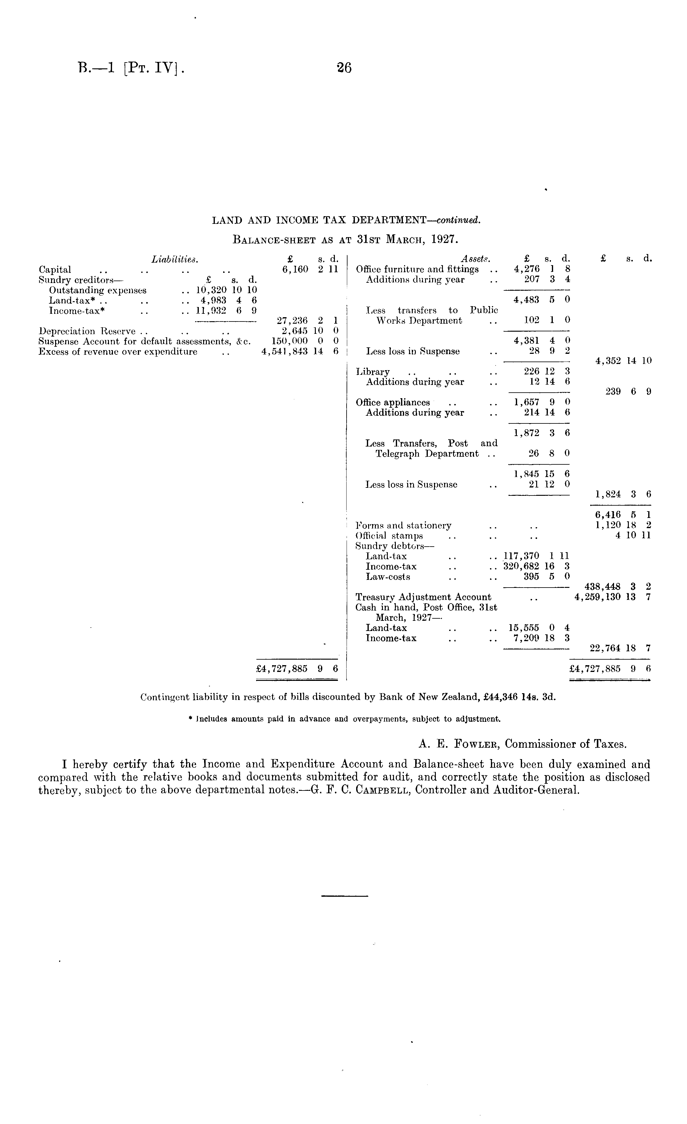 LAND AND INCOME TAX DEPARTMENT—continued. Balance-sheet as at 31st March, 1927. Liabilities. £ s. d. Assets. £ s. d. £ s. d. Capital .. .. .. .. 6,160 211 Office furniture and fittings .. 4,276 1 8 Sundry creditors — £ s. d. Additions during year .. 207 3 4 Outstanding expenses .. 10,320 10 10 Land-tax* .. .. .. 4,983 4 6 4,483 5 0 Income-tax* .. .. 11,932 6 9 Less transfers to Public 27,236 2 1 Works Department .. 102 1 0 Depreciation Reserve .. .. .. 2,645 10 0 Suspense Account for default assessments, &c. 150,000 0 0 4,381 4 0 Excess of revenue over expenditure .. 4,541,843 14 6 Less loss in Suspense .. 28 9 2 — 4,352 14 10 Library . . .. .. 226 12 3 Additions during year .. 12 14 6 239 6 9 Office appliances .. .. 1,657 9 0 Additions during year .. 214 14 6 1,872 3 6 Less Transfers, Post and Telegraph Department .. 26 8 0 1,845 15 6 Less loss in Suspense .. 21 12 0 1,824 3 6 6,416 5 1 Forms and stationery .. .. 1,120 18 2 Official stamps .. .. .. 4 10 11 Sundry debtors — Land-tax .. .. .117,370 1 11 Income-tax .. .. 320,682 16 3 Law-costs .. .. 395 5 0 438,448 3 2 Treasury Adjustment Account .. 4,259,130 13 7 Cash in hand, Post Office, 31st March, 1927— Land-tax .. .. 15,555 0 4 Income-tax .. .. 7,209 18 3 22,764 18 7 £4,727,885 9 6 £4,727,885 9 6 Contingent liability in respect of bills discounted by Bank of New Zealand, £44,346 14s. 3d. * Includes amounts paid in advance and overpayments, subject to adjustment. A. E. Fowler, Commissioner of Taxes. I hereby certify that the Income and Expenditure Account and Balance-sheet have been duly examined and compared with the relative books and documents submitted for audit, and correctly state the position as disclosed thereby, subject to the above departmental notes. —G. F. C. Campbell, Controller and Auditor-General.