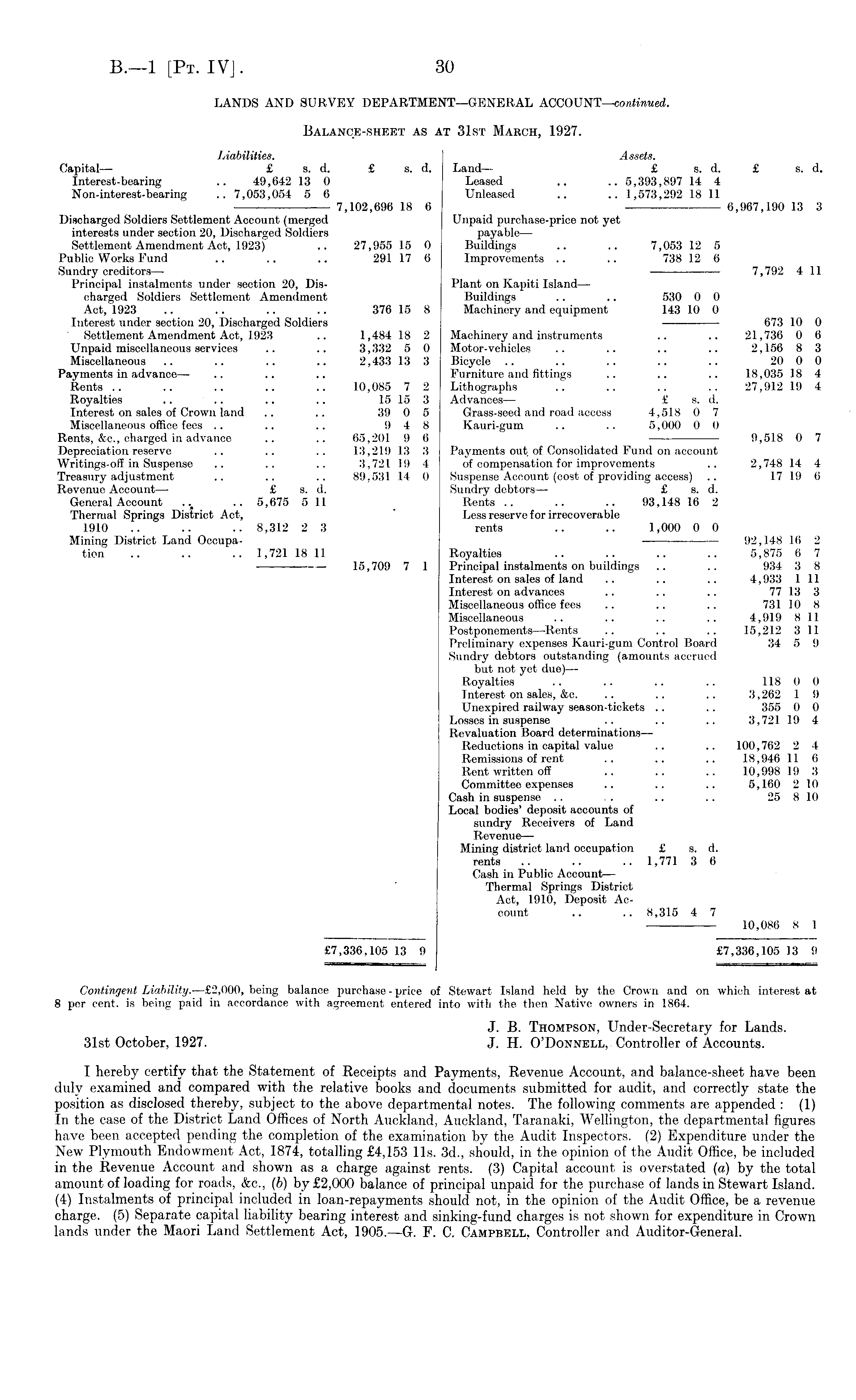 LANDS AND SURVEY DEPARTMENT—GENERAL ACCOUNT—continued. Balance-sheet as at 31st March, 1927. Liabilities. Assets. Capital— £ s. d. £ s. d. Land— £ s. d. £ s. d. Interest-bearing .. 49,642 13 0 Leased .. .. 5,393,897 14 4 Non-interest-bearing .. 7,053,054 5 6 Unleased .. .. 1,573,292 18 11 7,102,696 18 6 6,967,190 13 3 Discharged Soldiers Settlement Account (merged Unpaid purchase-price not yet interests under section 20, Discharged Soldiers payable— Settlement Amendment Act, 1923) .. 27,955 15 0 Buildings .. .. 7,053 12 5 Public Works Fund .. .. .. 291 17 6 Improvements .. .. 738 12 6 Sundry creditors— 7,792 4 11 Principal instalments under section 20, Dis- Plant on Kapiti Island— charged Soldiers Settlement Amendment Buildings .. .. 530 0 0 Act, 1923 .. .. .. .. 376 15 8 Machinery and equipment 143 10 0 Interest under section 20, Discharged Soldiers 673 10 0 Settlement Amendment Act, 1923 .. 1,484 18 2 Machinery and instruments .. .. 21,736 0 6 Unpaid miscellaneous services .. .. 3,332 5 0 Motor-vehicles .. .. .. .. 2,156 8 3 Miscellaneous .. .. .. .. 2,433 13 3 Bicycle .. .. .. .. .. 20 0 0 Payments in advance— .. .. .. Furniture and fittings .. .. .. 18,035 18 4 Rents .. .. .. .. .. 10,085 7 2 Lithographs .. .. .. .. 27,912 19 4 Royalties .. .. .. .. 15 15 3 Advances — £ s. d. Interest on sales of Crown land .. .. 39 0 5 Grass-seed and road access 4,518 0 7 Miscellaneous office fees .. .. ... 9 4 8 Kauri-gum .. .. 5,000 0 0 Rents, &c., charged in advance .. .. 65,201 9 6 9,518 0 7 Depreciation reserve .. .. .. 13,219 13 3 Payments out of Consolidated Fund on account Writings-off in Suspense .. .. .. 3,721 19 4 of compensation for improvements .. 2,748 14 4 Treasury adjustment .. .. .. 89,531 14 0 Suspense Account (cost of providing access) .. 17 19 6 Revenue Account — £ s. d. Sundry debtors — £ s. d. General Account ... 5,675 511 Rents .. .. .. 93,148 16 2 Thermal Springs District Act, * Less reserve for irrecoverable 1910 .. .. .. 8,312 2 3 rents .. .. 1,000 0 0 Mining District Land Occupa- 92,148 16 2 tion .. .. .. 1,721 18 11 Royalties .. .. .. .. 5,875 6 7 15,709 7 1 Principal instalments on buildings .. .. 934 3 8 Interest on sales of land .. .. .. 4,933 111 Interest on advances .. .. .. 77 13 3 Miscellaneous office fees .. .. .. 731 10 8 Miscellaneous .. .. .. .. 4,919 8 11 Postponements—Rents .. .. .. 15,212 311 Preliminary expenses Kauri-gum Control Board 34 5 9 Sundry debtors outstanding (amounts accrued but not yet due) — Royalties .. .. .. .. 118 0 0 Interest on sales, &c. .. .. .. 3,262 1 9 Unexpired railway season-tickets .. .. 355 0 0 Losses in suspense .. .. .. 3,721 19 4 Revaluation Board determinations— Reductions in capital value .. .. 100,762 2 4 Remissions of rent .. .. .. 18,946 11 6 Rent written off .. .. .. 10,998 19 3 Committee expenses .. .. .. 5,160 210 Cash in suspense .. . . .. .. 25 8 10 Local bodies' deposit accounts of sundry Receivers of Land Revenue — Mining district land occupation £ s. d. rents .. .. .. 1,771 3 6 Cash in Public Account— Thermal Springs District Act, 1910, Deposit Account .. .. 8,315 4 7 10,086 8 1 £7,336,105 13 9 £7,336,105 13 9 Contingent Liability.—£2,ooo, being balance purchase - price of Stewart Island held by the Crown and on which interest at 8 per cent, is being paid in accordance with agreement entered into with the then Native owners in 1864. J. B. Thompson, Under-Secretary for Lands. 31st October, 1927. J. H. O'Donnell, Controller of Accounts. I hereby certify that the Statement of Receipts and Payments, Revenue Account, and balance-sheet have been duly examined and compared with the relative books and documents submitted for audit, and correctly state the position as disclosed thereby, subject to the above departmental notes. The following comments are appended : (1) In the case of the District Land Offices of North Auckland, Auckland, Taranaki, Wellington, the departmental figures have been accepted pending the completion of the examination by the Audit Inspectors. (2) Expenditure under the New Plymouth Endowment Act, 1874, totalling £4,153 lis. 3d., should, in the opinion of the Audit Office, be included in the Revenue Account and shown as a charge against rents. (3) Capital account is overstated (a) by the total amount of loading for roads, &c., (b) by £2,000 balance of principal unpaid for the purchase of lands in Stewart Island. (4) Instalments of principal included in loan-repayments should not, in the opinion of the Audit Office, be a revenue charge. (5) Separate capital liability bearing interest and sinking-fund charges is not shown for expenditure in Crown lands under the Maori Land Settlement Act, 1905.— G. F. C. Campbell, Controller and Auditor-General.