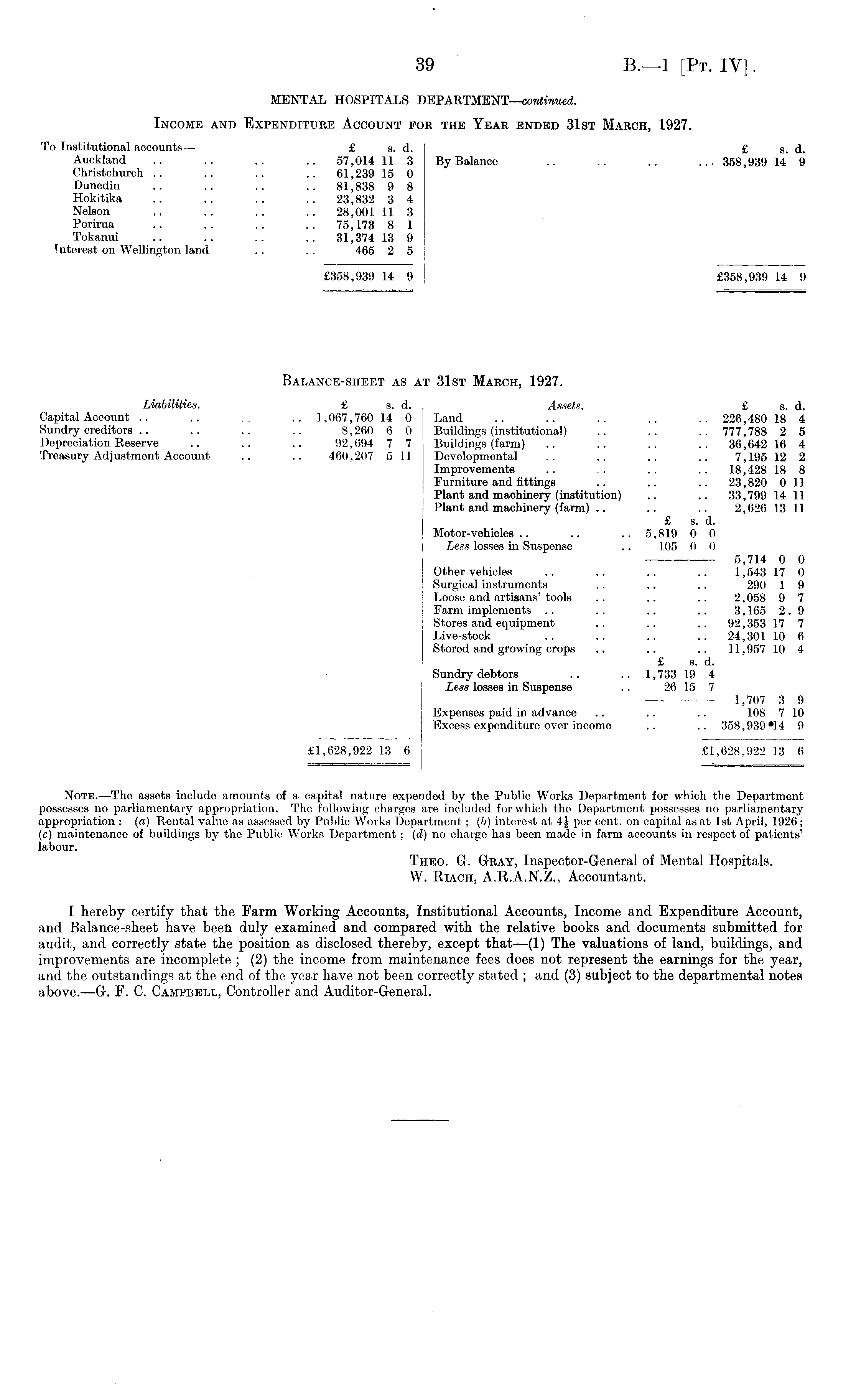 MENTAL HOSPITALS DEPARTMENT—continued. Income and Expenditure Account fob the Year ended 31st March, 1927. To Institutional accounts— £ s. d. £ s. d. Auckland .. .. .. .. 57,014 11 3 By Balance .. .. .. ... 358,939 14 9 Christchurch .. .. .. .. 61,239 15 0 Dunedin .. .. .. .. 81,838 9 8 Hokitika .. .. .. .. 23,832 3 4 Nelson .. .. .. .. 28,001 11 3 Porirua .. .. .. .. 75,173 8 1 Tokanui .. .. .. .. 31,374 13 9 Interest on Wellington land .. .. 465 2 5 £358,939 14 9 £358,939 14 9 Balance-sheet as at 31st March, 1927. Liabilities. £ s. d. Assets. £ s. d. Capital Account .. .. .. 1,067,760 14 0 Land .. .. .. .. .. 226,480 18 4 Sundry creditors .. .. .. .. 8,260 6 0 Buildings (institutional) .. .. .. 777,788 2 5 Depreciation Reserve .. .. .. 92,694 7 7 Buildings (farm) .. .. .. .. 36,642 16 4 Treasury Adjustment Account .. .. 460,207 511 Developmental .. .. .. .. 7,195 12 2 Improvements .. . . . .. 18,428 18 8 Furniture and fittings .. .. .. 23,820 0 11 Plant and machinery (institution) .. .. 33,799 14 11 Plant and machinery (farm) .. .. .. 2,626 13 11 £ s. d. j Motor-vehicles .. .. .. 5,819 0 0 j Less losses in Suspense .. 105 0 0 5,714 0 0 Other vehicles .. .. .. .. 1,543 17 0 Surgical instruments .. .. .. 290 1 9 Loose and artisans'tools .. .. .. 2,058 9 7 Farm implements .. .. .. .. 3,165 2. 9 Stores and equipment .. .. .. 92,353 17 7 Live-stock .. .. .. .. 24,301 10 6 Stored and growing crops .. .. .. 11,957 10 4 £ s. d. Sundry debtors .. .. 1,733 19 4 Less losses in Suspense .. 26 15 7 1,707 3 9 Expenses paid in advance .. .. .. 108 710 Excess expenditure over income .. .. 358,939 *14 9 £1,628,922 13 6 j £1,628,922 13 6 Note. —The assets include amounts of a capital nature expended by the Public Works Department for which the Department possesses no parliamentary appropriation. The following charges are included for which the Department possesses no parliamentary appropriation : (a) Rental value as assessed by Public Works Department; (b) interest at 4£ per cent, on capital as at Ist April, 1926; (c) maintenance of buildings by the Public Works Department; (d) no charge has been made in farm accounts in respect of patients' labour. Theo. G. Gray, Inspector-General of Mental Hospitals. W. Riach, A.R.A.N.Z., Accountant. I hereby certify that the Farm Working Accounts, Institutional Accounts, Income and Expenditure Account, and Balance-sheet have been duly examined and compared with the relative books and documents submitted for audit, and correctly state the position as disclosed thereby, except that —(1) The valuations of land, buildings, and improvements are incomplete ; (2) the income from maintenance fees does not represent the earnings for the year, and the outstandings at the end of the year have not been correctly stated ; and (3) subject to the departmental notes above. —G. F. C. Campbell, Controller and Auditor-General.