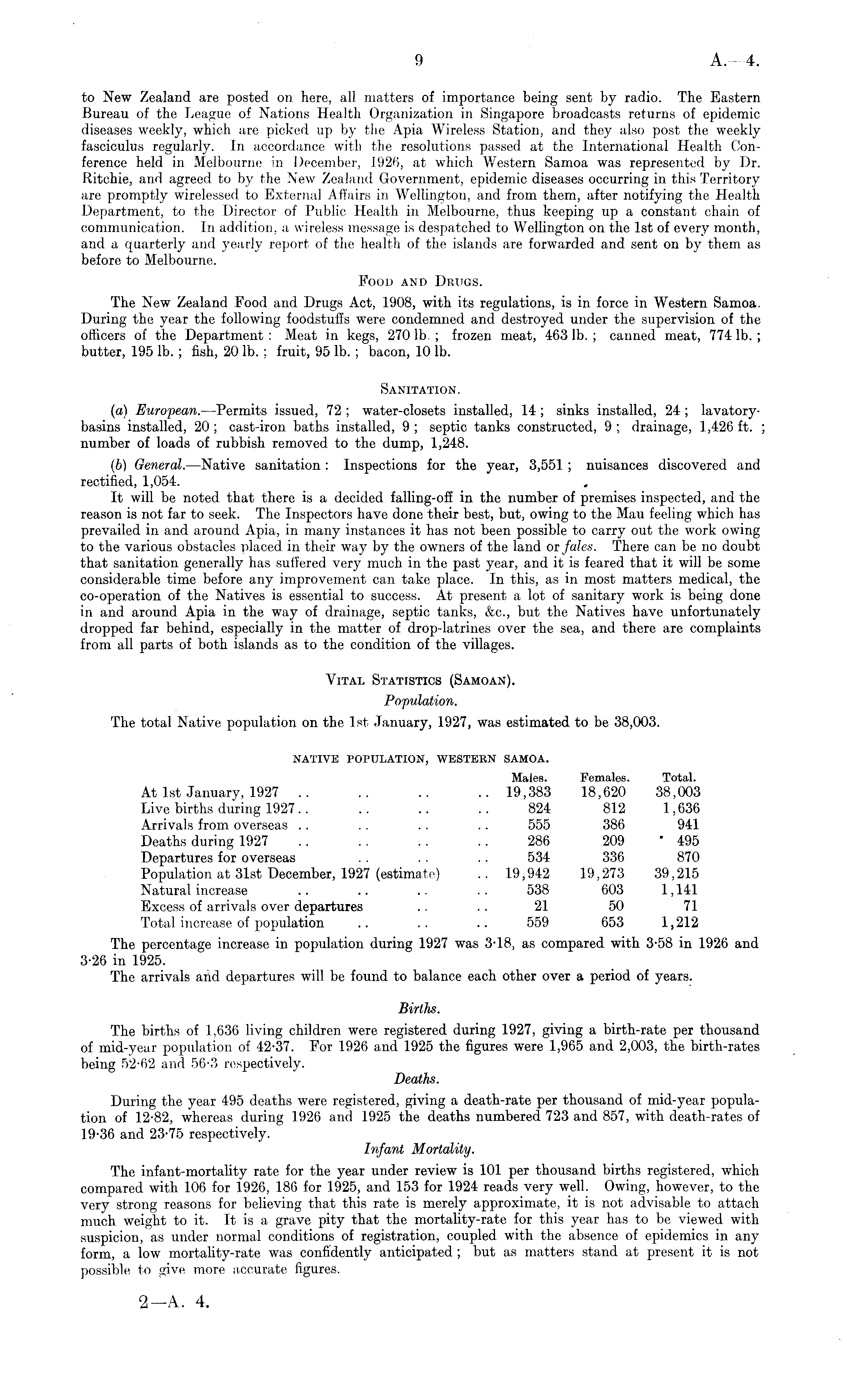 to New Zealand are posted on here, all matters of importance being sent by radio. The Eastern Bureau of the League of Nations Health Organization in Singapore broadcasts returns of epidemic diseases weekly, which are picked up by the Apia Wireless Station, and they also post the weekly fasciculus regularly. In accordance with the resolutions passed at the International Health Conference held in Melbourne in December, 1926, at which Western Samoa was represented by Dr. Ritchie, and agreed to by the New Zealand Government, epidemic diseases occurring in this Territory are promptly wirelessed to External Affairs in Wellington, and from them, after notifying the Health Department, to the Director of Public Health in Melbourne, thus keeping up a constant chain of communication. In addition, a wireless message is despatched to Wellington on the Ist of every month, and a quarterly and yearly report of the health of the islands are forwarded and sent on by them as before to Melbourne. Food and Drugs. The New Zealand Food and Drugs Act, 1908, with its regulations, is in force in Western Samoa. During the year the following foodstuffs were condemned and destroyed under the supervision of the officers of the Department: Meat in kegs, 270 lb. ; frozen meat, 463 lb. ; canned meat, 774 lb. ; butter, 195 lb.; fish, 20 lb. ; fruit, 95 lb. ; bacon, 10 lb. Sanitation. (a) European. —Permits issued, 72 ; water-closets installed, 14; sinks installed, 24 ; lavatorybasins installed, 20; cast-iron baths installed, 9; septic tanks constructed, 9; drainage, 1,426 ft. ; number of loads of rubbish removed to the dump, 1,248. (b) General. —Native sanitation : Inspections for the year, 3,551 ; nuisances discovered and rectified, 1,054. It will be noted that there is a decided falling-off in the number of premises inspected, and the reason is not far to seek. The Inspectors have done their best, but, owing to the Mau feeling which has prevailed in and around Apia, in many instances it has not been possible to carry out the work owing to the various obstacles placed in their way by the owners of the land ov fales. There can be no doubt that sanitation generally has suffered very much in the past year, and it is feared that it will be some considerable time before any improvement can take place. In this, as in most matters medical, the co-operation of the Natives is essential to success. At present a lot of sanitary work is being done in and around Apia in the way of drainage, septic tanks, &c., but the Natives have unfortunately dropped far behind, especially in the matter of drop-latrines over the sea, and there are complaints from all parts of both islands as to the condition of the villages. Vital Statistics (Samoan). Population. The total Native population on the Ist January, 1927, was estimated to be 38,003. NATIVE POPULATION, WESTERN SAMOA. Males. Females. Total. At Ist January, 1927 .. .. .. .. 19,383 18,620 38,003 Live births during 1927.. .. .. .. 824 812 1,636 Arrivals from overseas .. .. .. .. 555 386 941 Deaths during 1927 .. . . . . .. 286 209 " 495 Departures for overseas . . . . .. 534 336 870 Population at 31st December, 1927 (estimate) .. 19,942 19,273 39,215 Natural increase .. .. .. . . 538 603 1,141 Excess of arrivals over departures .. .. 21 50 71 Total increase of population .. .. .. 559 653 1,212 The percentage increase in population during 1927 was 3-18, as compared with 3-58 in 1926 and 3-26 in 1925. The arrivals aiid departures will be found to balance each other over a period of years. Births. The births of 1,636 living children were registered during 1927, giving a birth-rate per thousand of mid-year population of 42-37. For 1926 and 1925 the figures were 1,965 and 2,003, the birth-rates being 52-62 and 56-3 respectively. Deaths. During the year 495 deaths were registered, giving a death-rate per thousand of mid-year population of 12-82, whereas during 1926 and 1925 the deaths numbered 723 and 857, with death-rates of 19-36 and 23-75 respectively. Infant Mortality. The infant-mortality rate for the year under review is 101 per thousand births registered, which compared with 106 for 1926, 186 for 1925, and 153 for 1924 reads very well. Owing, however, to the very strong reasons for believing that this rate is merely approximate, it is not advisable to attach much weight to it. It is a grave pity that the mortality-rate for this year has to be viewed with suspicion, as under normal conditions of registration, coupled with the absence of epidemics in any form, a low mortality-rate was confidently anticipated ; but as matters stand at present it is not possible to give more accurate figures.
